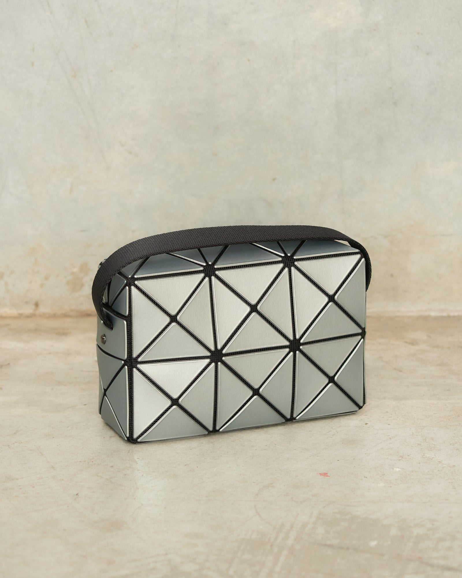 Metallic Cuboid shoulder bag by Bao Bao Issey Miyake in blue. Compact bag with distinct rectangular prism form. Geometric leather-like tiles mounted on a sturdy mesh lining with single top zip. Featuring an adjustable strap that can be extended for crossbody or hand carry wear.