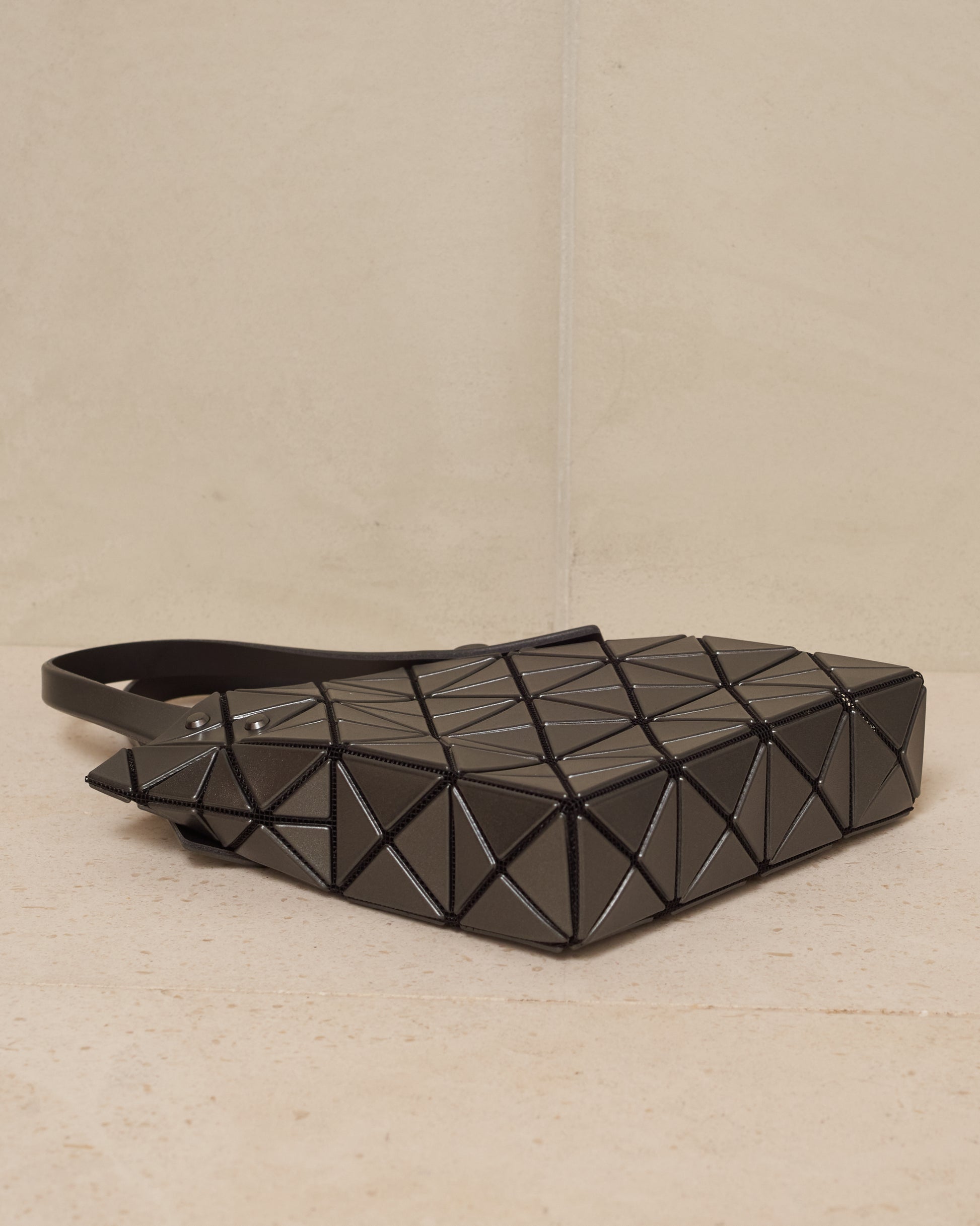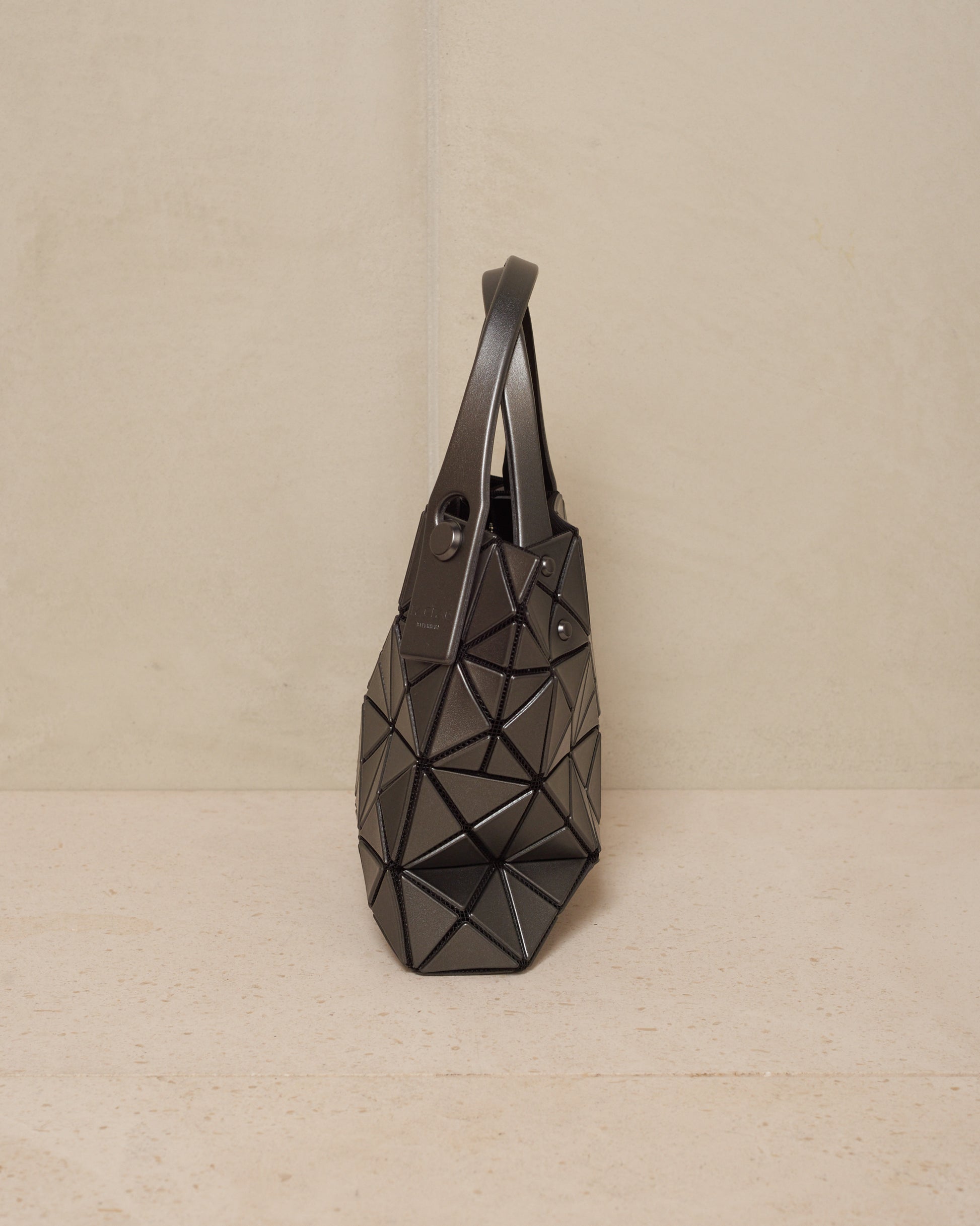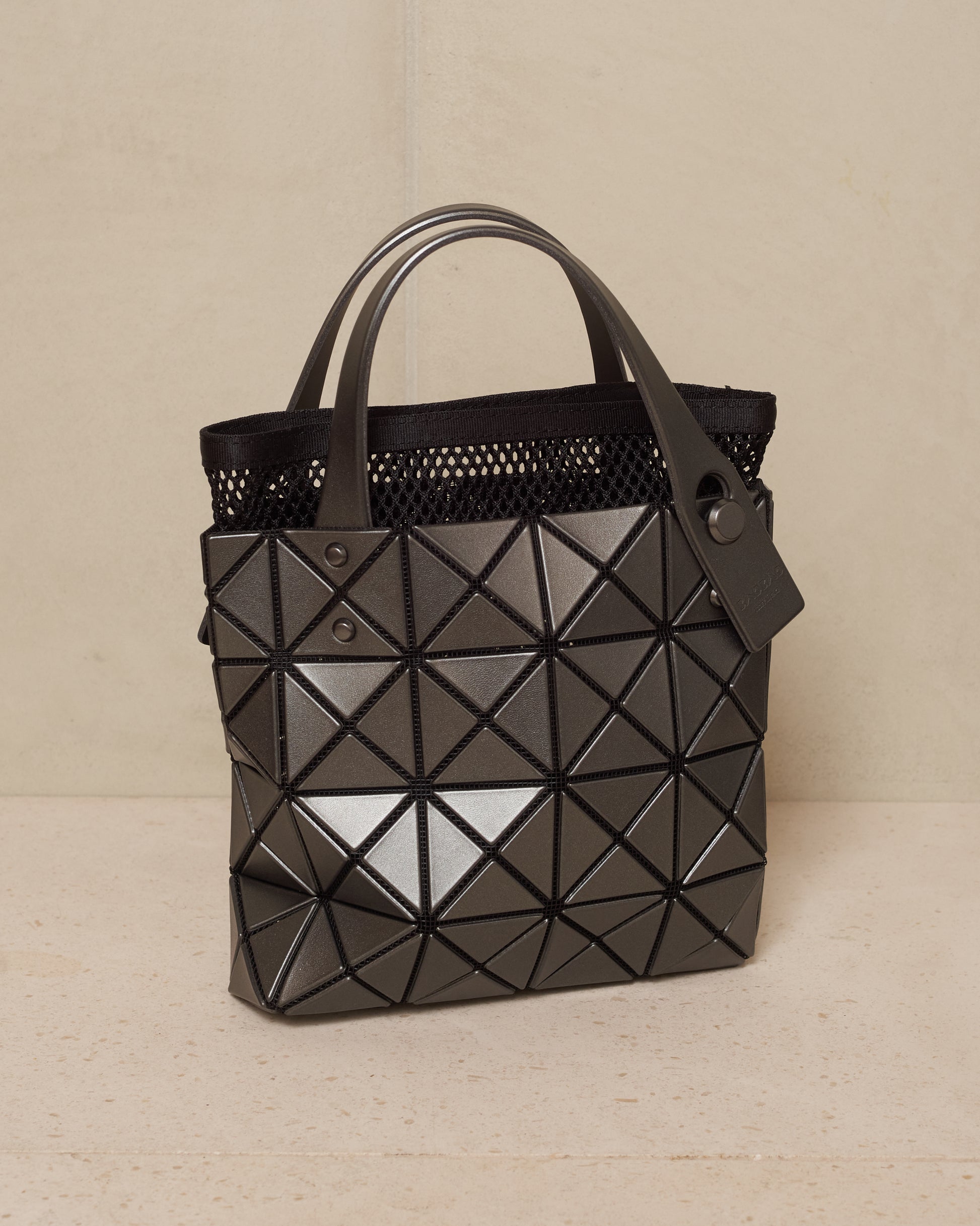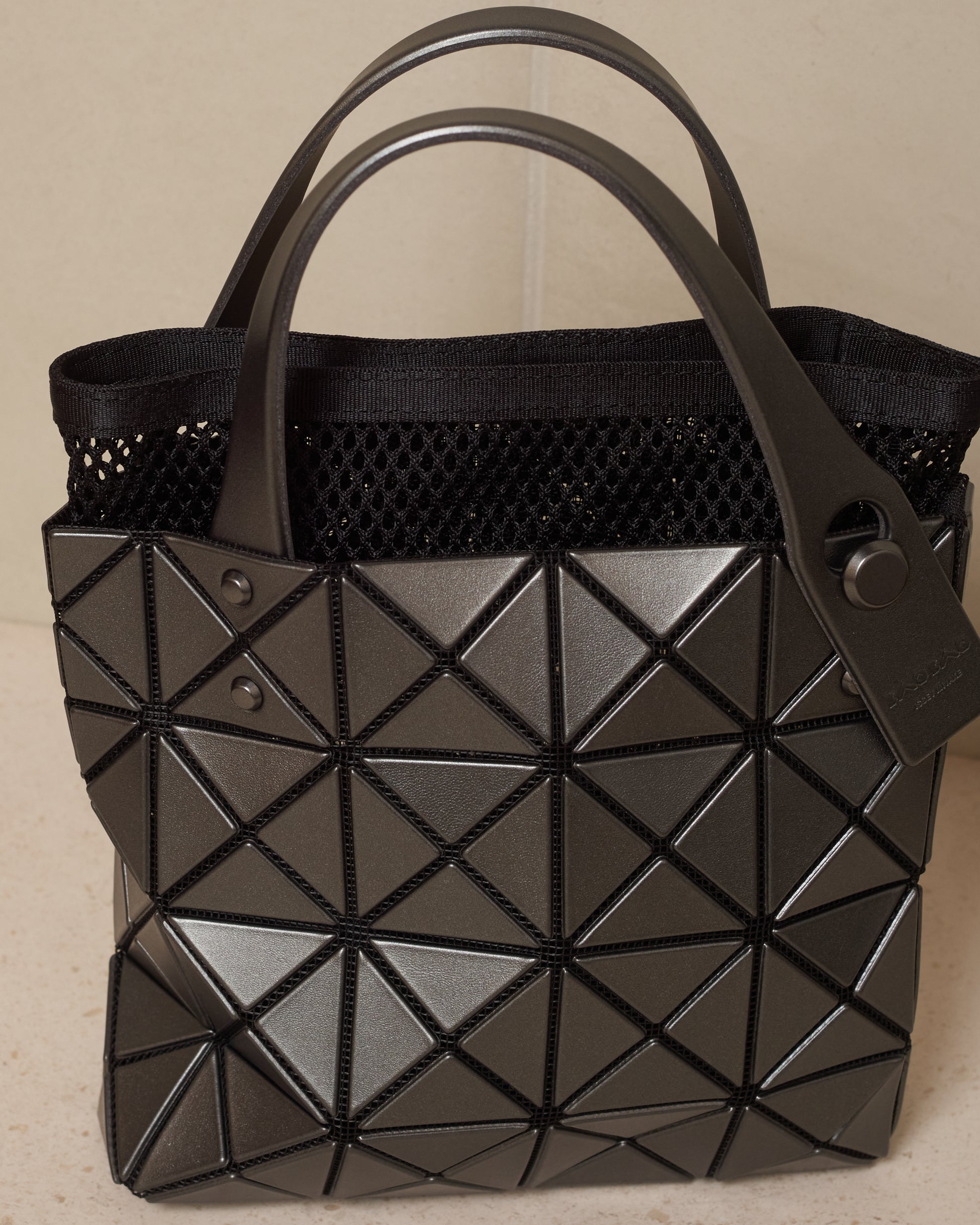 Easy small handbag by Bao Bao Issey Miyake in dark grey. This miniature tote is excellent for holding small valuables and features a mesh panel at the top which can be used to conceal the inner contents. Includes a practical shopping bag which fits perfectly in the inside pocket when folded.