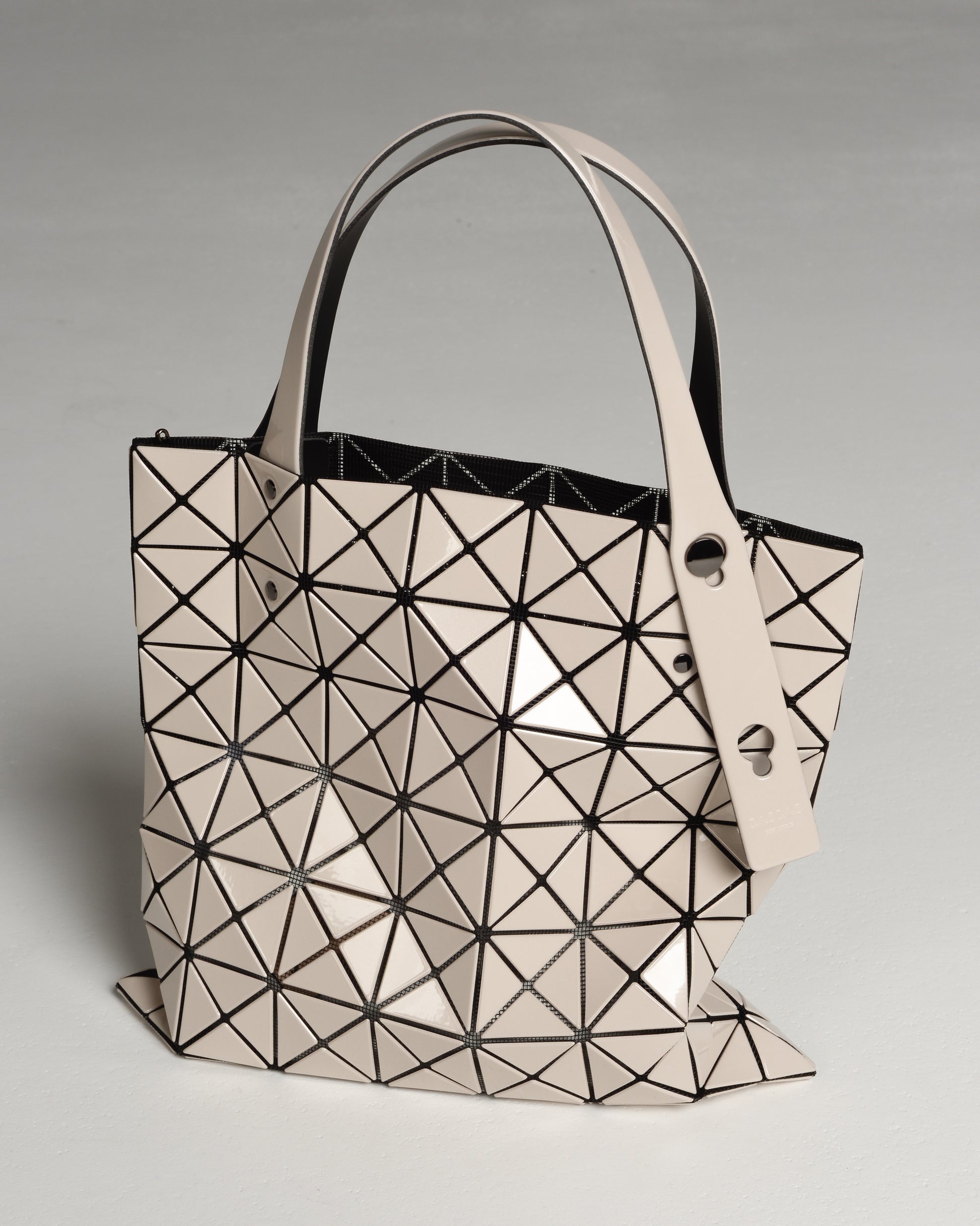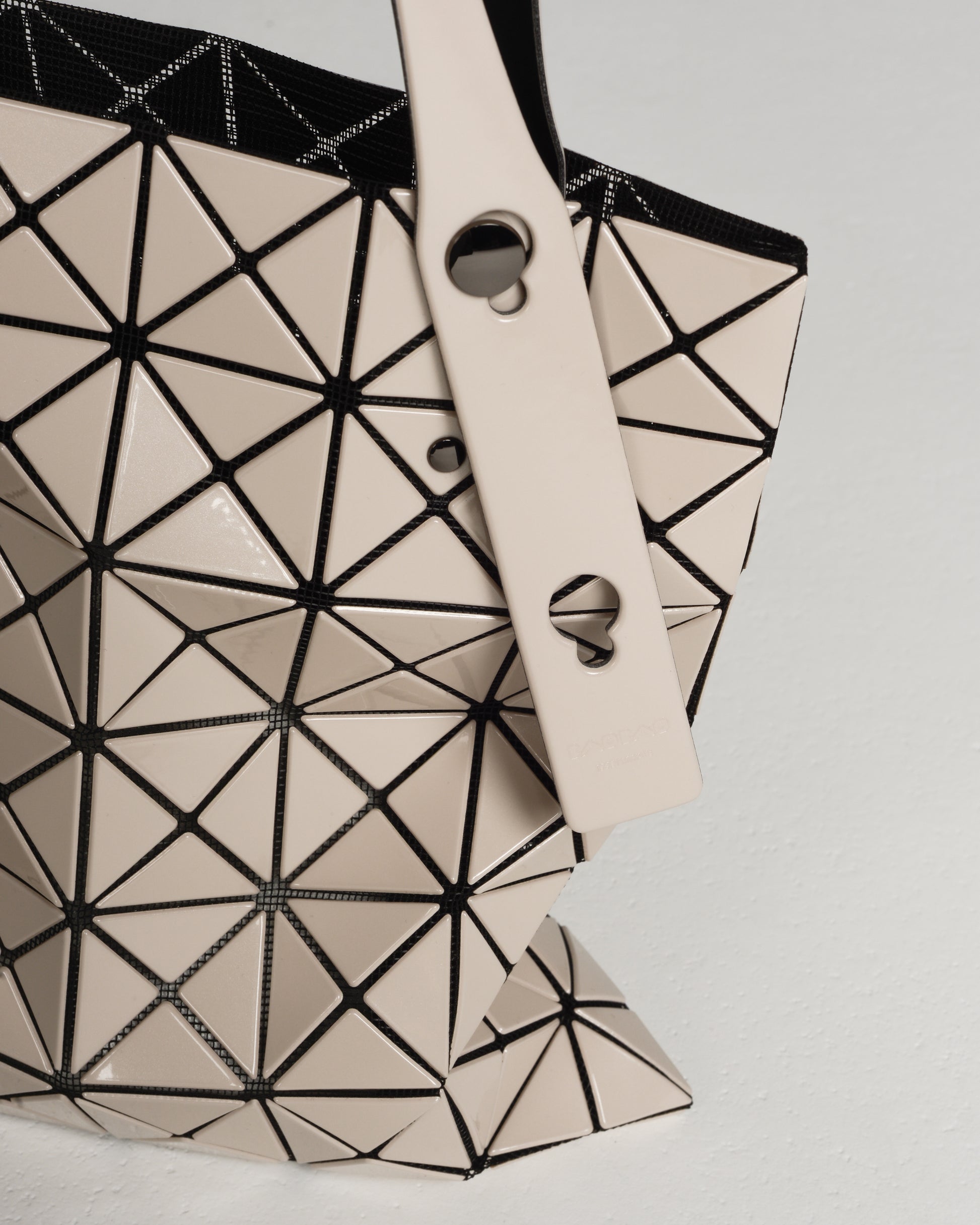 Prism tote bag by Bao Bao Issey Miyake. Glossy beige triangular tiles adhere to a nylon mesh netting to give this compact tote its geometric form and dynamic structure. Adjustable handles and internal zipped pocket.