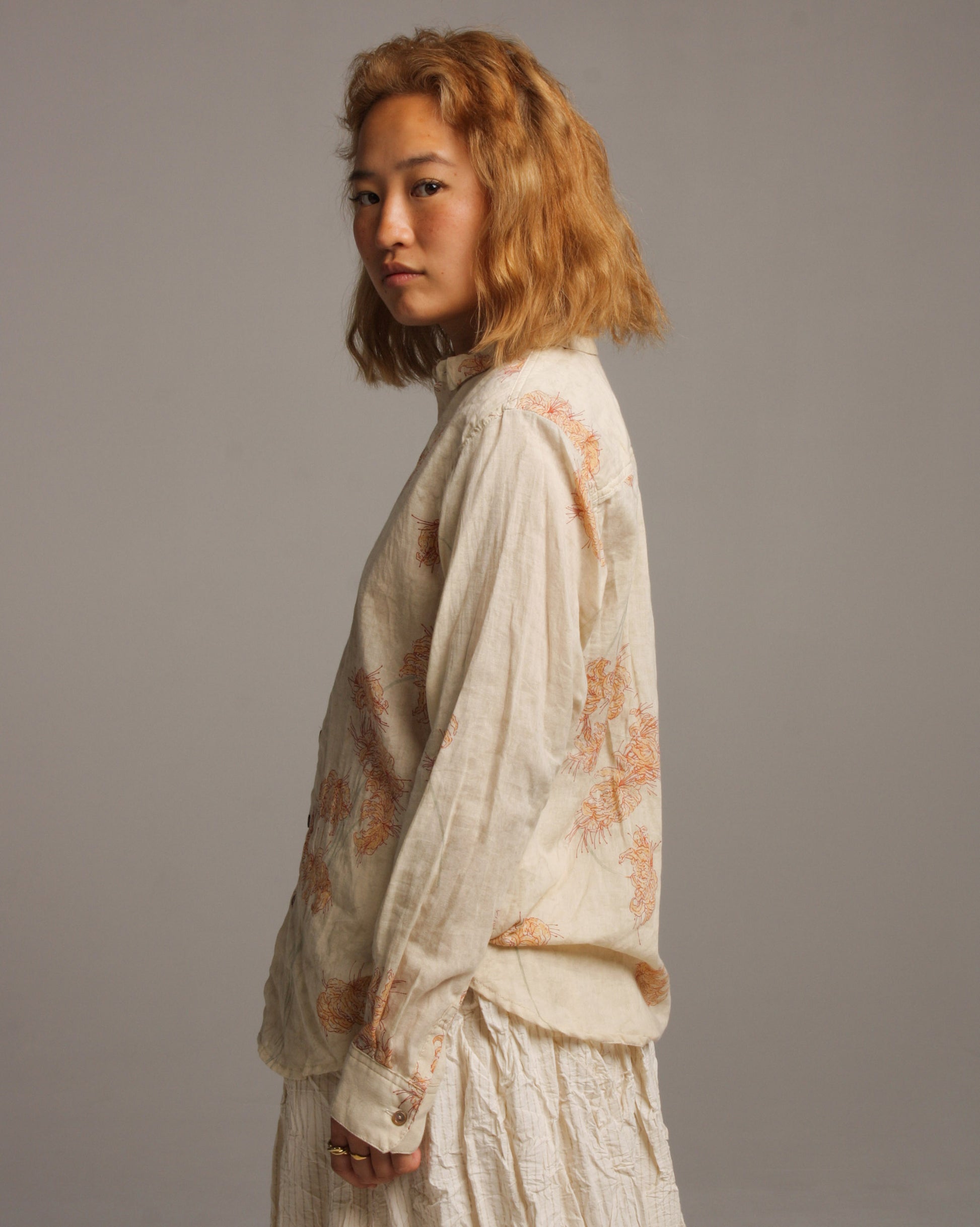 Floral shirt by Pas de Calais in beige. Buttoned shirt with narrow pointed collar, crafted from a delicate cotton gauze. Spider lily floral print in fine lines gently imprints the surface - a symbol of the impending arrival of good luck. Almost sheer fabrication with fine detailing leaves a softened, moody impression.