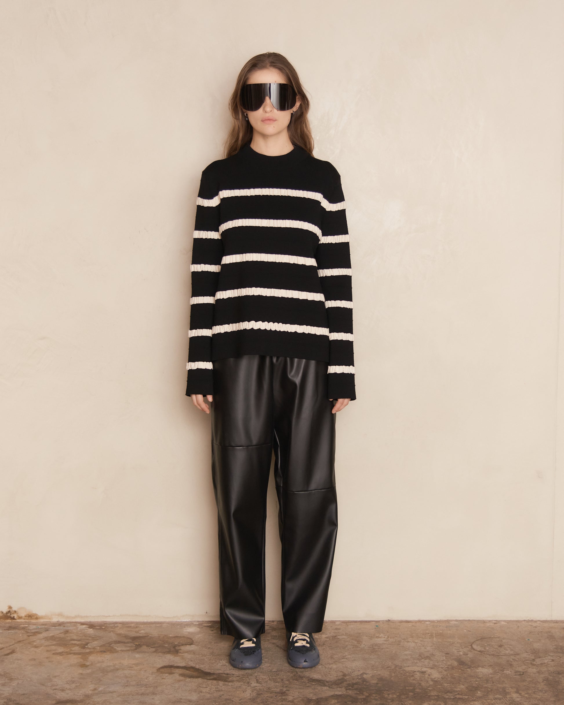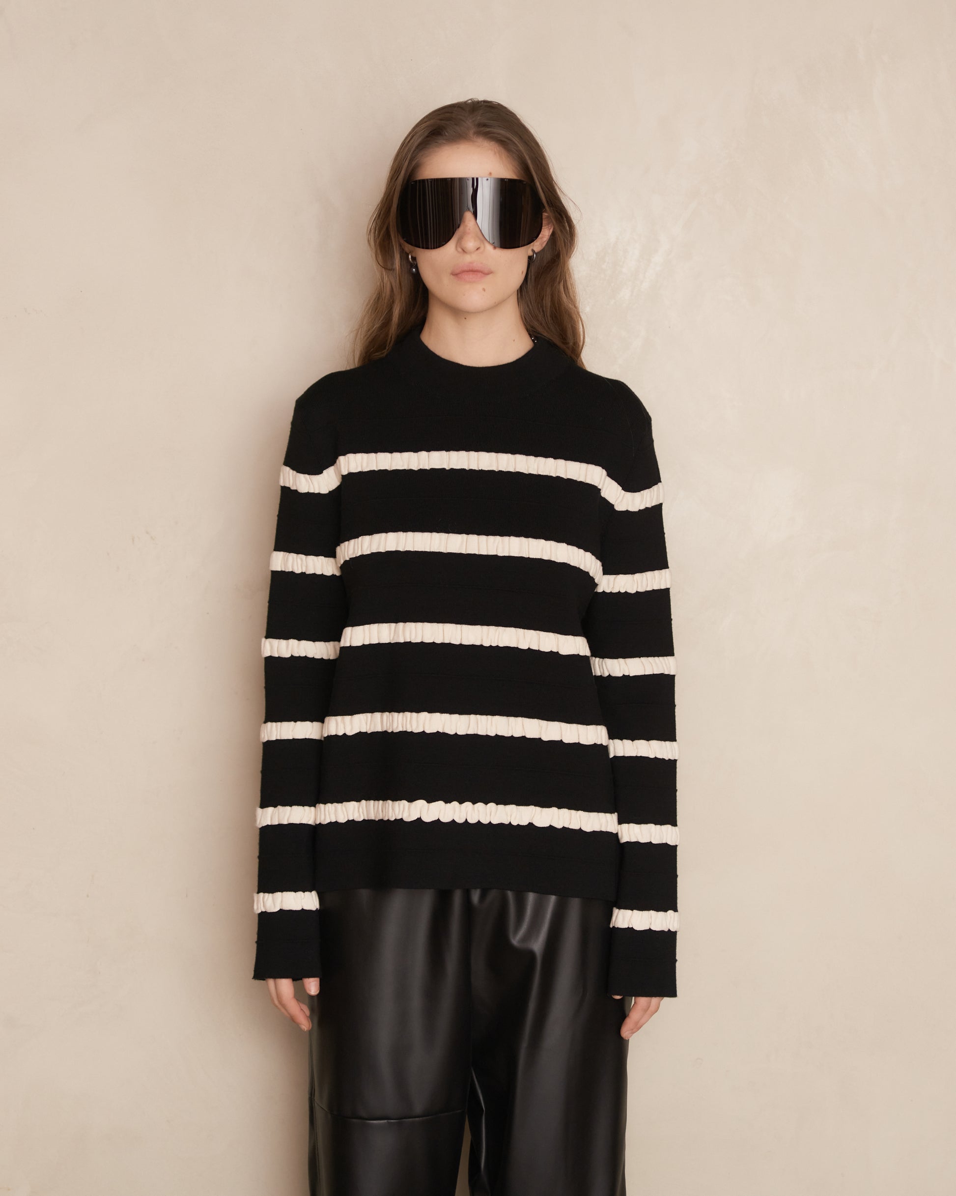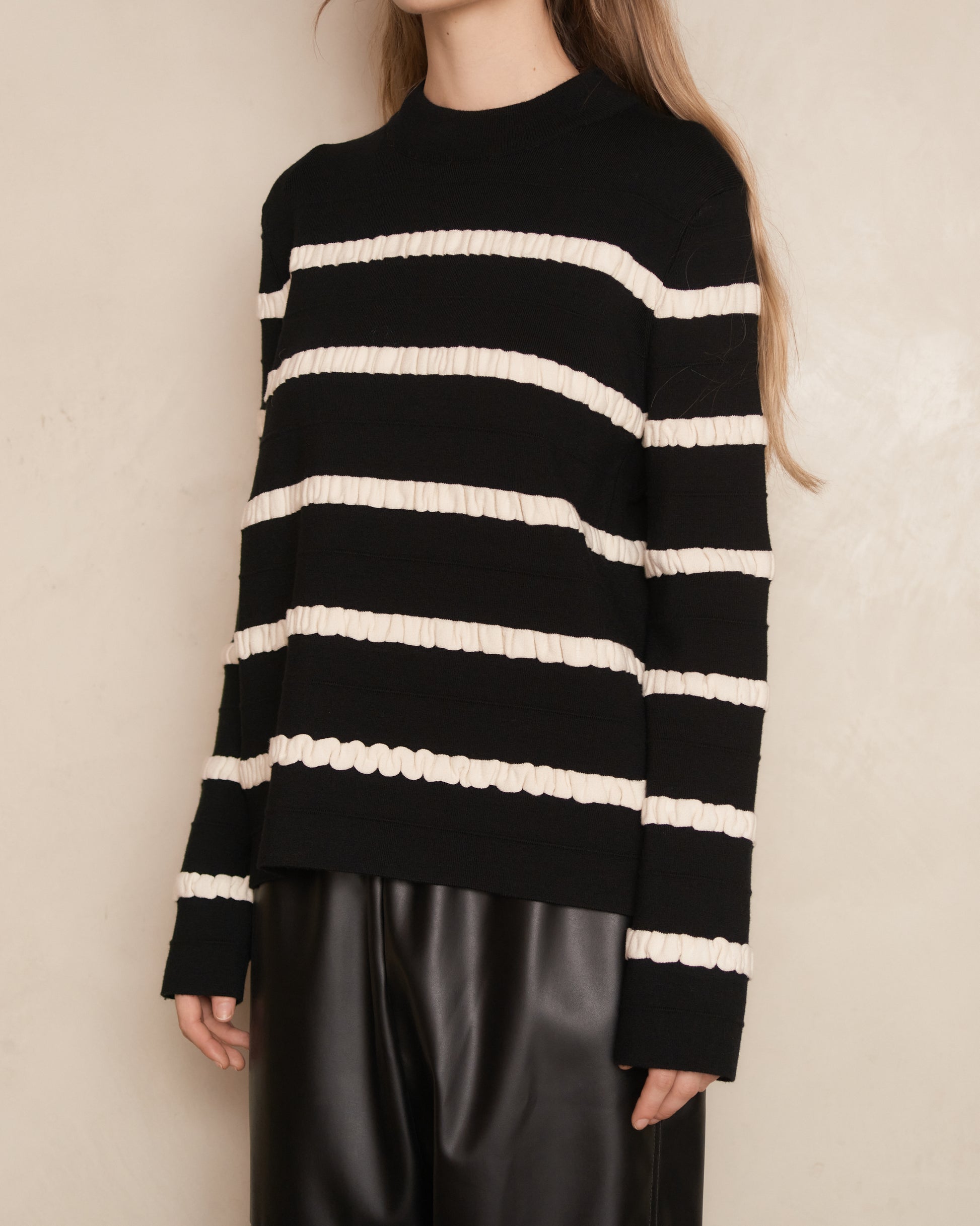 Kadit striped sweater by Christian Wijnants. Crew neck sweater crafted in a virgin wool and cotton blend. Smooth black knit scored with textural striped motif in white.