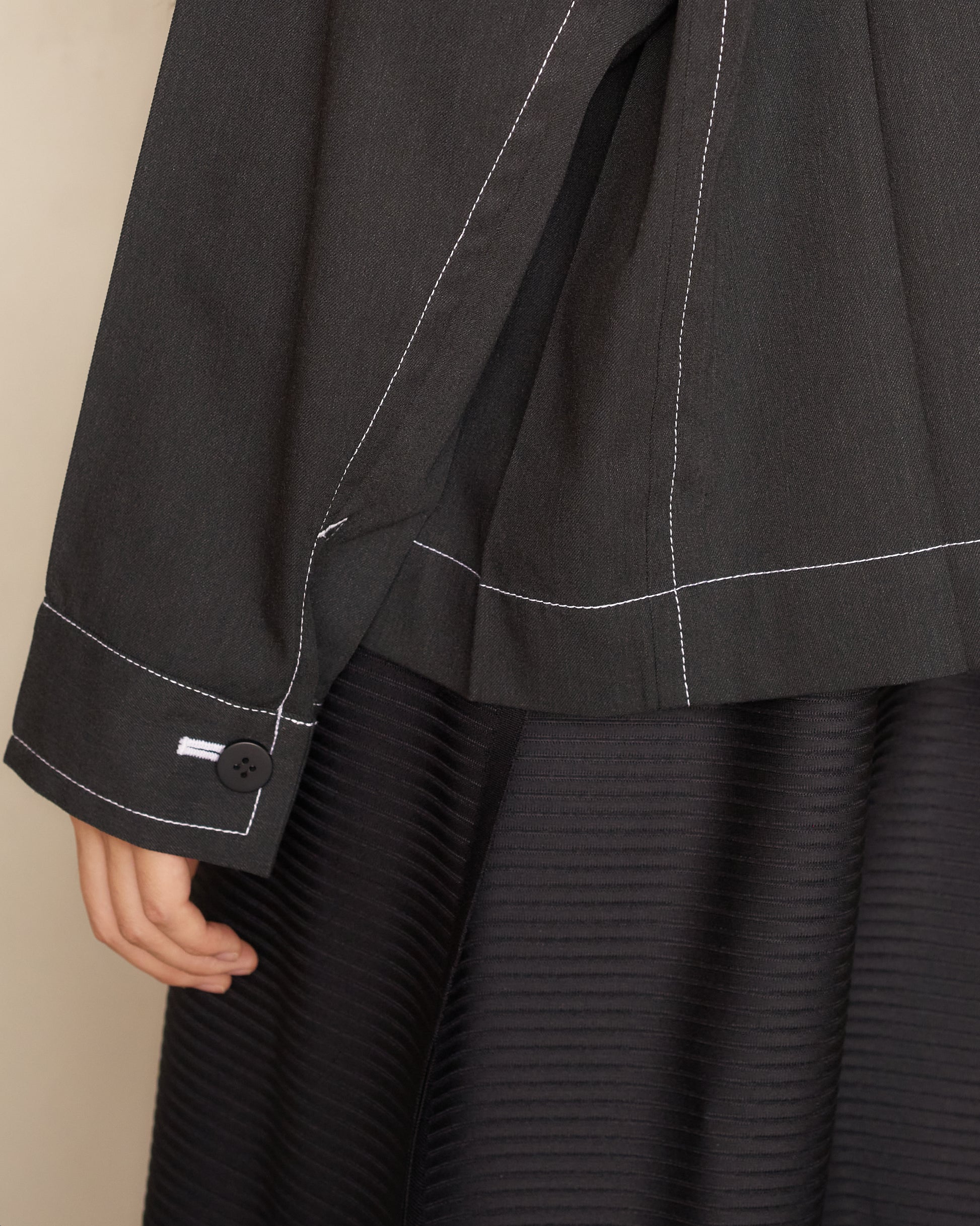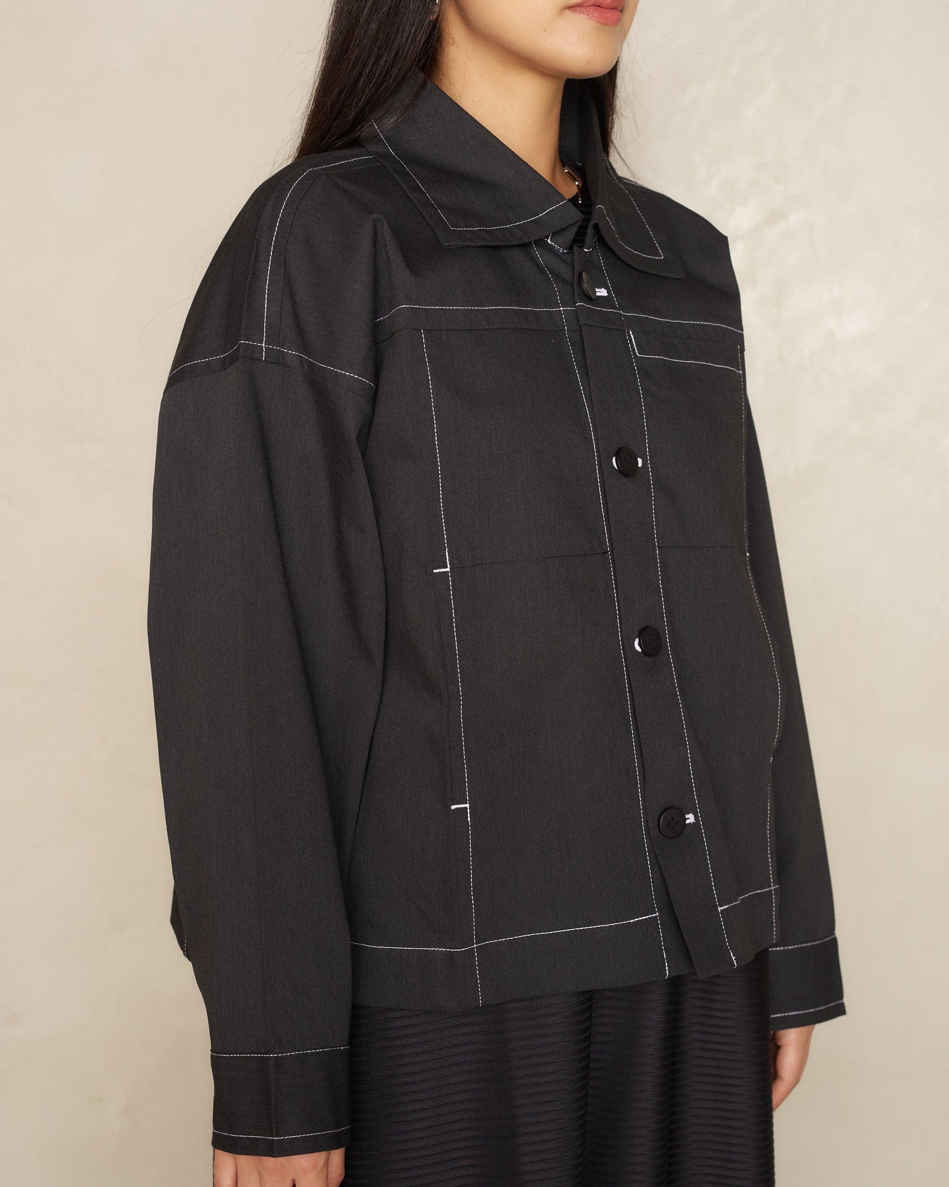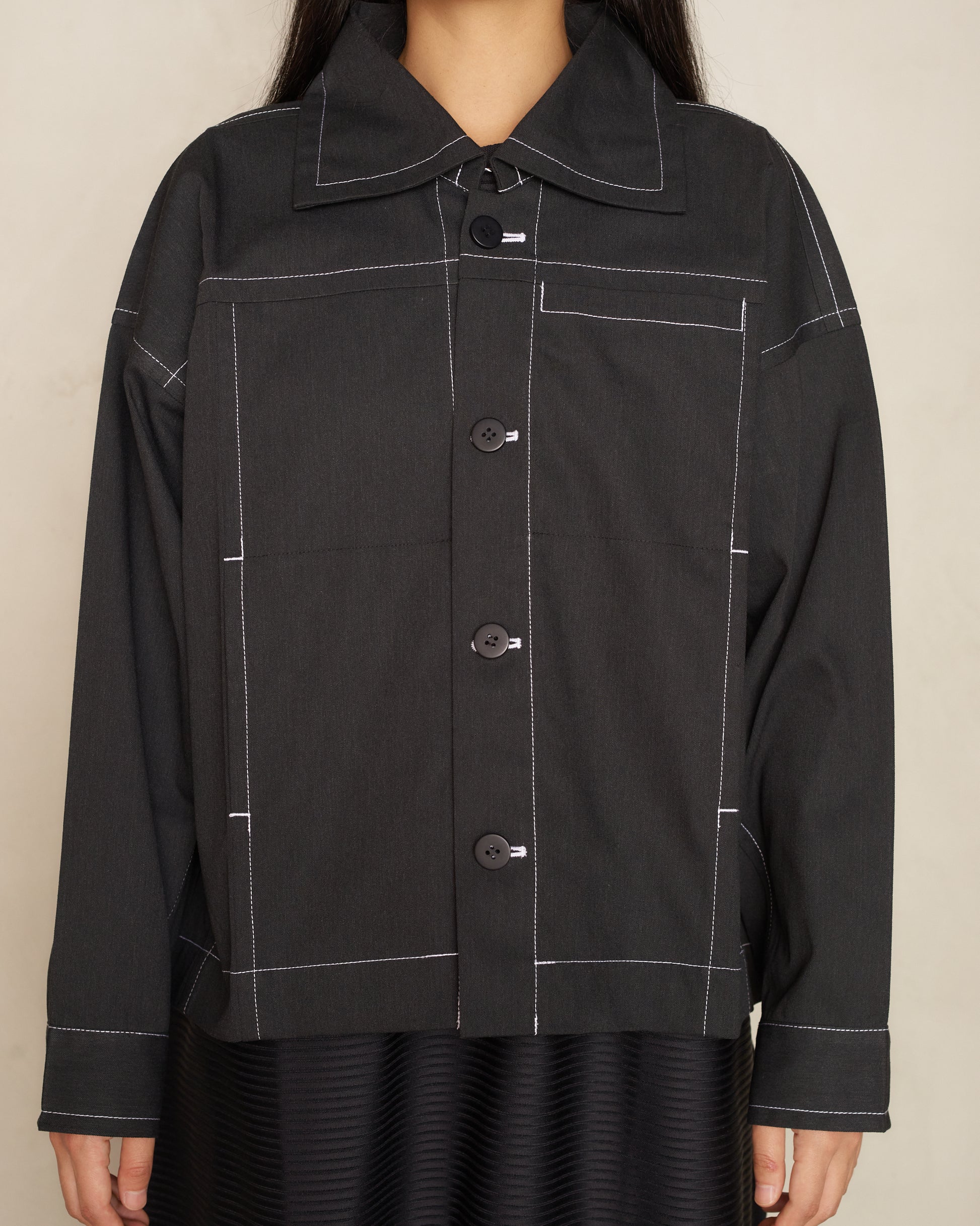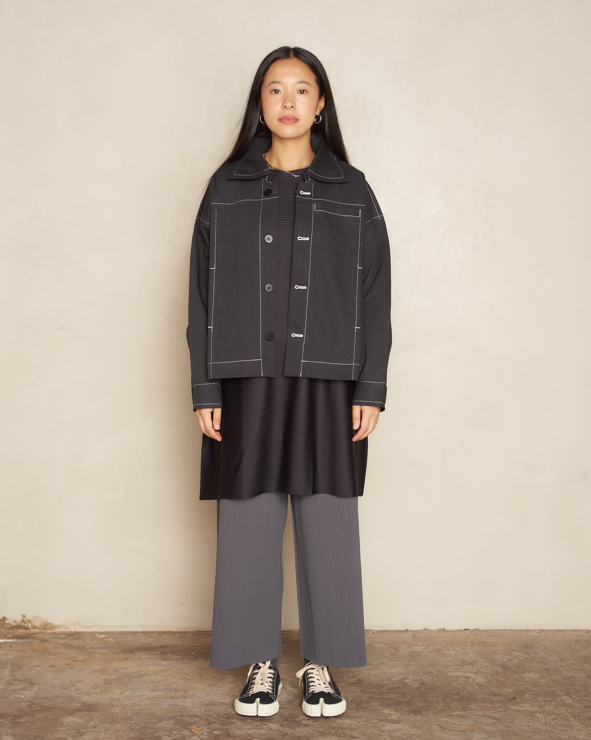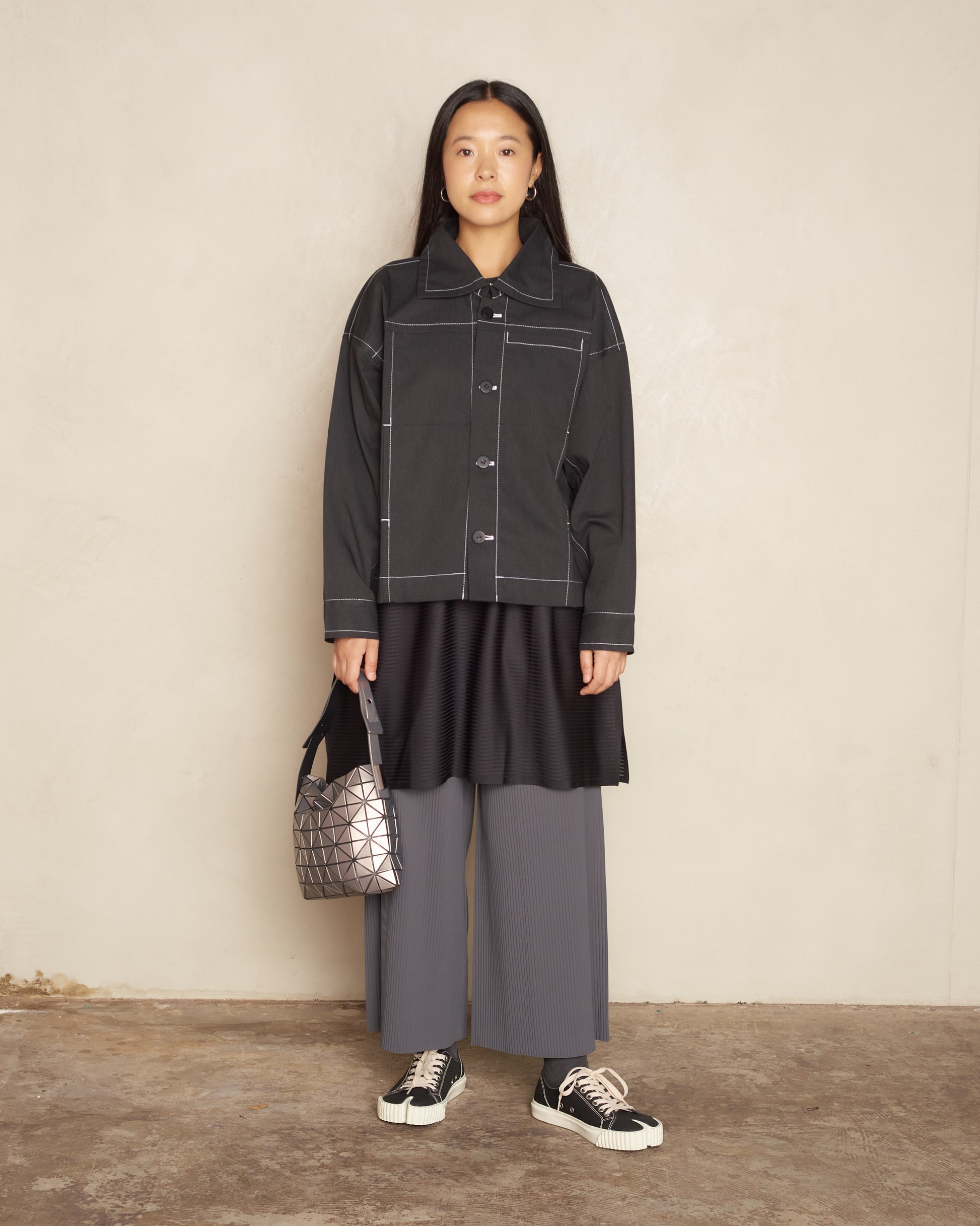 Black denim jacket by Issey Miyake ME. Boxy-fitting cropped jacket with concealed side pockets and contrast stitching. Crafted using recycled polyester thread with the colour mixed at the cotton stage, and washed to create a realistic denim texture. Folds along the creases for easy portability and storage.