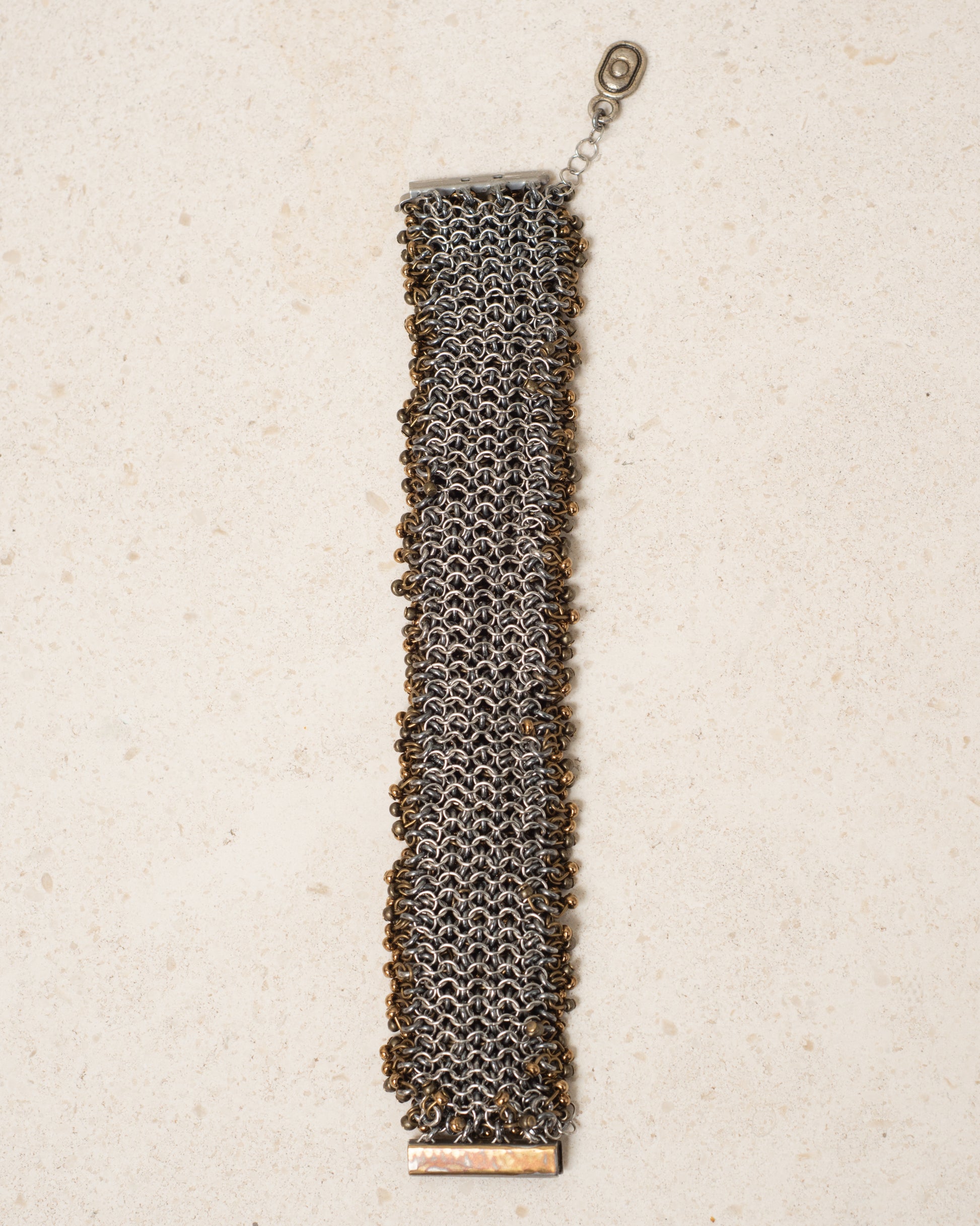 Glass bead bracelet by Jean-François Mimilla. Interlocking stainless steel chains form a wide band with an abundance of loosely pinned brown glass beads attached throughout. Antique clasp closure with ornate pendant attached.