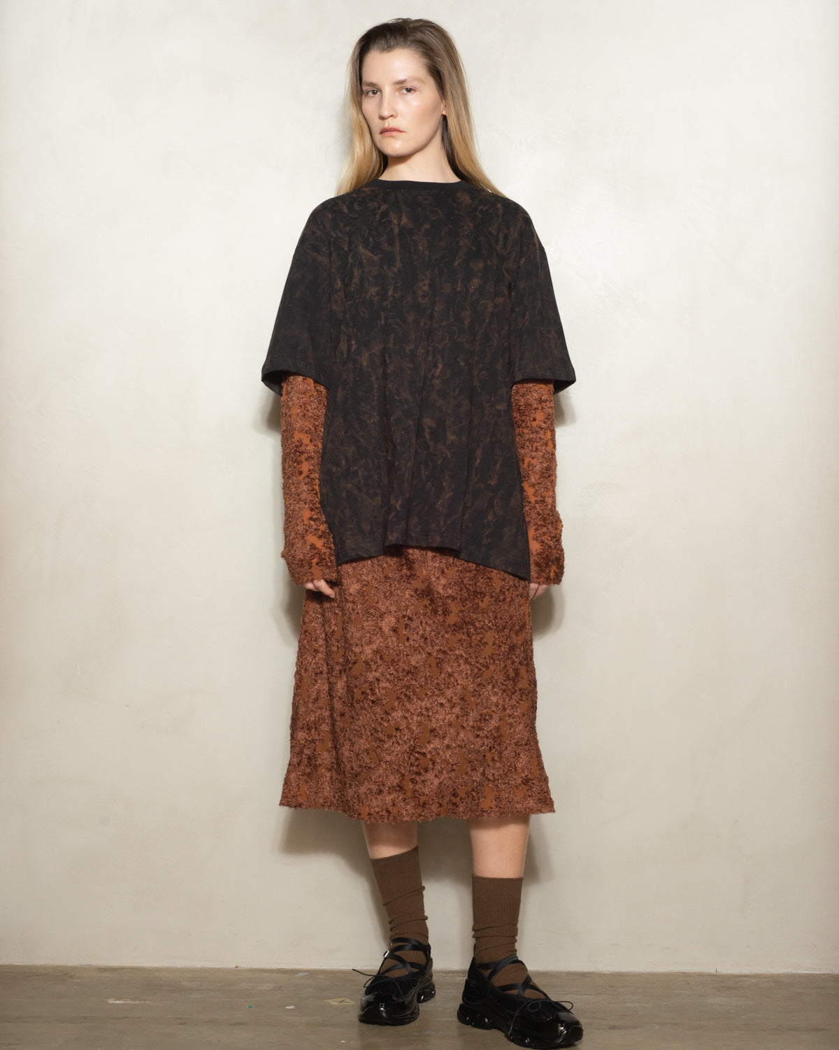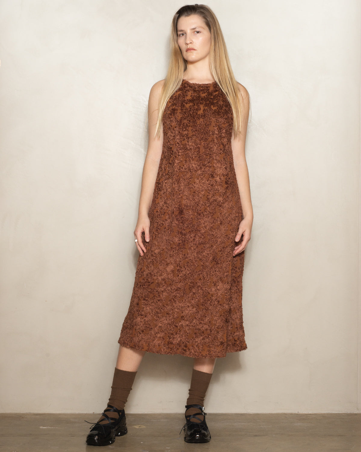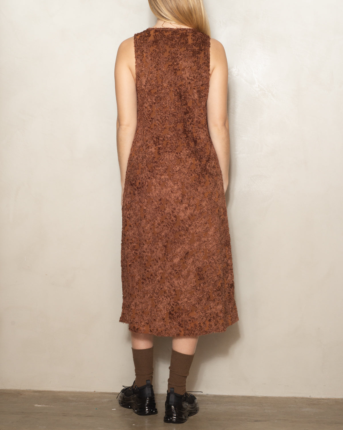 Shaggy sheer tank dress by Song for the Mute in brown. Classic tank dress with mid-length, enhanced with a beguiling shaggy pile mounted on a burnt orange base.