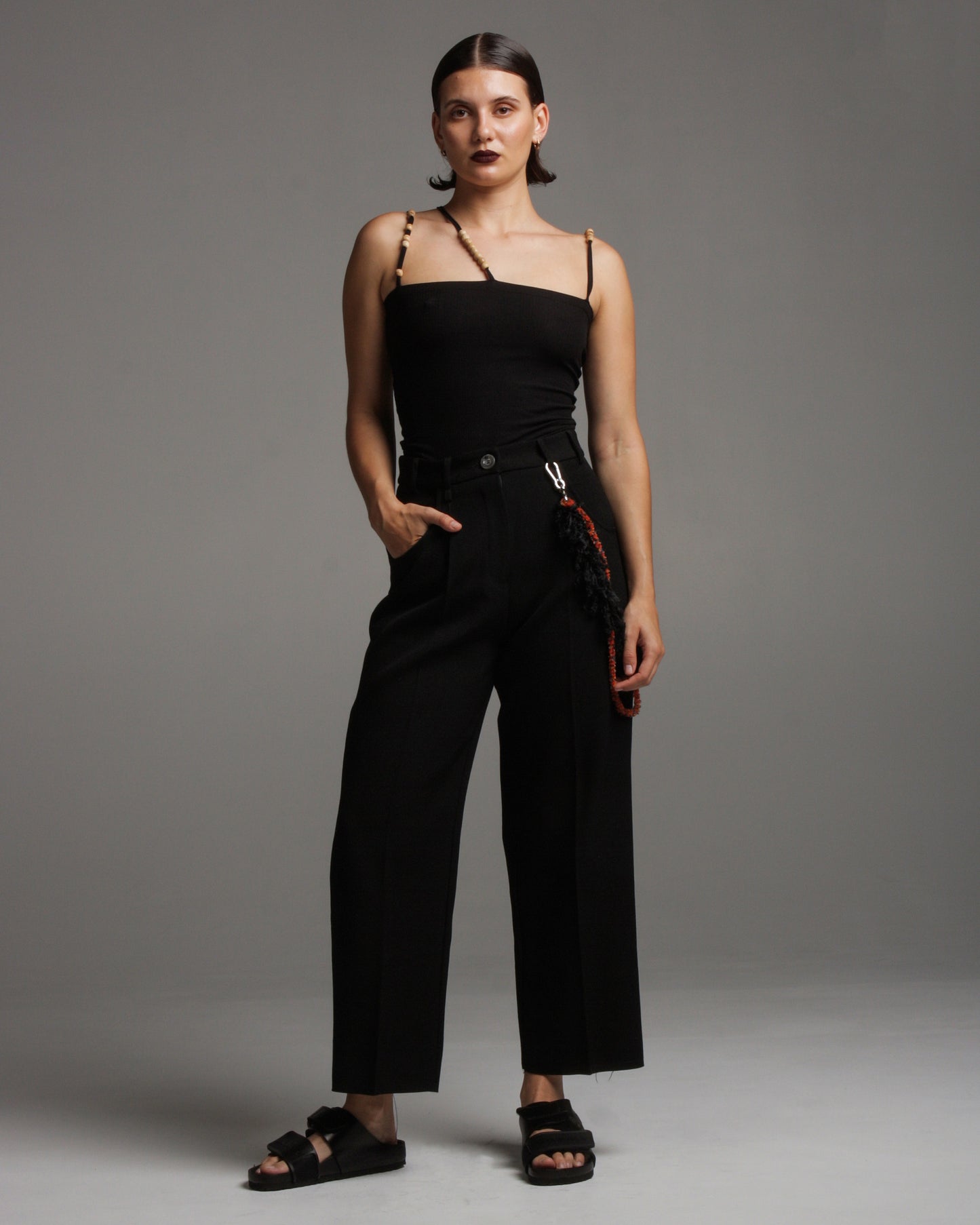 Tav tank by Baserange in black. Designed in fine organic ribbed cotton for a softly fitted style. Thin elasticated straps straddle the shoulders while a third asymmetric strap clinches the neck. Finished with sweet wooden beadwork to further pique curiosity.