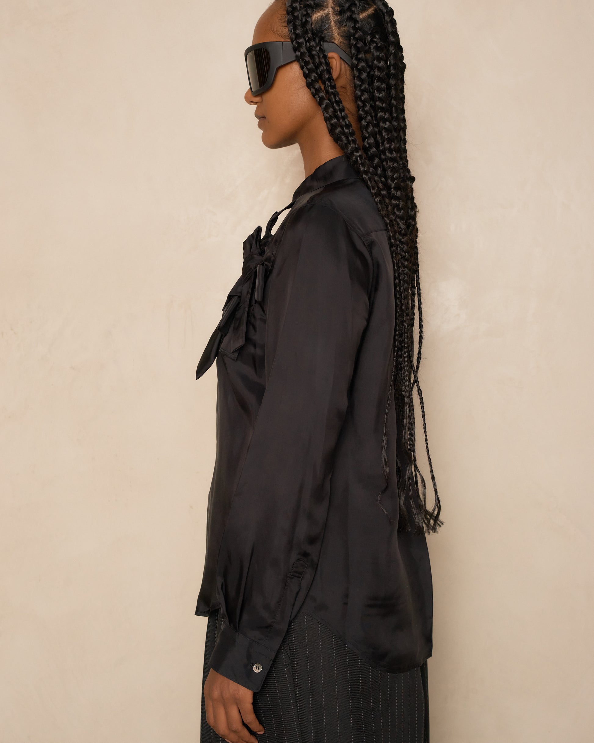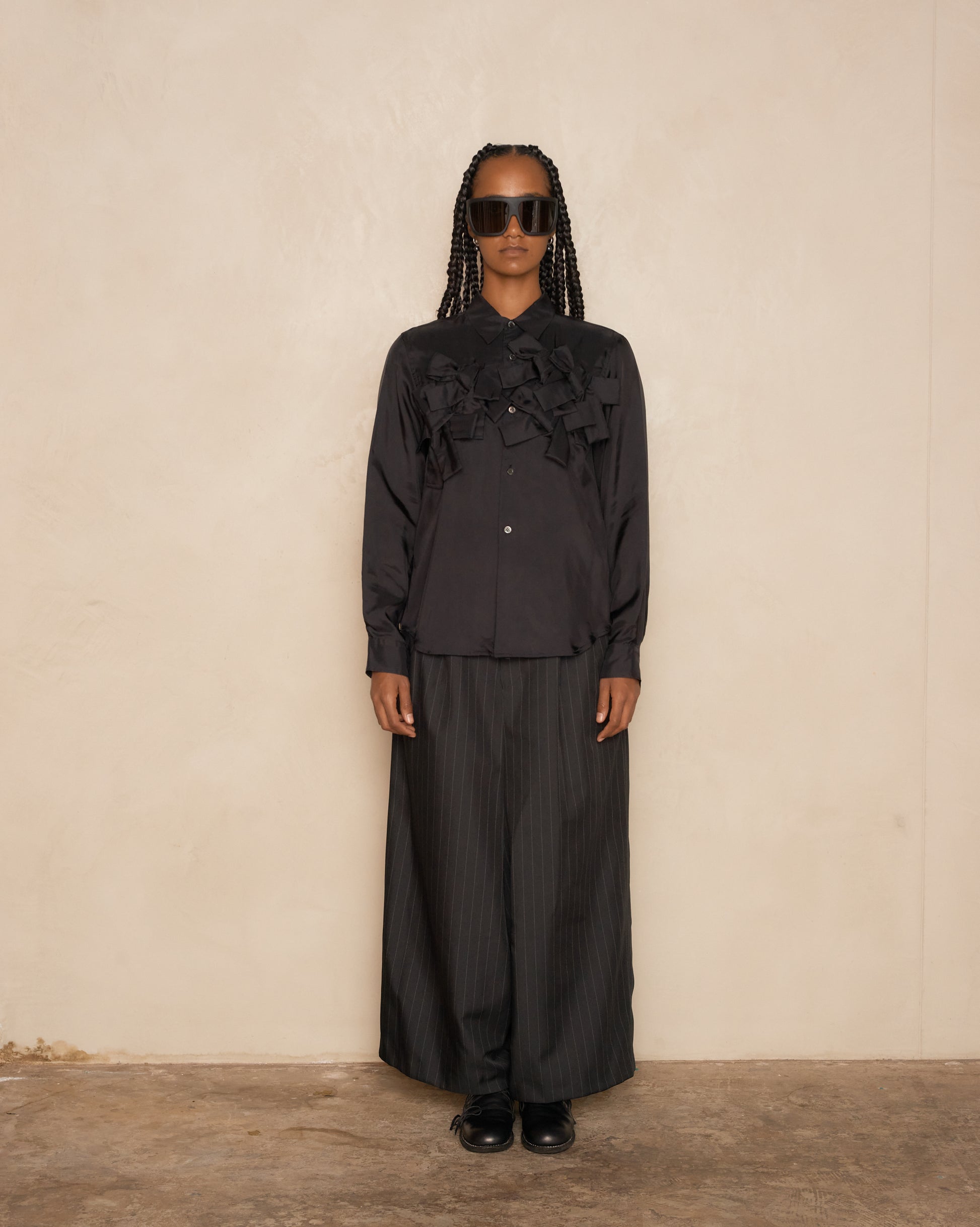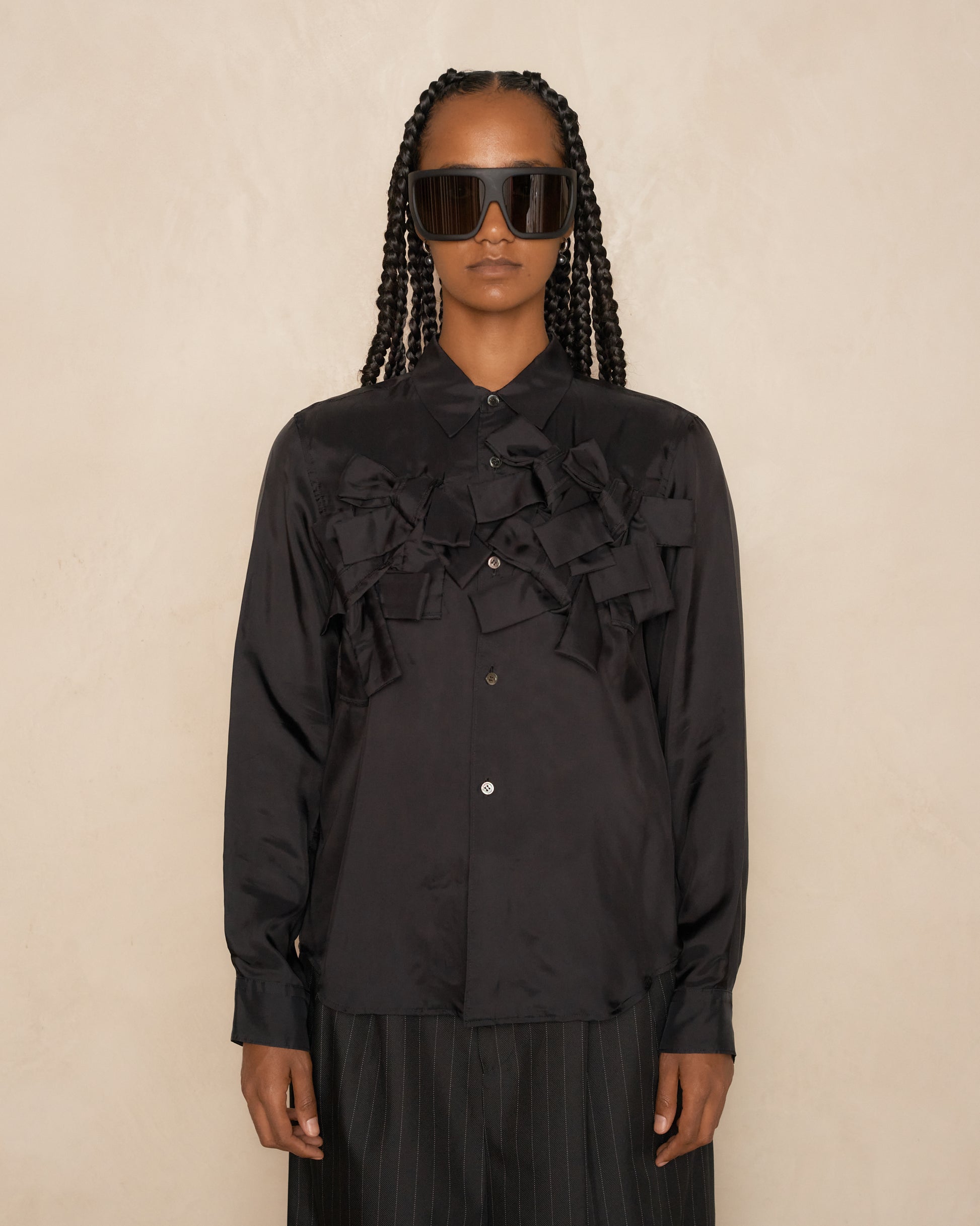Longsleeve bow shirt by Comme des Garçons Comme des Garçons. Classic fitted shirt with pointed collar crafted from crisp cotton poplin. Adorned with folded bow appliqués that span the chest in an entangled showcase. Everyday elegance updated with unconventional whimsy.