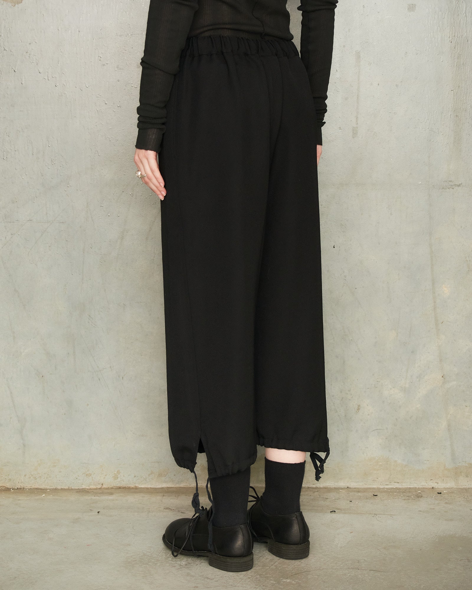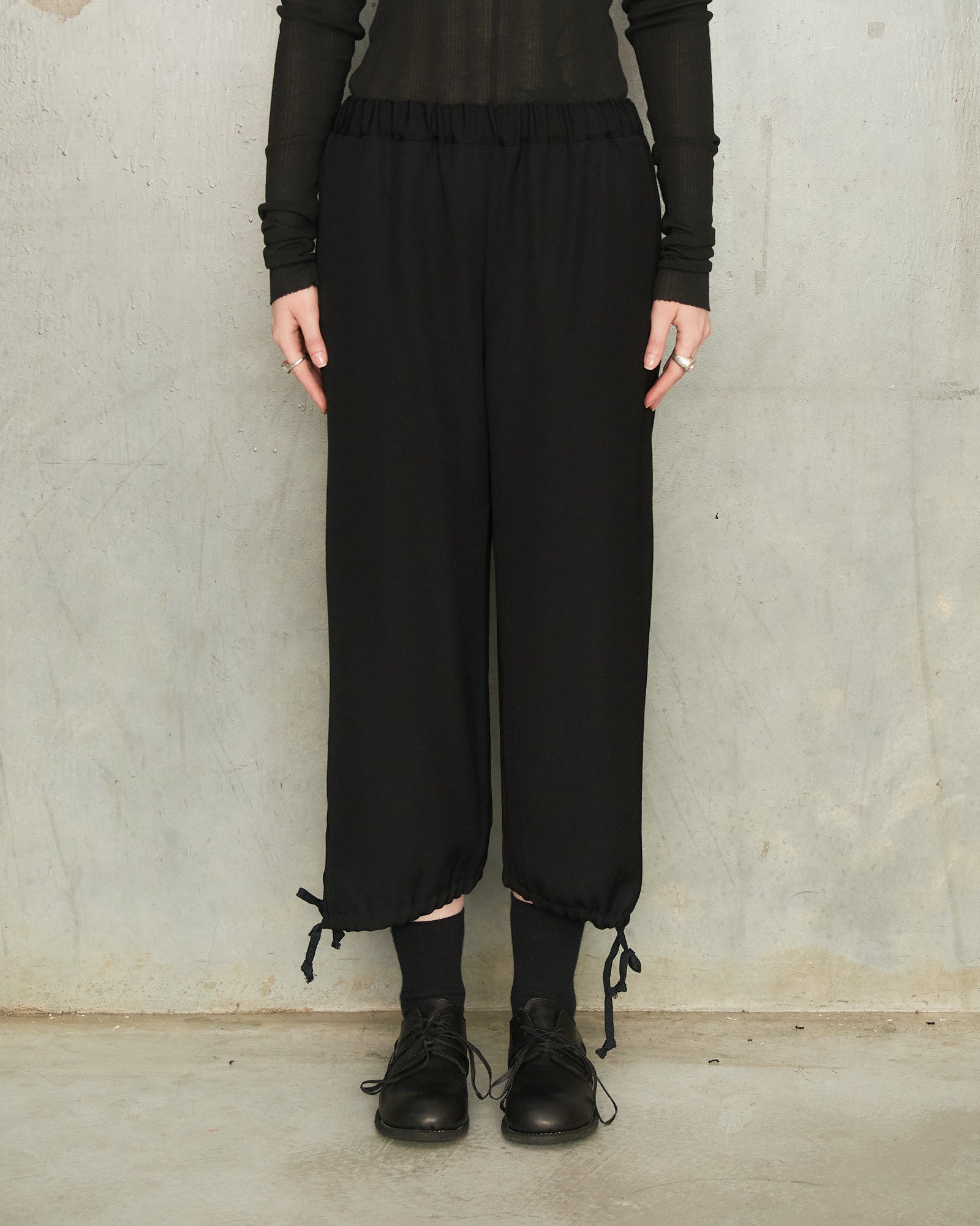 Relaxed balloon pants by Comme des Garçons Comme des Garçons in black. Relaxed trousers crafted in suiting wool for a relaxed drape. Adjustable drawstrings at the hems allow the silhouette to shift from tapered to gently ballooned.