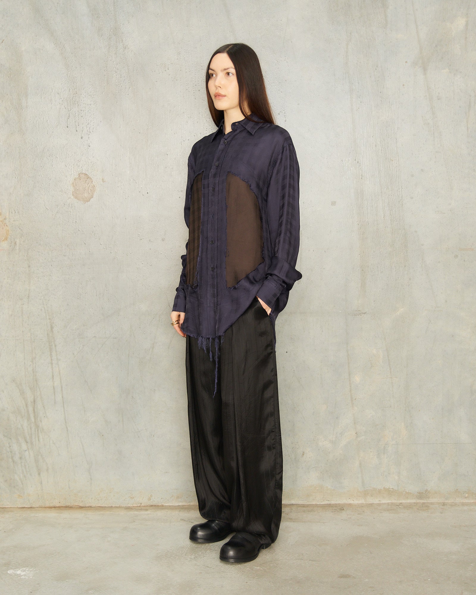 Pictured with Navy Brown Plaid Window Shirt by Edward Cuming, Noir Stretch Bustier by Marc Le Bihan and Black Leather Half Boots by Ziggy Chen.