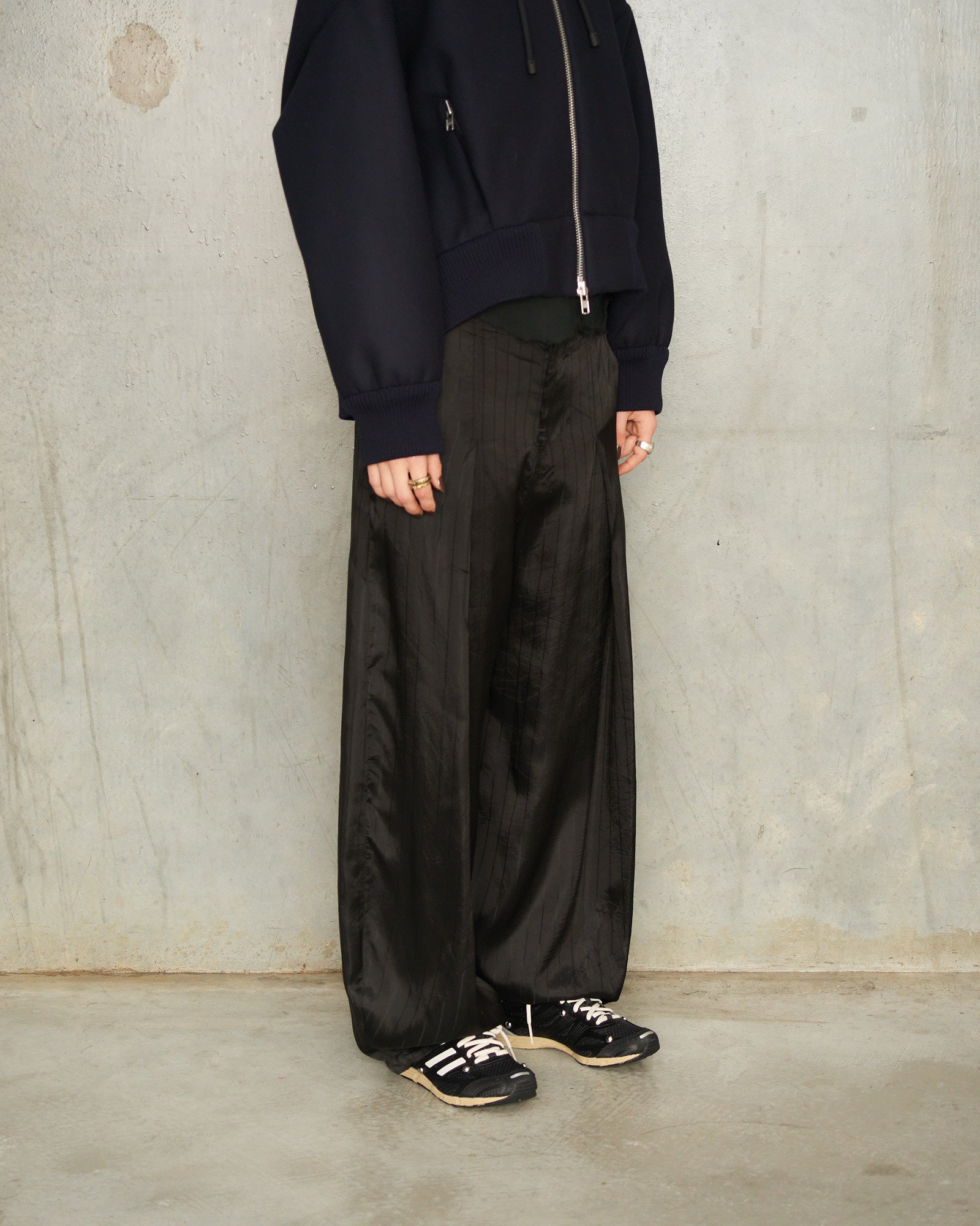 Jasmine trouser by Edward Cuming in black. Elegantly draped trousers in a sleek viscose acetate blend with subtle striped jacquard texture. Tailored at the waist with zip-fly and rear welt pockets, falling to a relaxed hem with effortless sophistication.