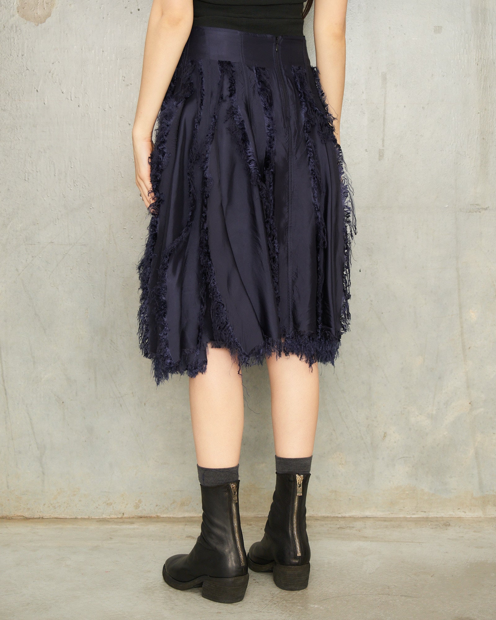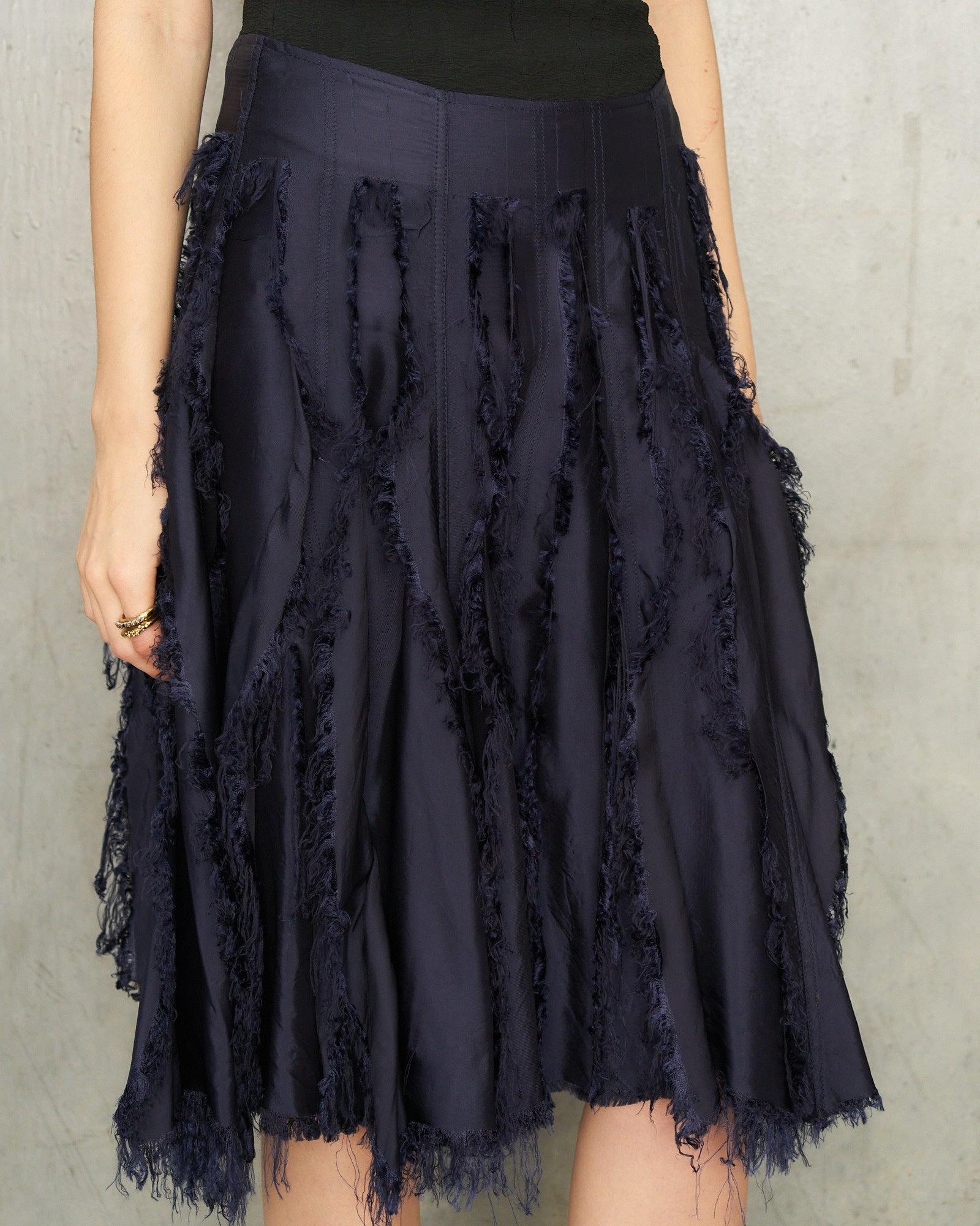 Scratched College skirt by Edward Cuming in navy. Short skirt featuring heavily distressed panels that cascade into a ruffled hem, balanced in its vivacity by a viscose twill fabrication in deep navy.
