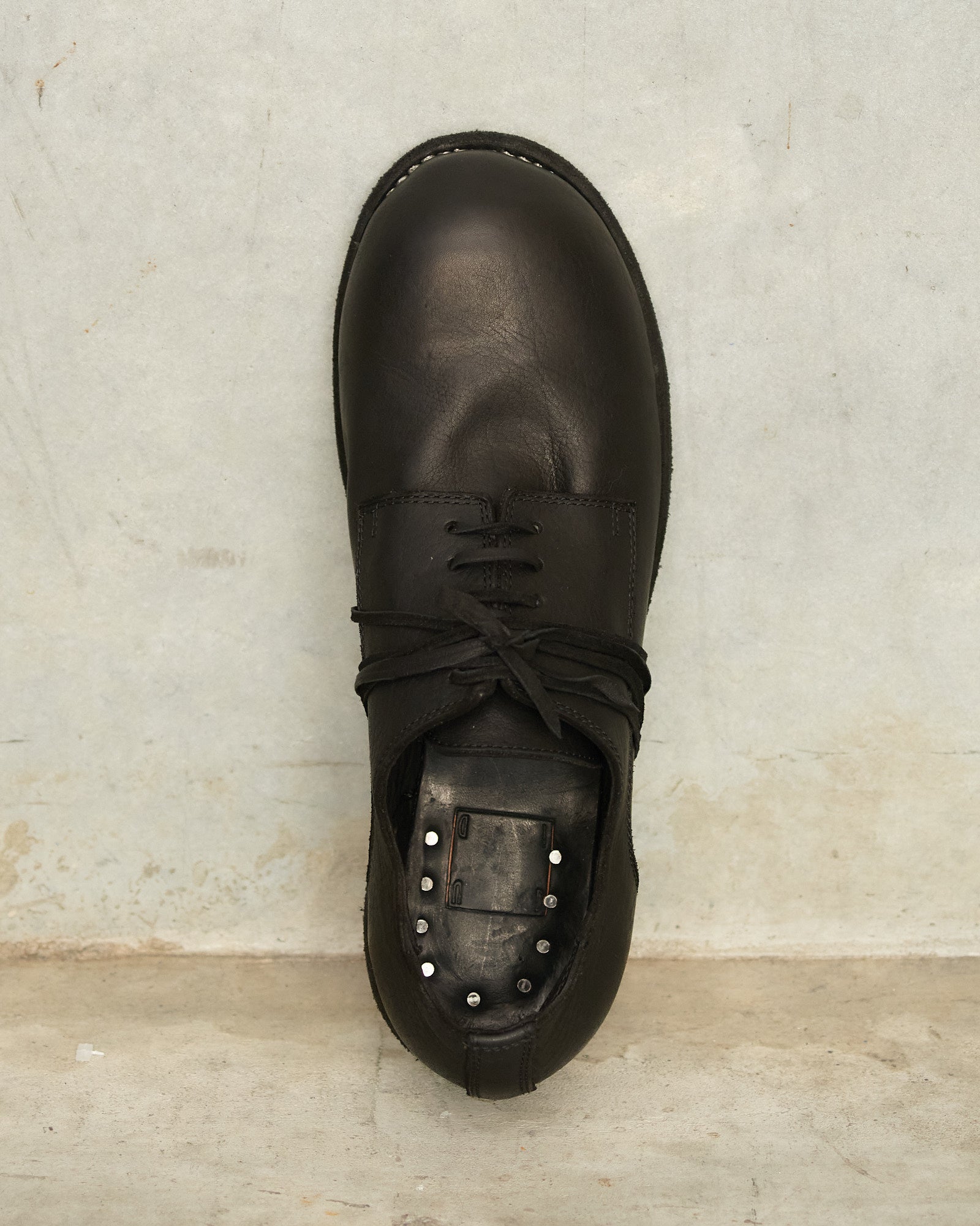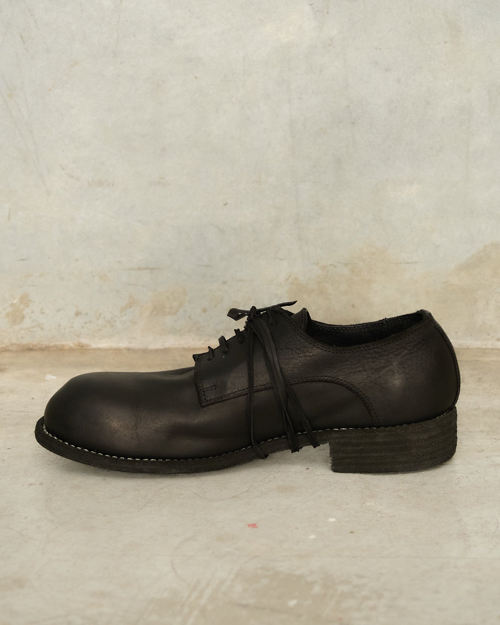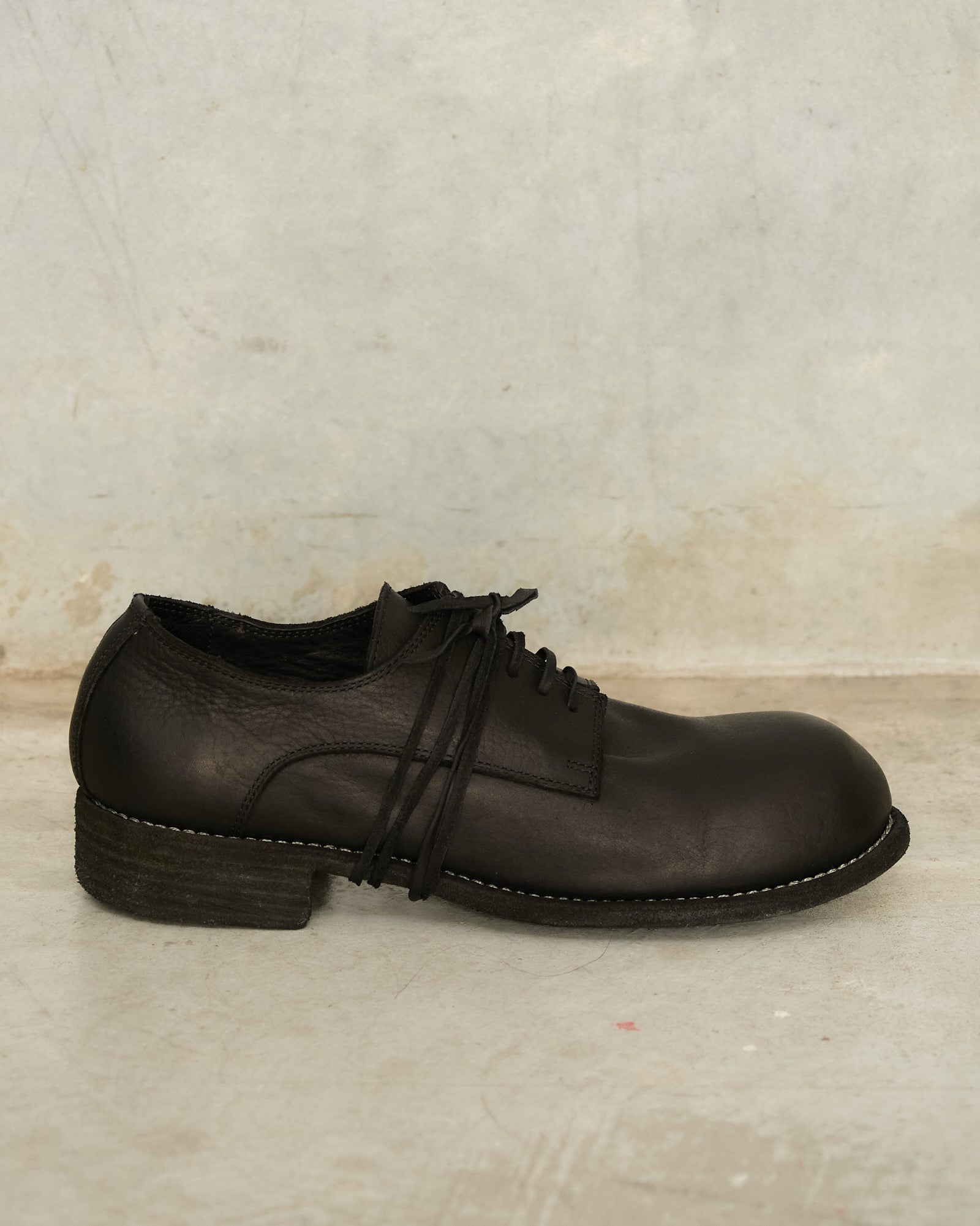 GR02 leather derby by Guidi in black. Chunky wrap-around lace derby shoes crafted from supple leather, set on sturdy leather soles. Timeless design that develops character with wear.