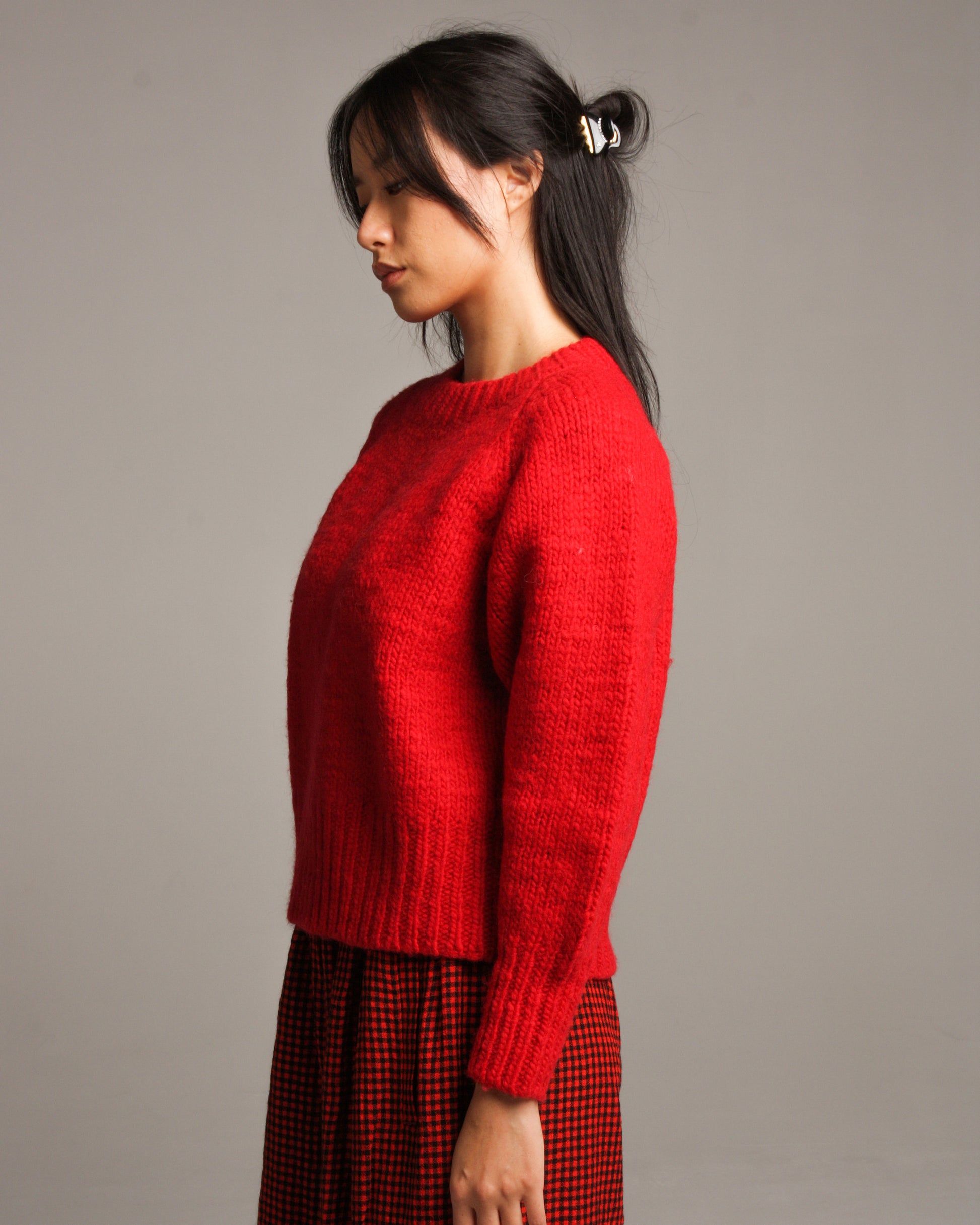 British wool eagle pullover by Ichi Antiquités in red. Crew neck style with heavy wool knit. Bright crimson shading balanced by a comforting shape and texture.