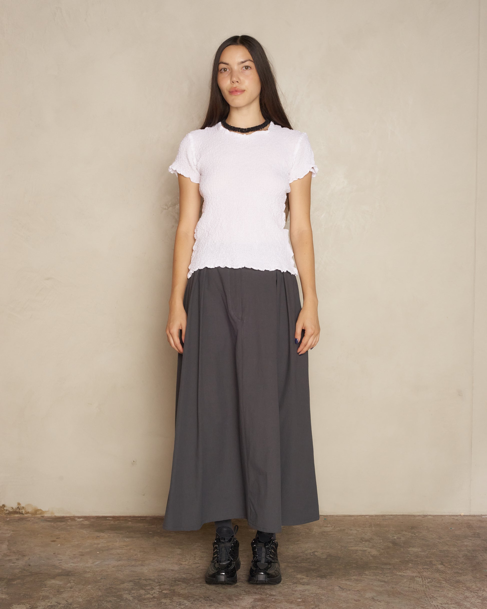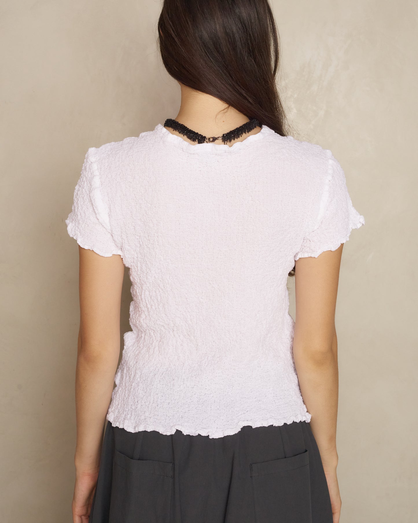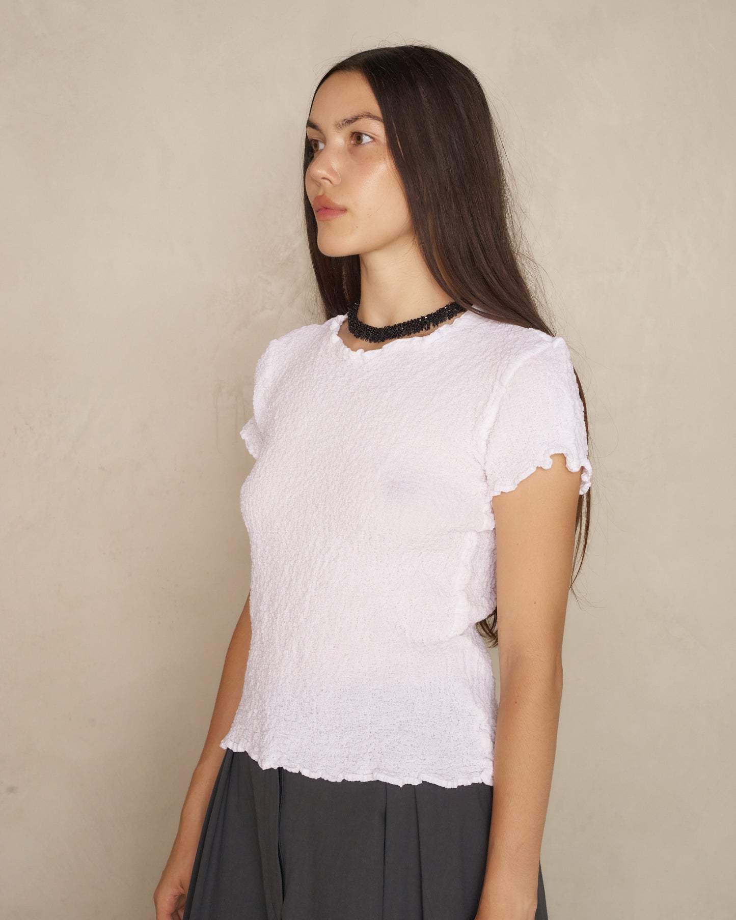 Classic cauliflower shirt by Issey Miyake ME in white. Short sleeve tee technically treated to give its unique 'cauliflower' look crinkling. A textural remodelling of a daily staple.
