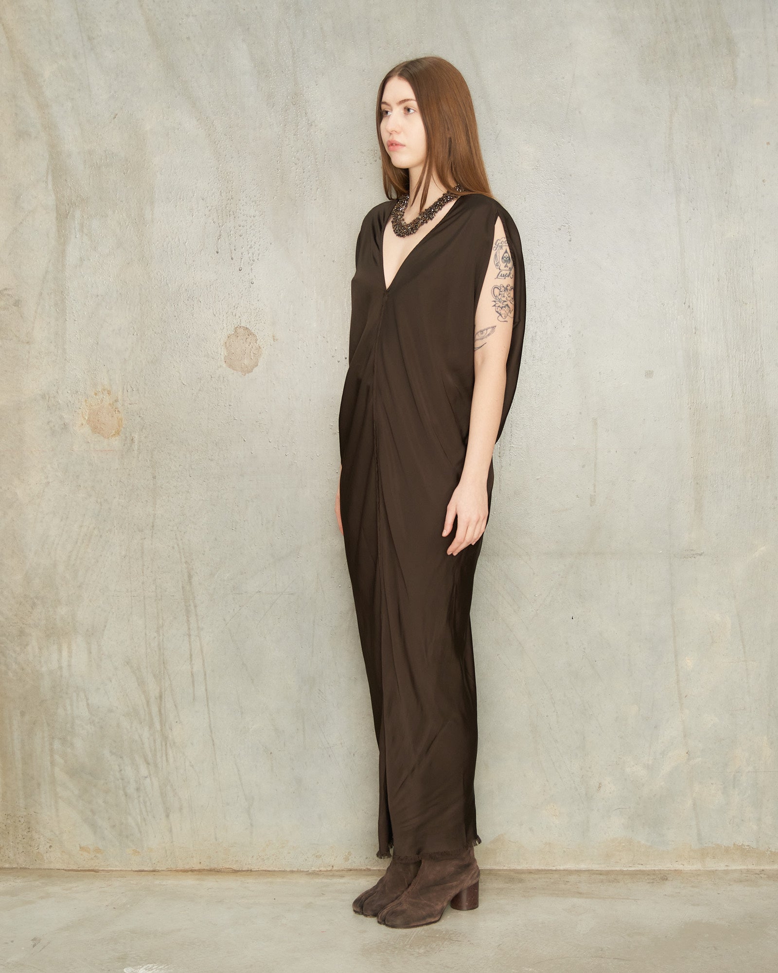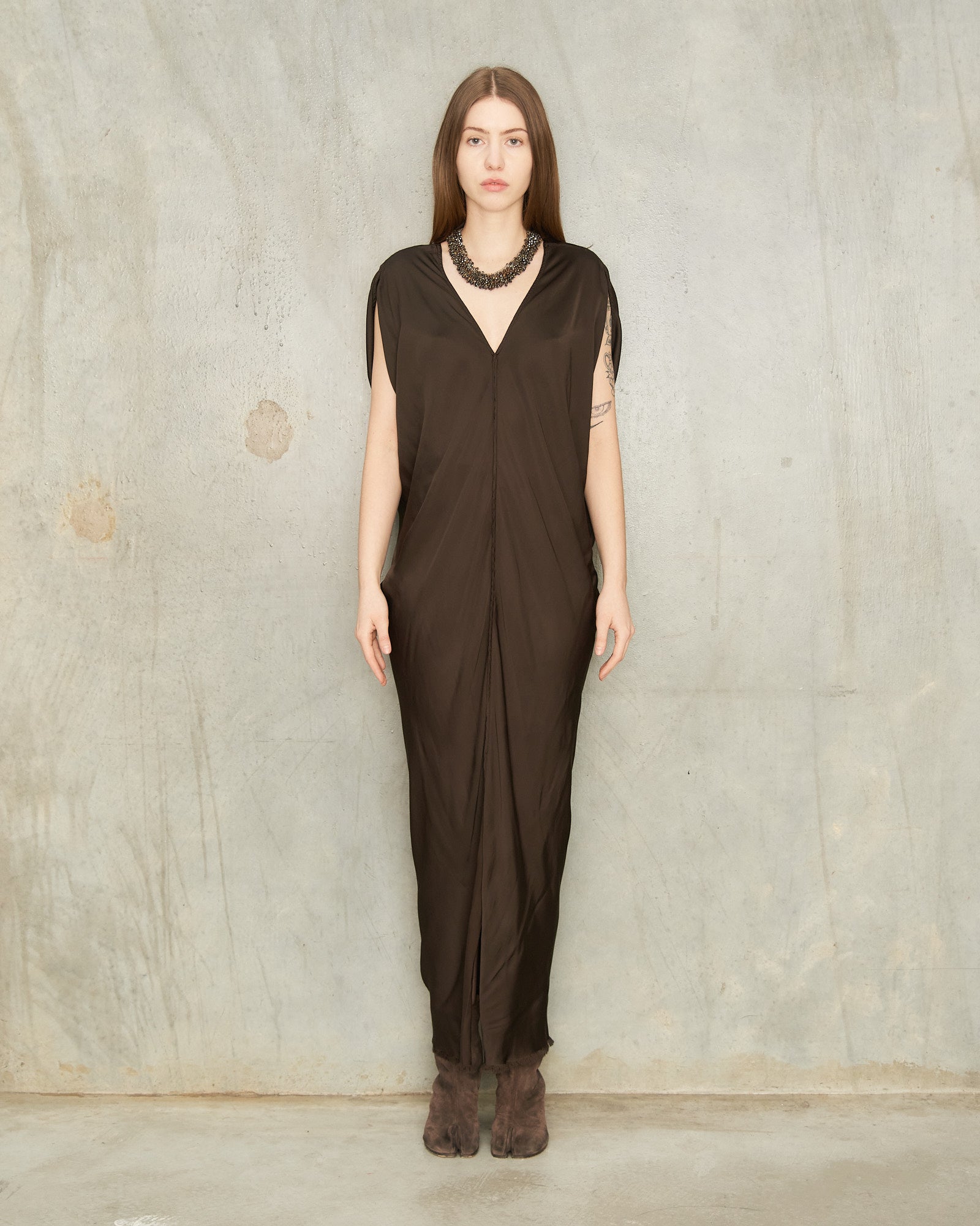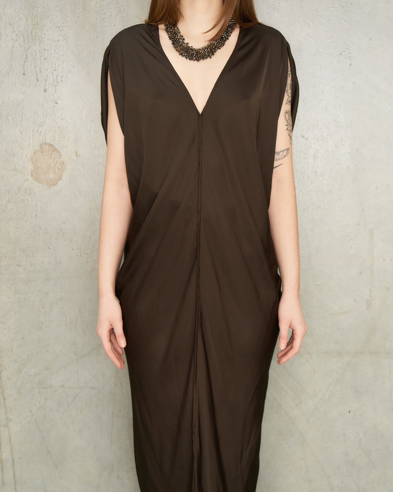 Leah dress by Jaga in chocolate. Stunning handcrafted dress in luscious pearly rayon. Front and rear V-neckline detailed by a frayed raw edge. Bias cut panelling offers a natural drape and elegant fluidity. A clean central seam travels down the front to finish with a dramatic high central vent.