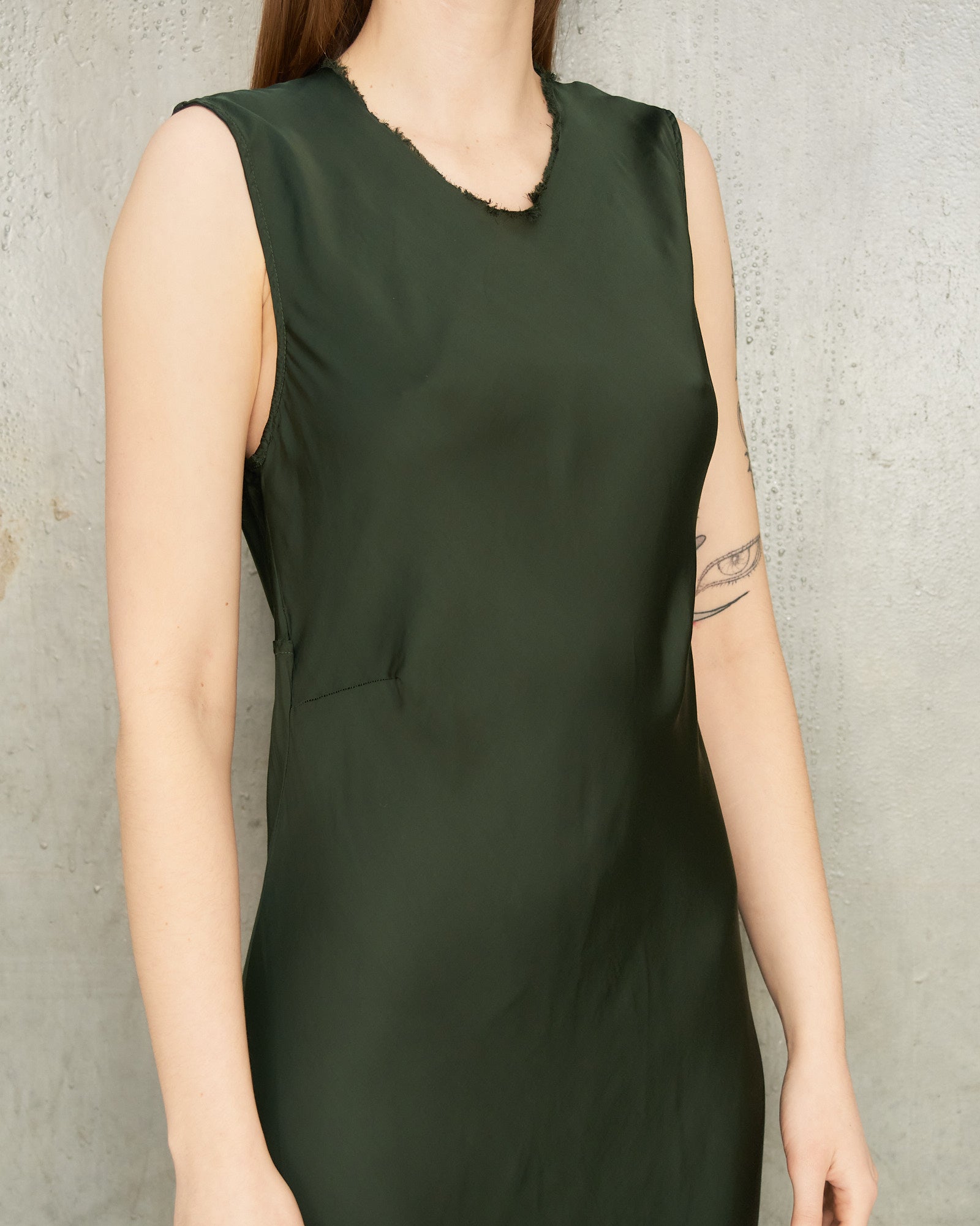 Kate dress by Jaga in jade. Minimal shift dress in lustrous satin, cut on the bias for fluid drape. Finished with raw, frayed hems for a handcrafted, subtly timeworn effect.