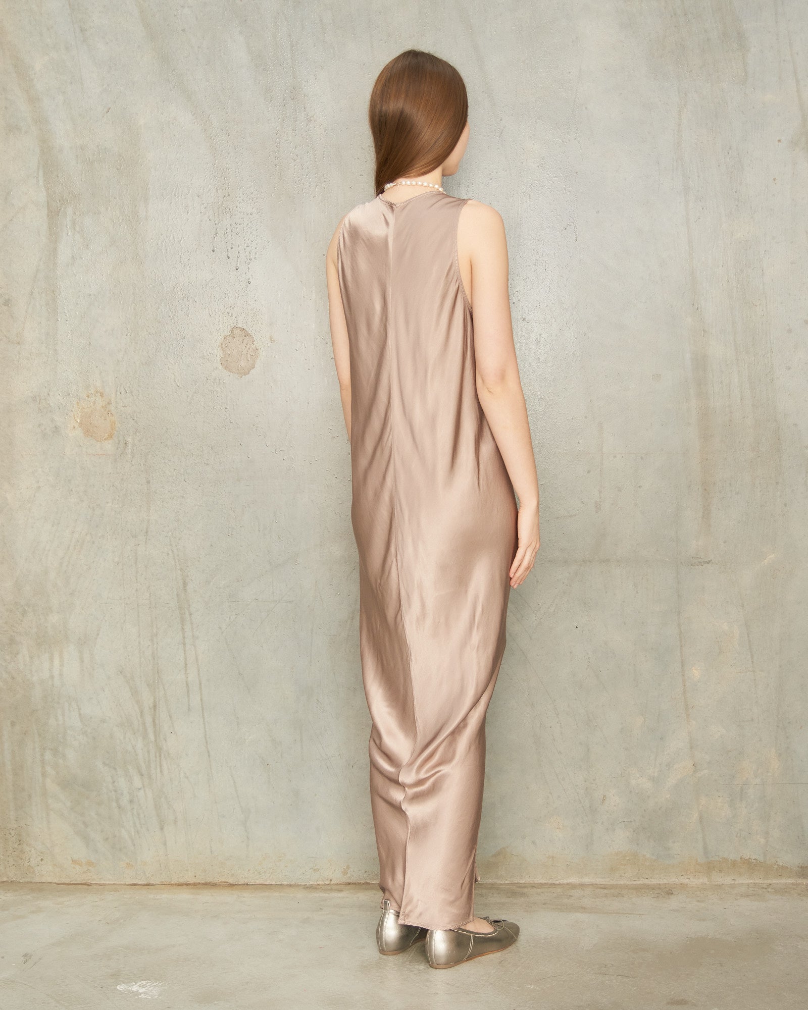 Lina dress by Jaga in shiitake. The Linda dress enchants in radiant satin with a relaxed fluidity. Bias-cut panels meet at central seams, while subtle pinched folds at the waist release into a graceful drape and flared silhouette. Handcrafted in the designer’s Los Angeles studio, it embodies an artful balance of ease and seduction.