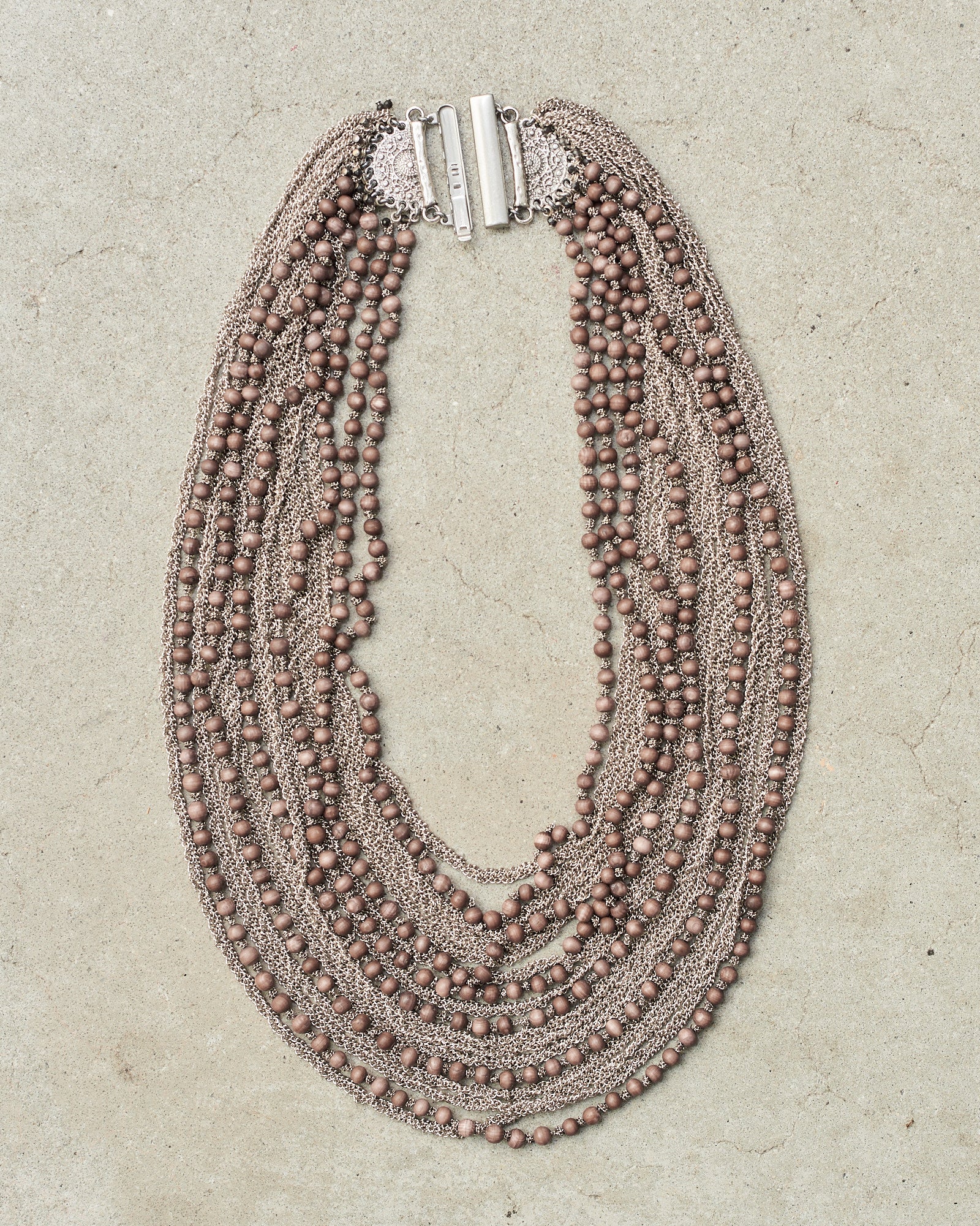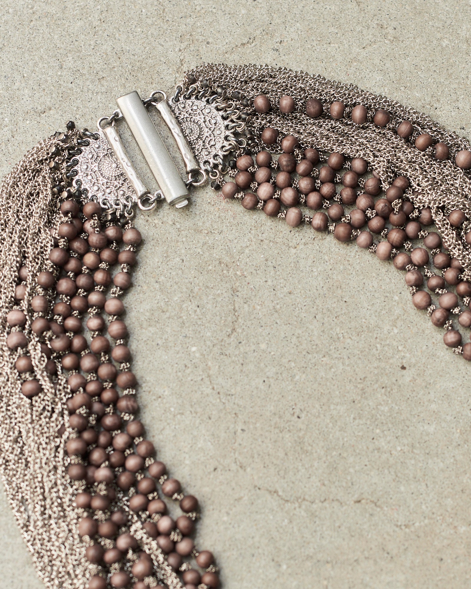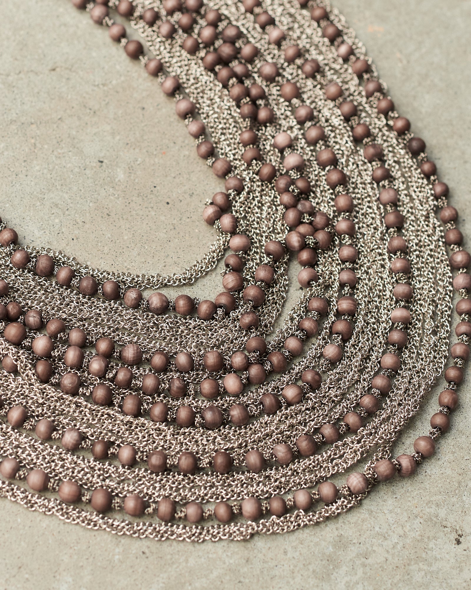 Wood bead chain necklace by Jean-François Mimilla. Multi-stranded necklace of delicate stainless steel chains intertwined with chunky wooden beads in an earthy marron glacé tone, secured at the nape with an antique clasp.