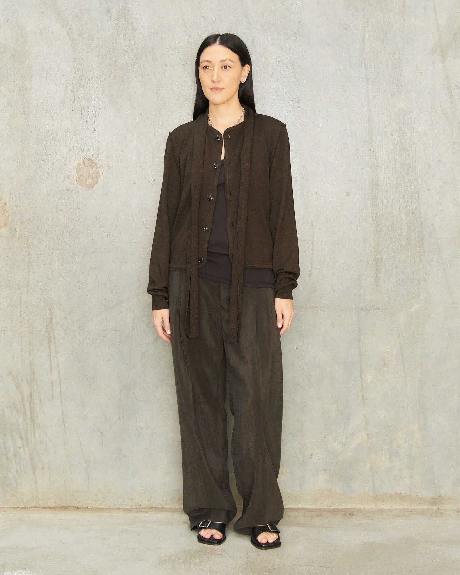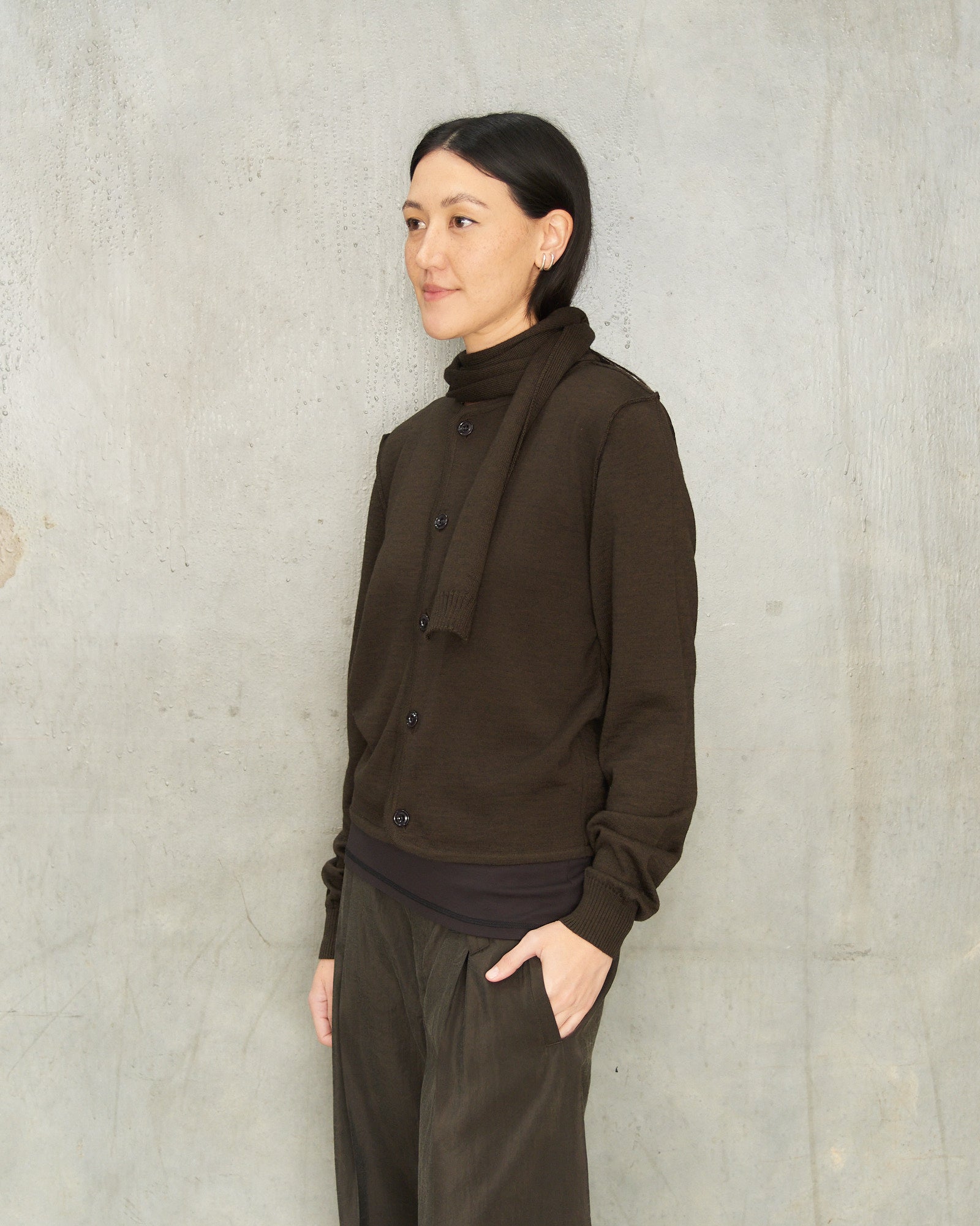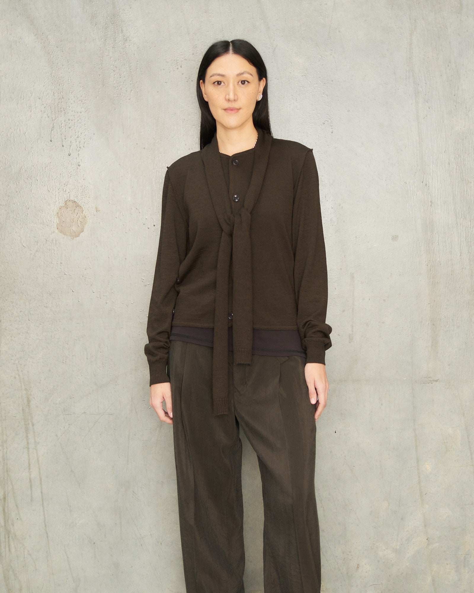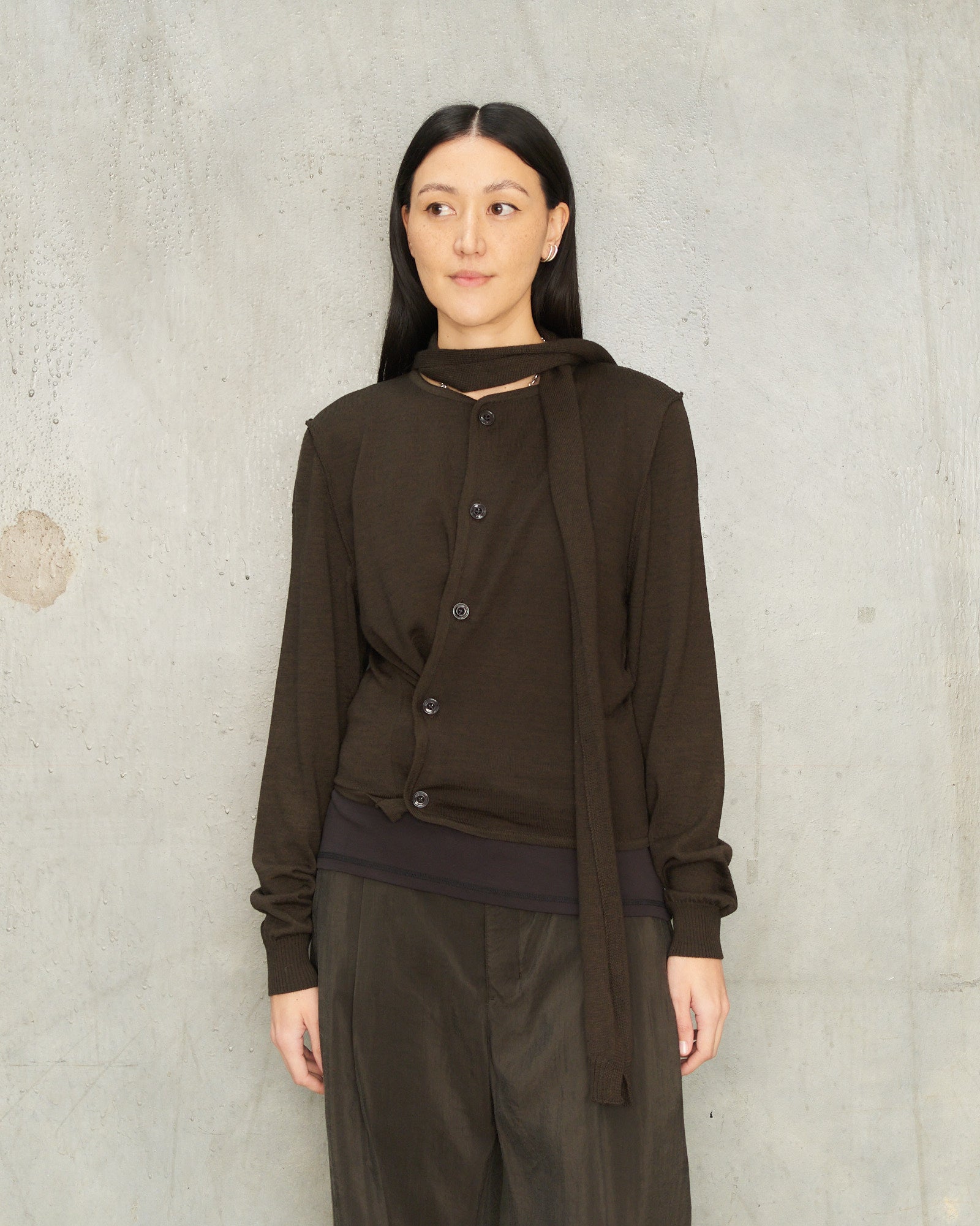 Twisted cardigan by Lemaire in dark cacao. Elegant cardigan knitted from a supple yet structured merino blend, featuring an integrated scarf to tie or drape. Additional waist buttons allow for a softly wrapped, asymmetric closure.