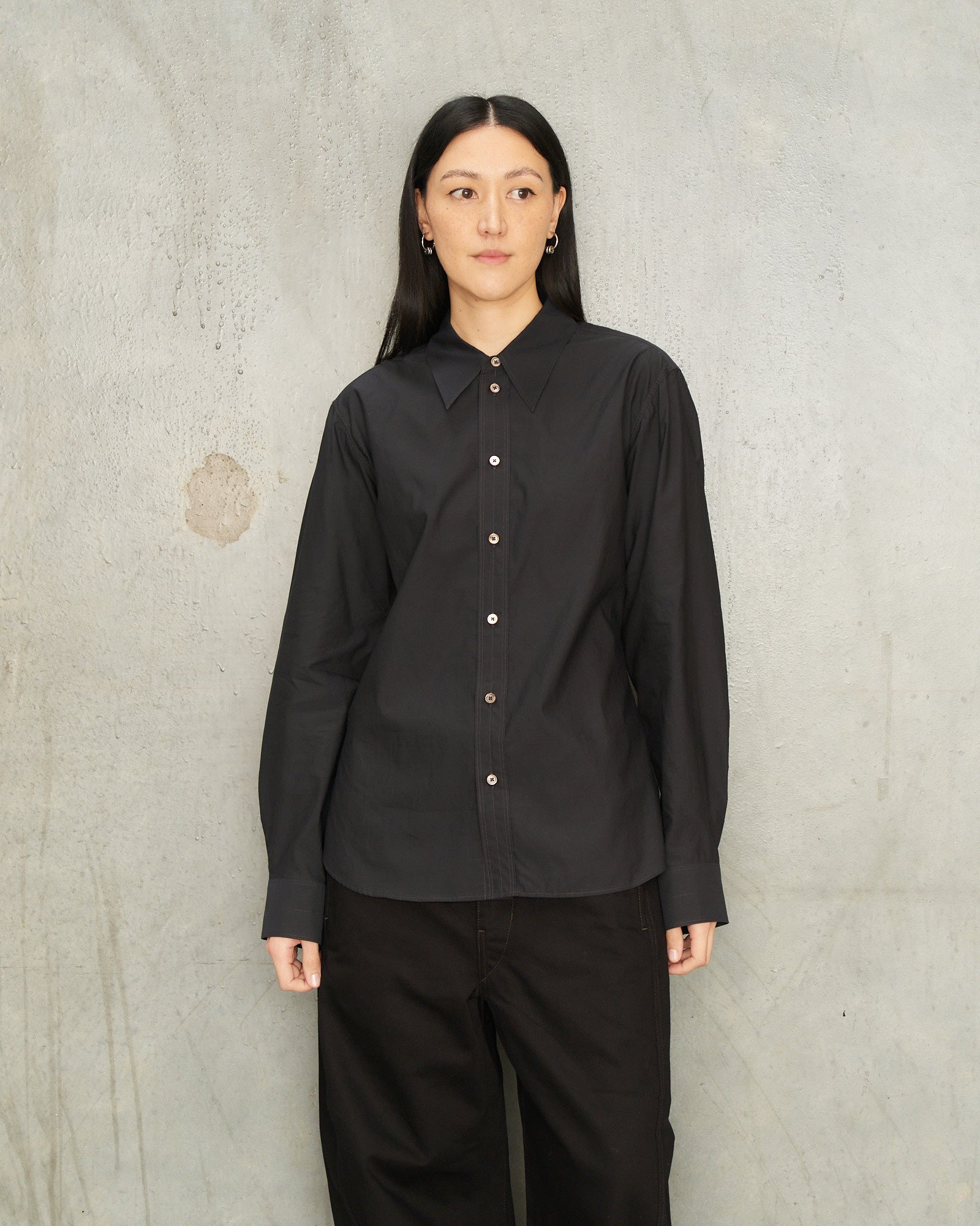 Pointed collared shirt by Lemaire in squid ink. Wonderfully fitted shirt in a washed cotton-silk blend with a soft patina and delicate hand. Tailored with a defined waist and a crisp pointed collar for a refined silhouette.