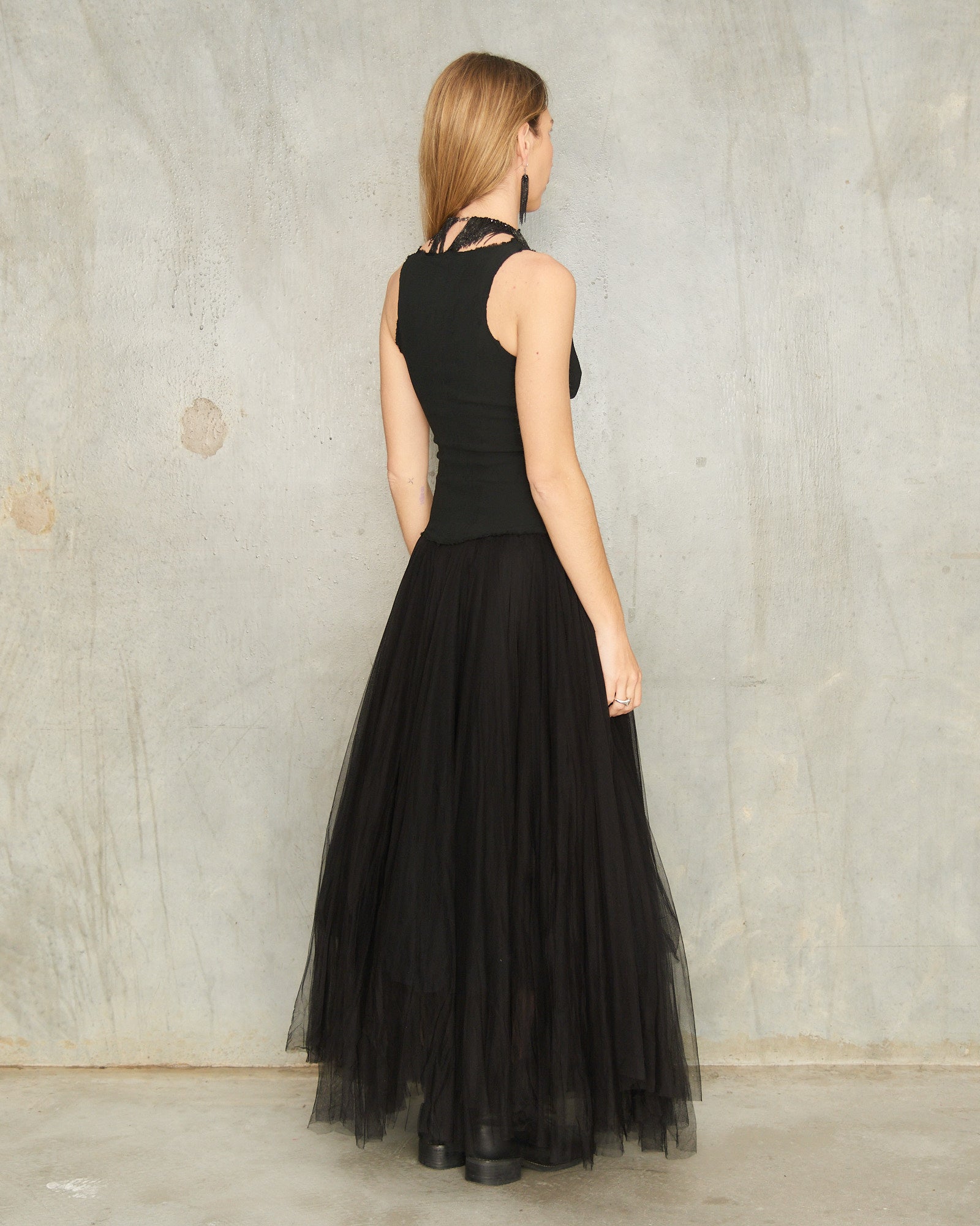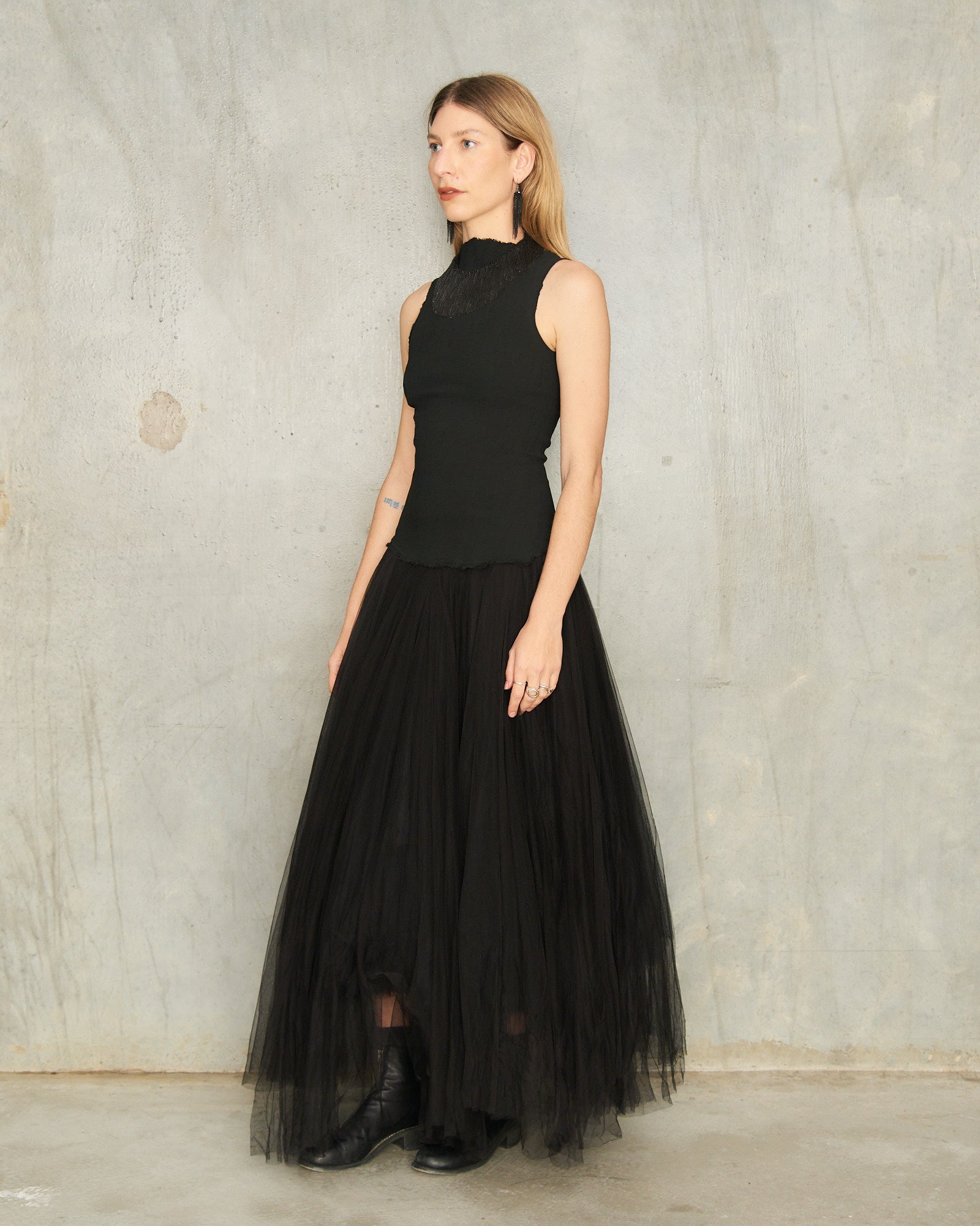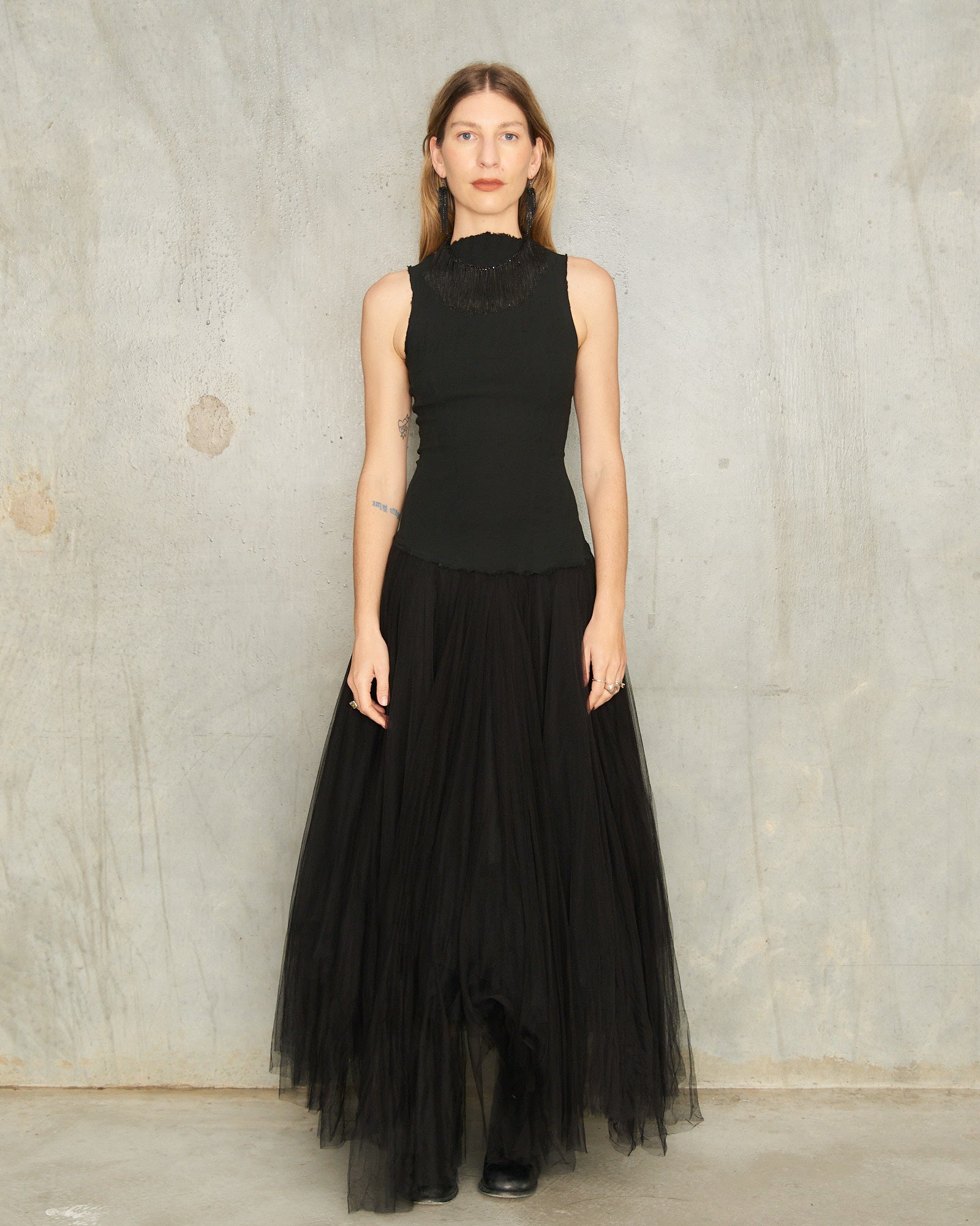 Stretch tulle dress by Marc Le Bihan in noir. A sculpted stretch tank in crinkled silk crepe de chine layered over diaphanous tulle, pleated and twisted to create a dramatic, feather-like silhouette.