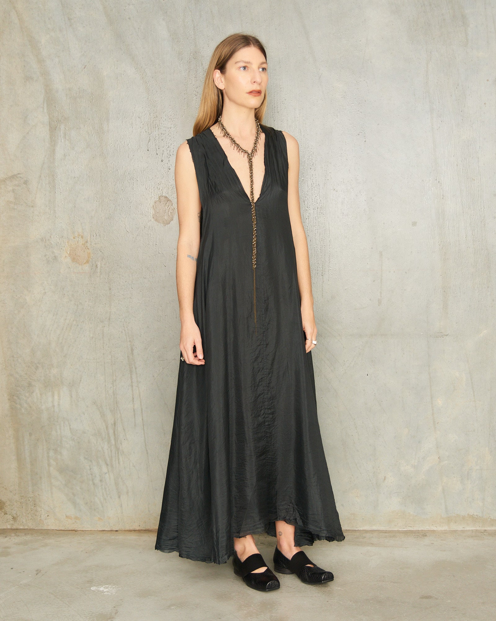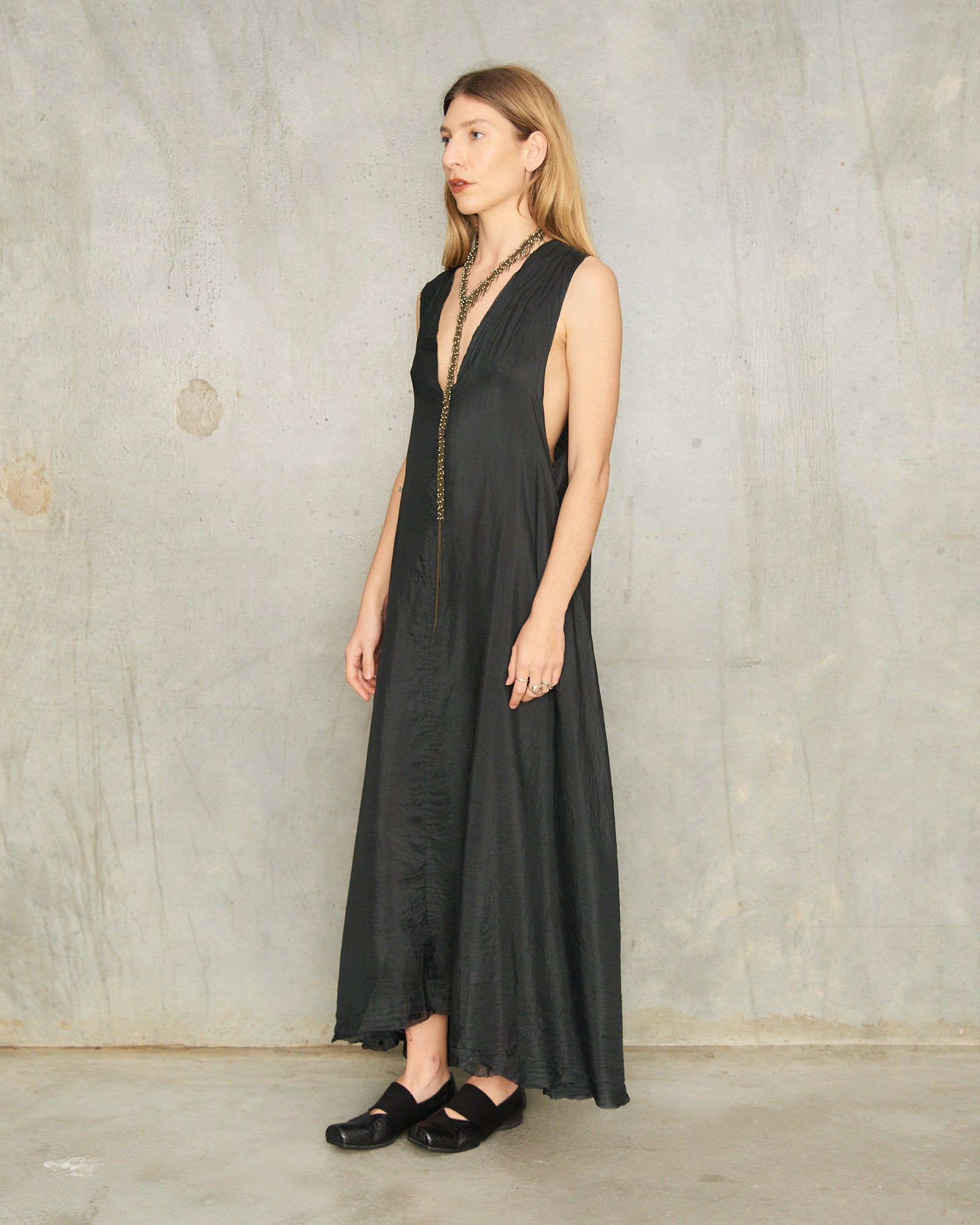 V-neck silk dress by Marc Le Bihan in noir. Floor-length silk dress with an elegant plunging neckline. Crinkled shoulder panels give way to a billowing silhouette, finished with raw hems that reveal the artisan’s hand.
