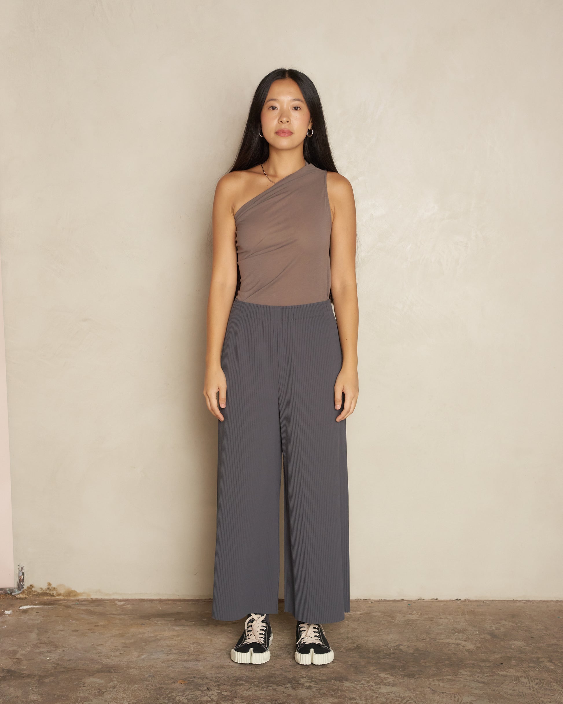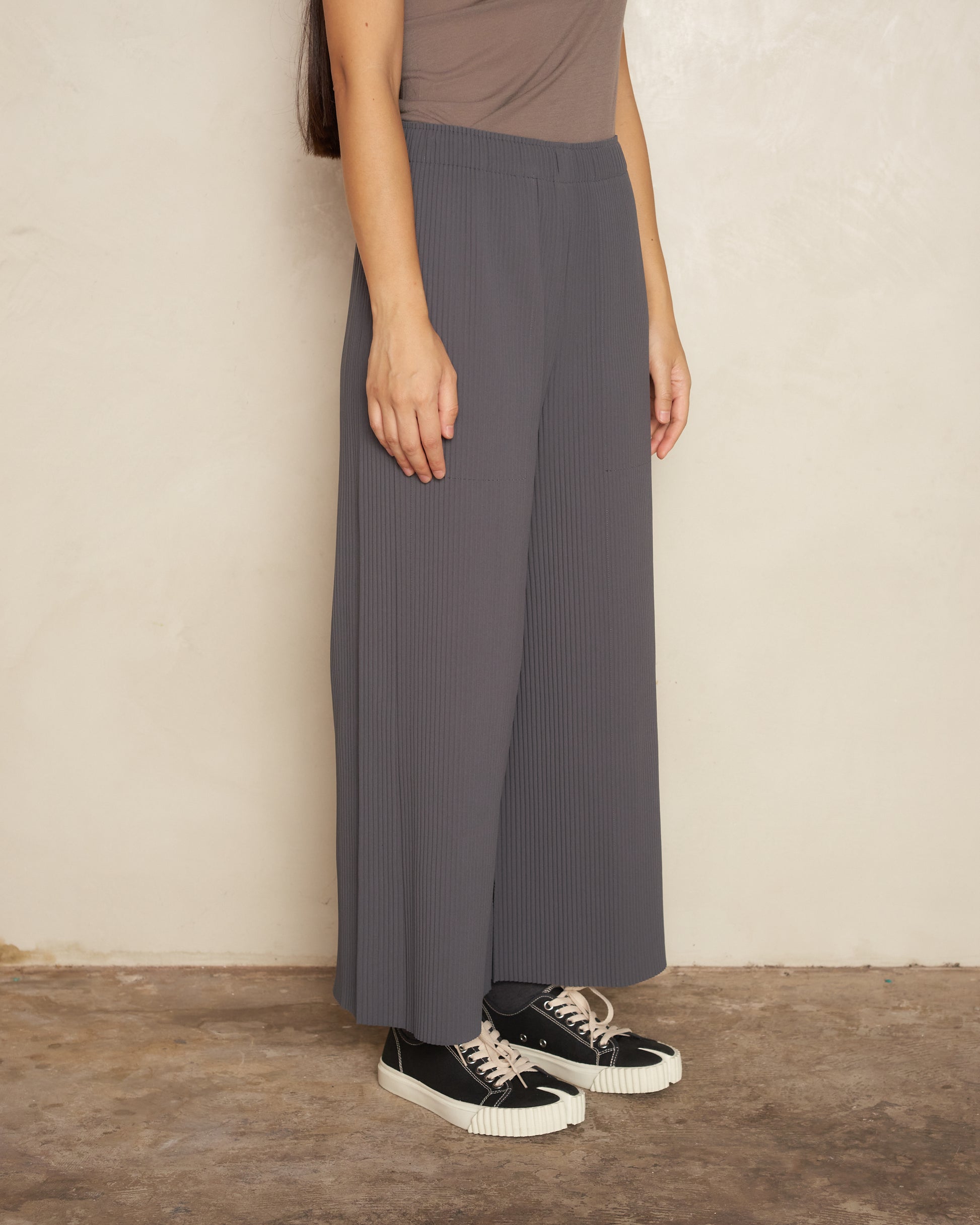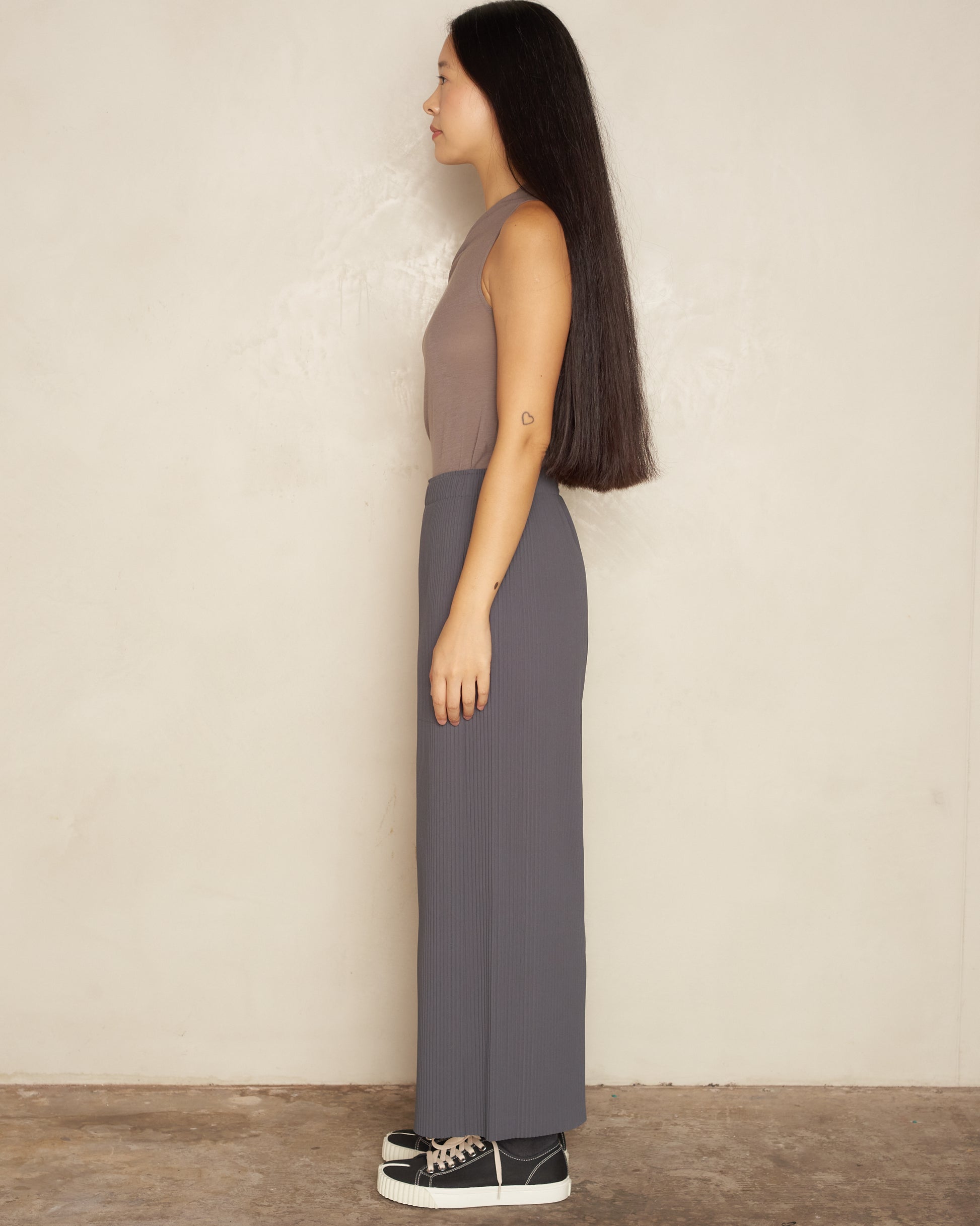 Classic fine knit pleat trousers by Issey Miyake ME in charcoal. Classic straight leg trousers with soft ribbed pleats applied a stretchy knit material. Elastic waistband and pockets on both sides. A comfortable daily companion in a subdued tone.