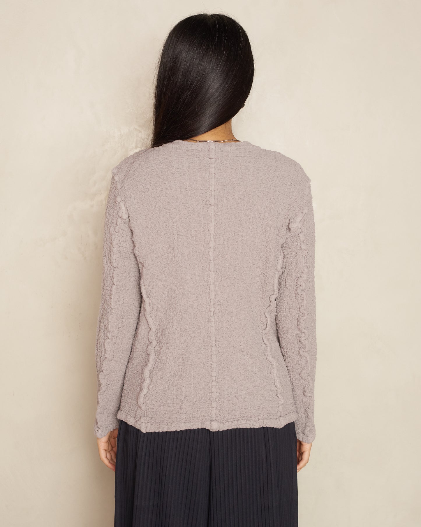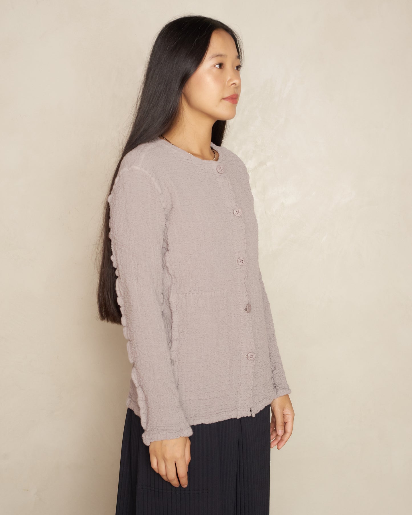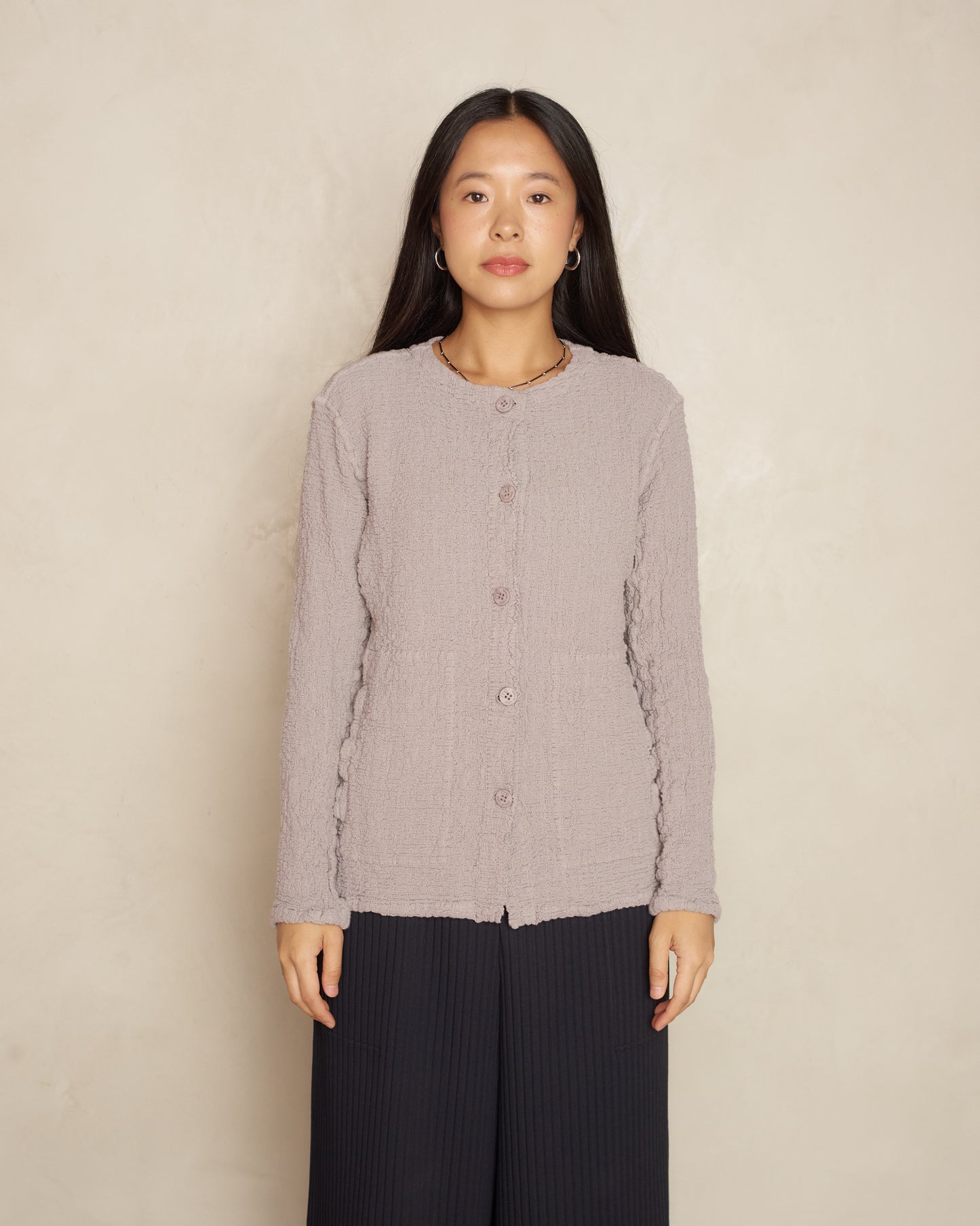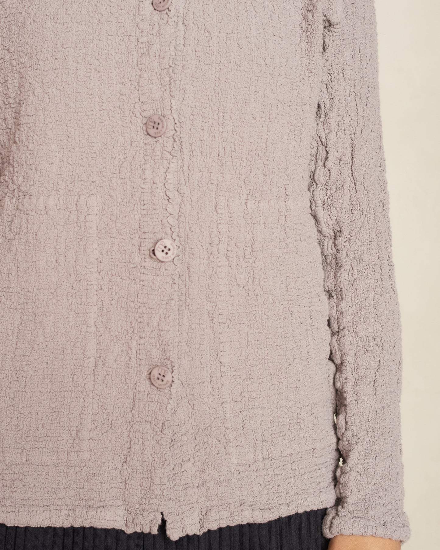 Classic cauliflower cardigan by Issey Miyake ME in grey. Long sleeve buttoned cardigan with collarless neckline. Crafted in cotton and technically treated to give its unique "cauliflower" look crinkling. Detailed by contrasting outward seams lining the neck, sleeves and back.