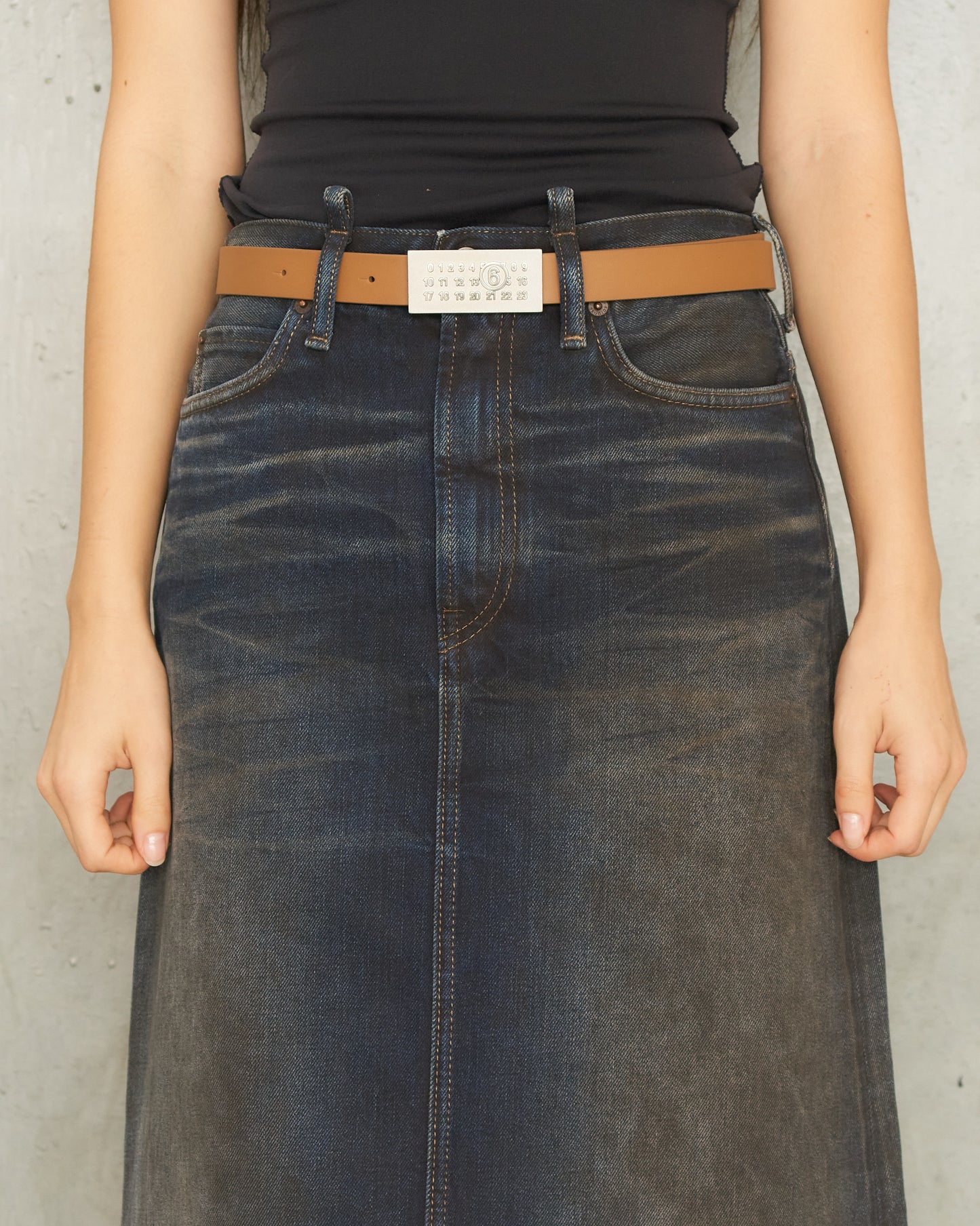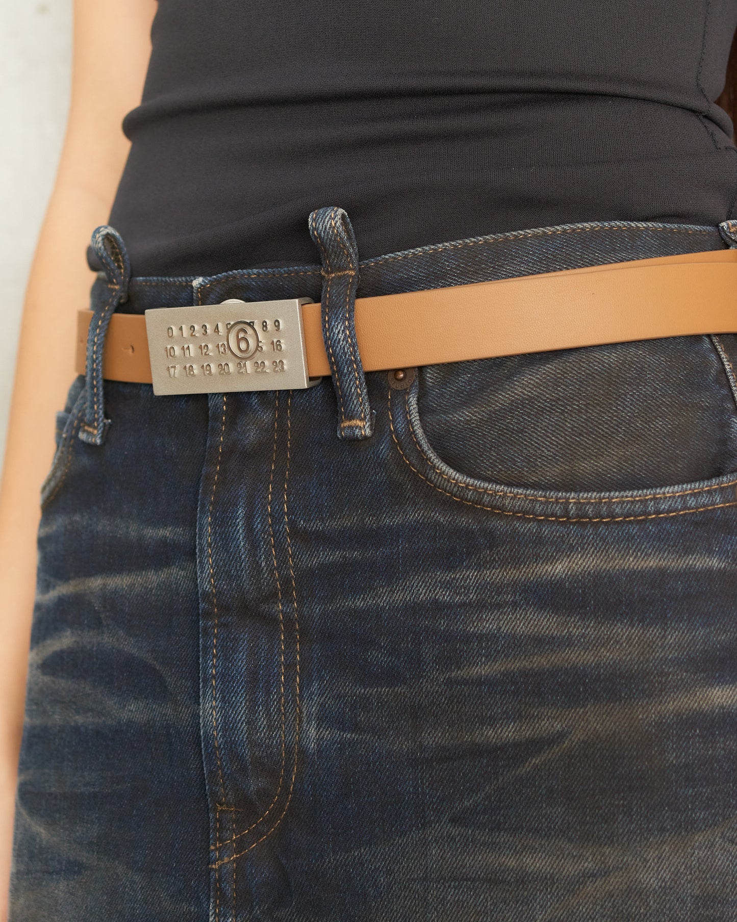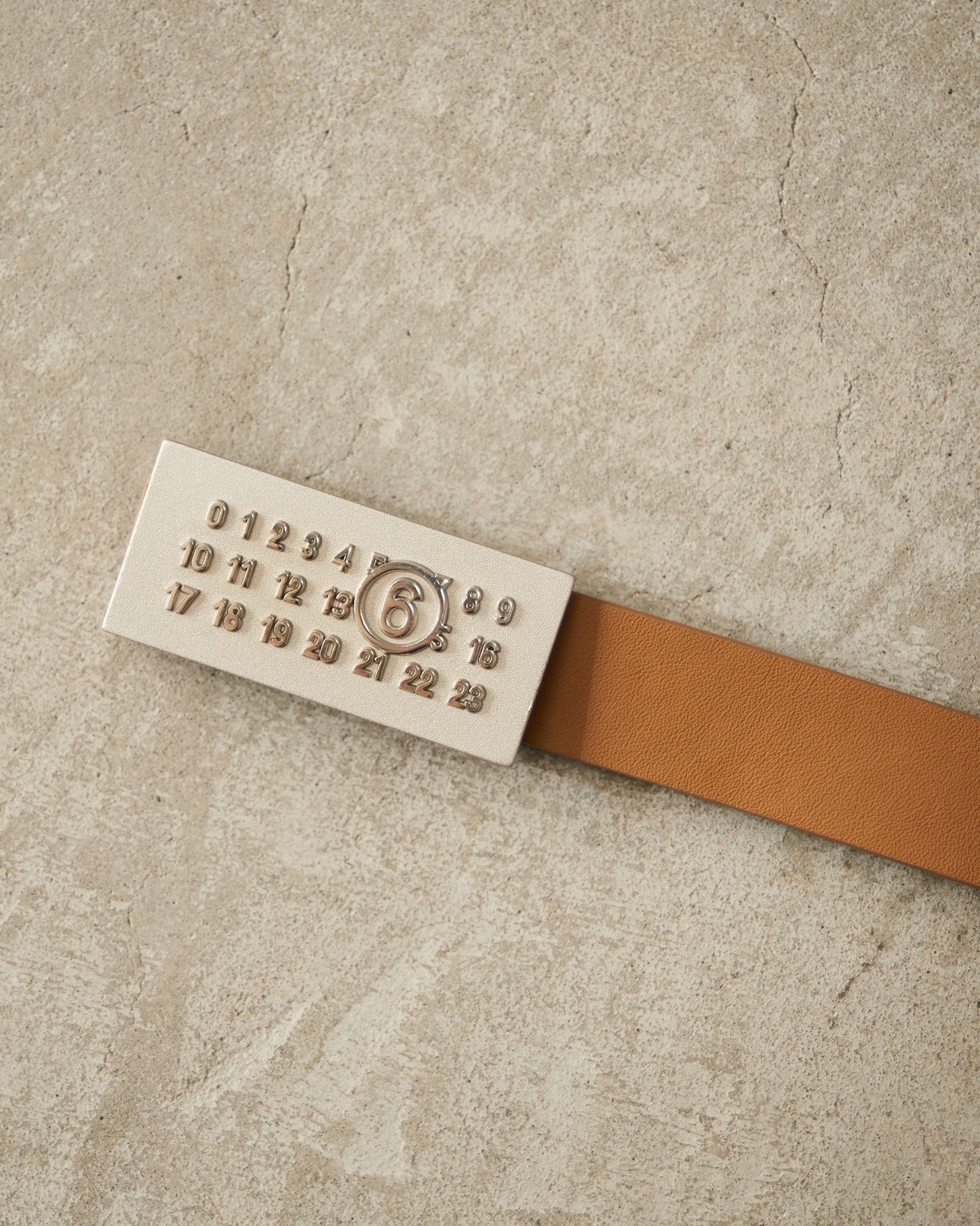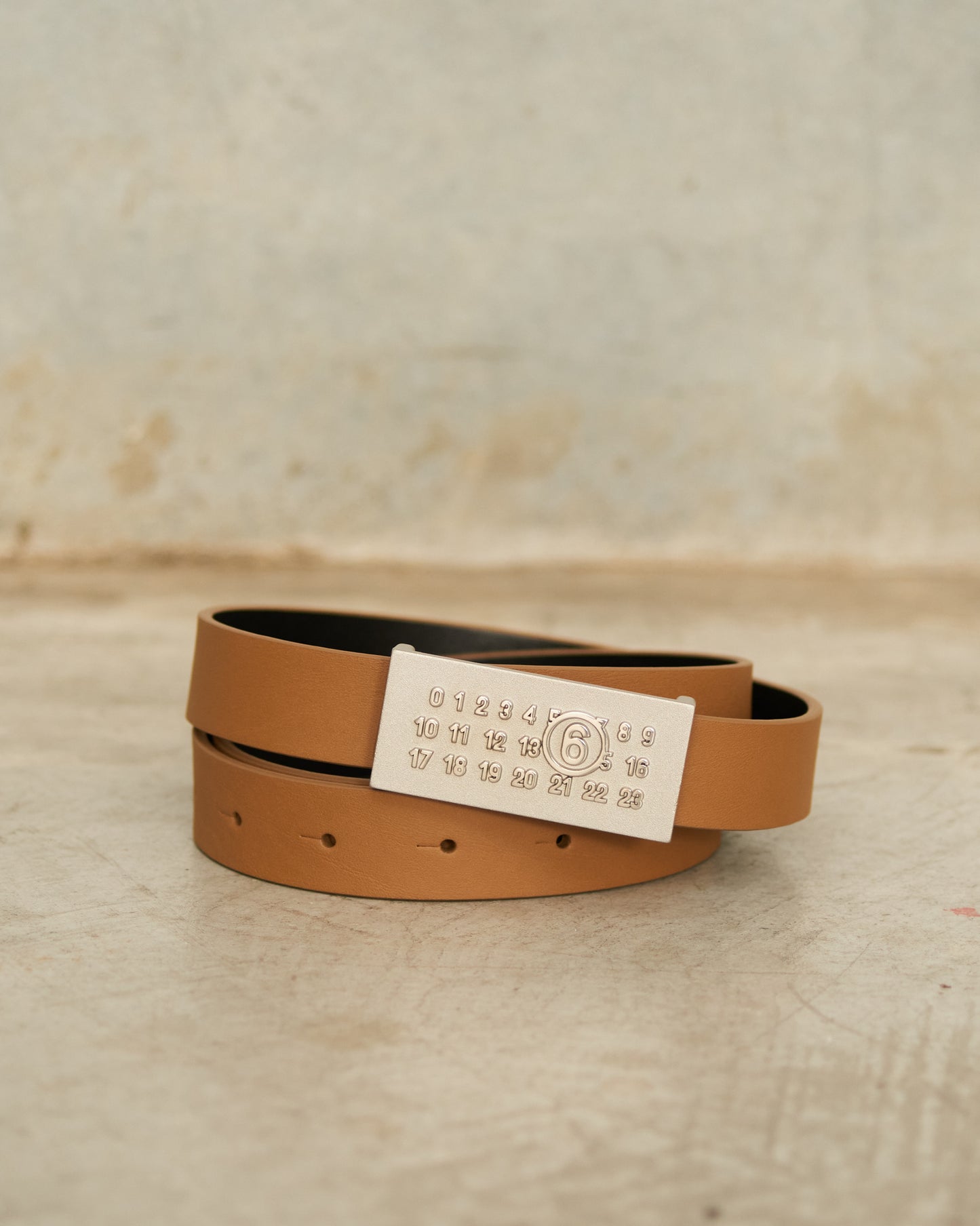 Numeric belt by MM6 Maison Margiela in dark olive. Minimal and versatile, this dark olive tan belt is crafted from smooth calf leather and features a metal buckle with signature numeric logo embossing.