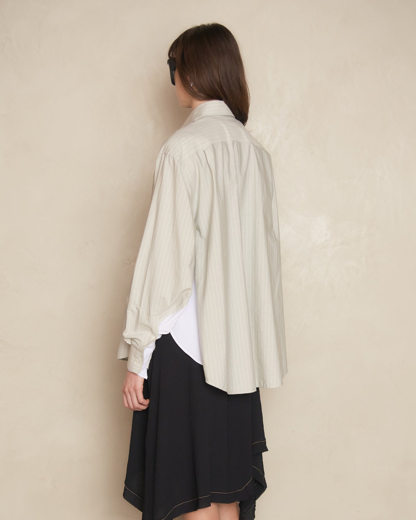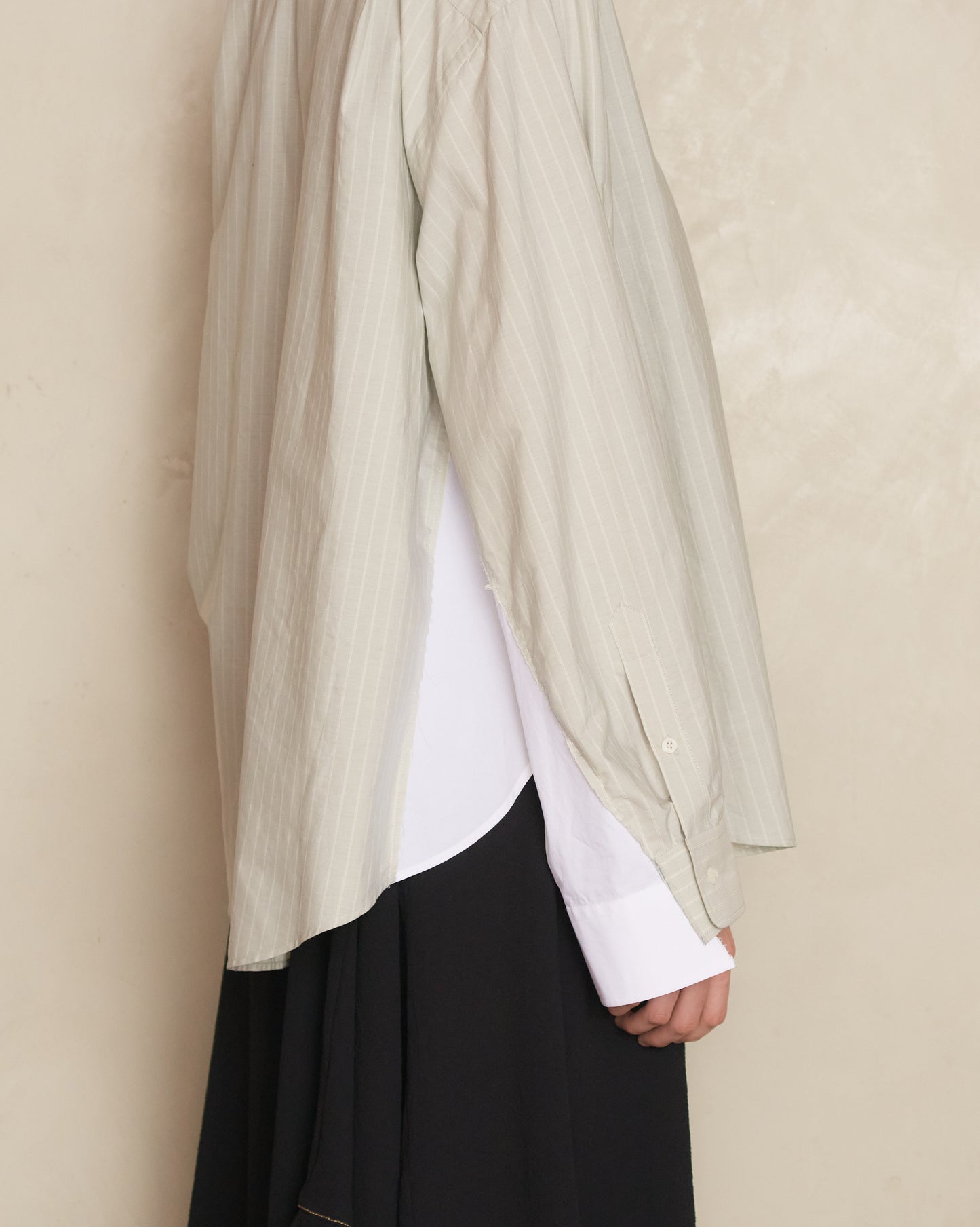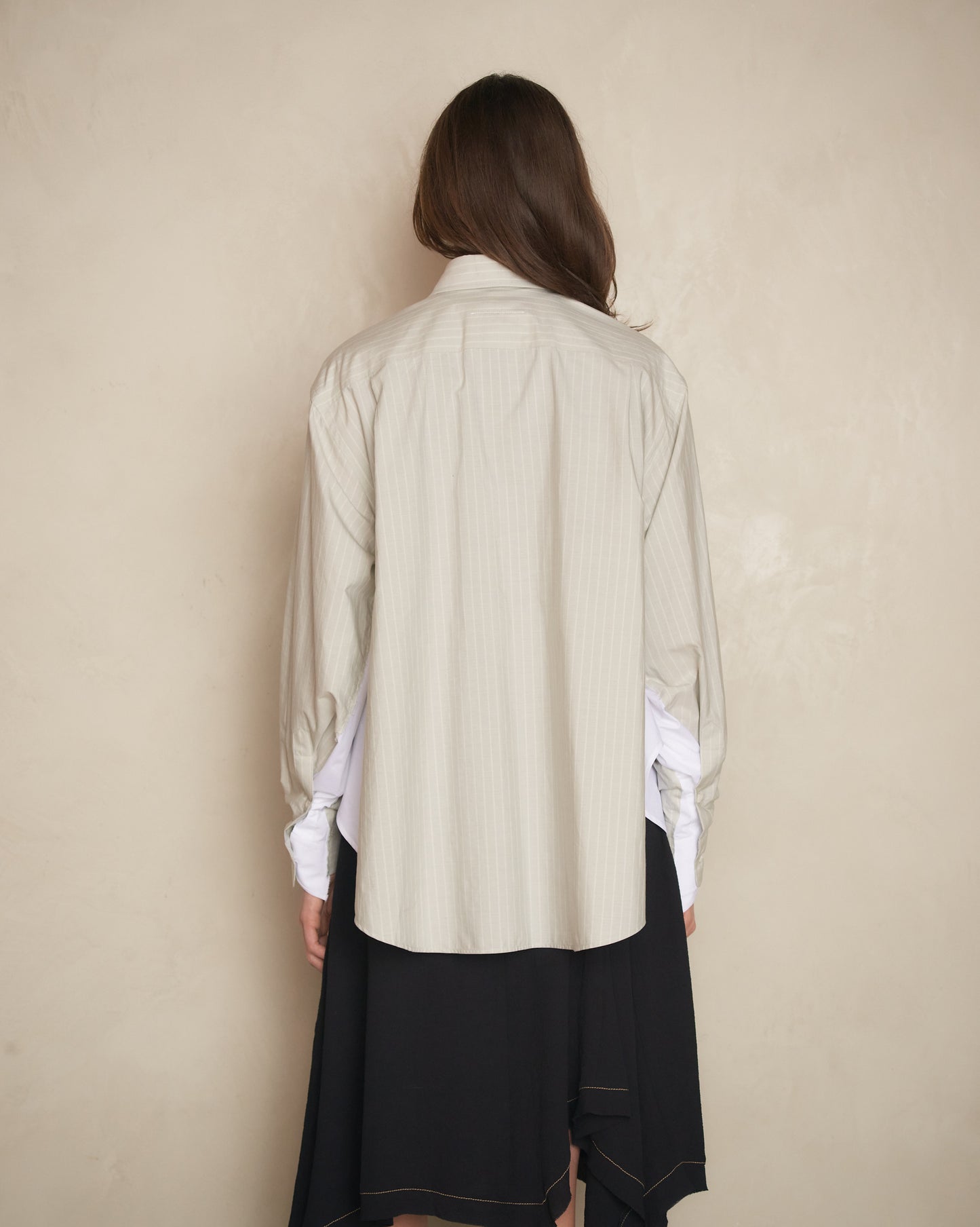Panelled shirt by MM6 Maison Margiela in grey stripe. Buttoned shirt in a soft grey striped cotton. Seemingly classic in style, extraneous side panels and reconstructed sleeves in contrasting white give extra volume and breeziness. Pointed collar and rounded hem.