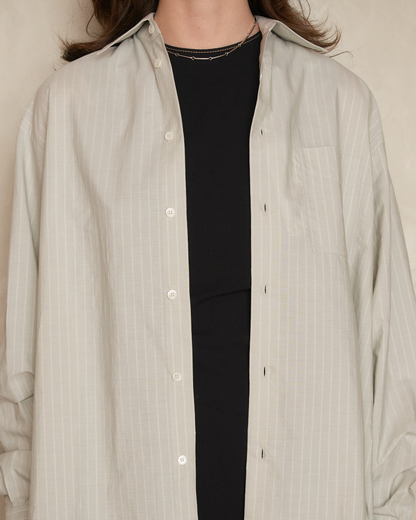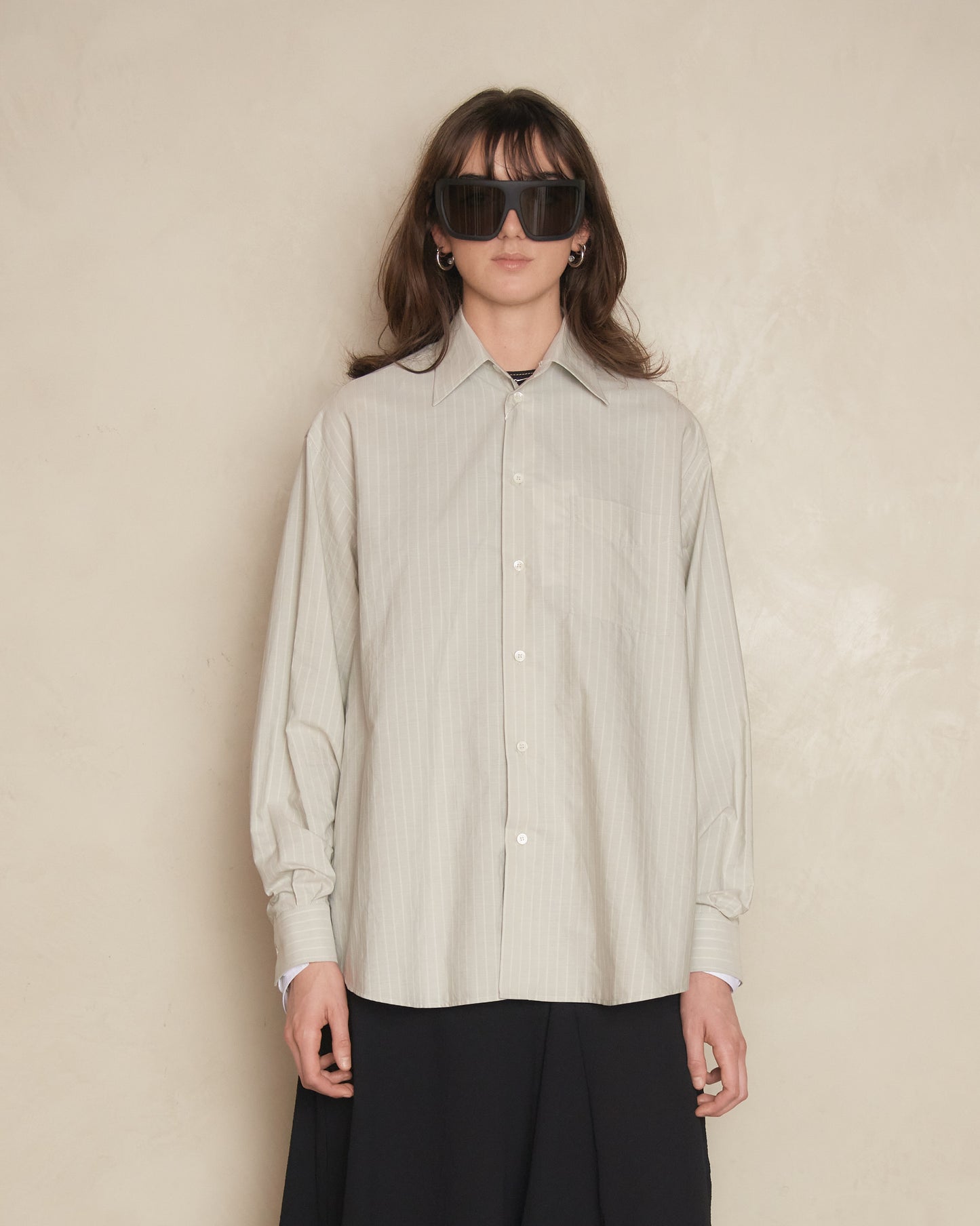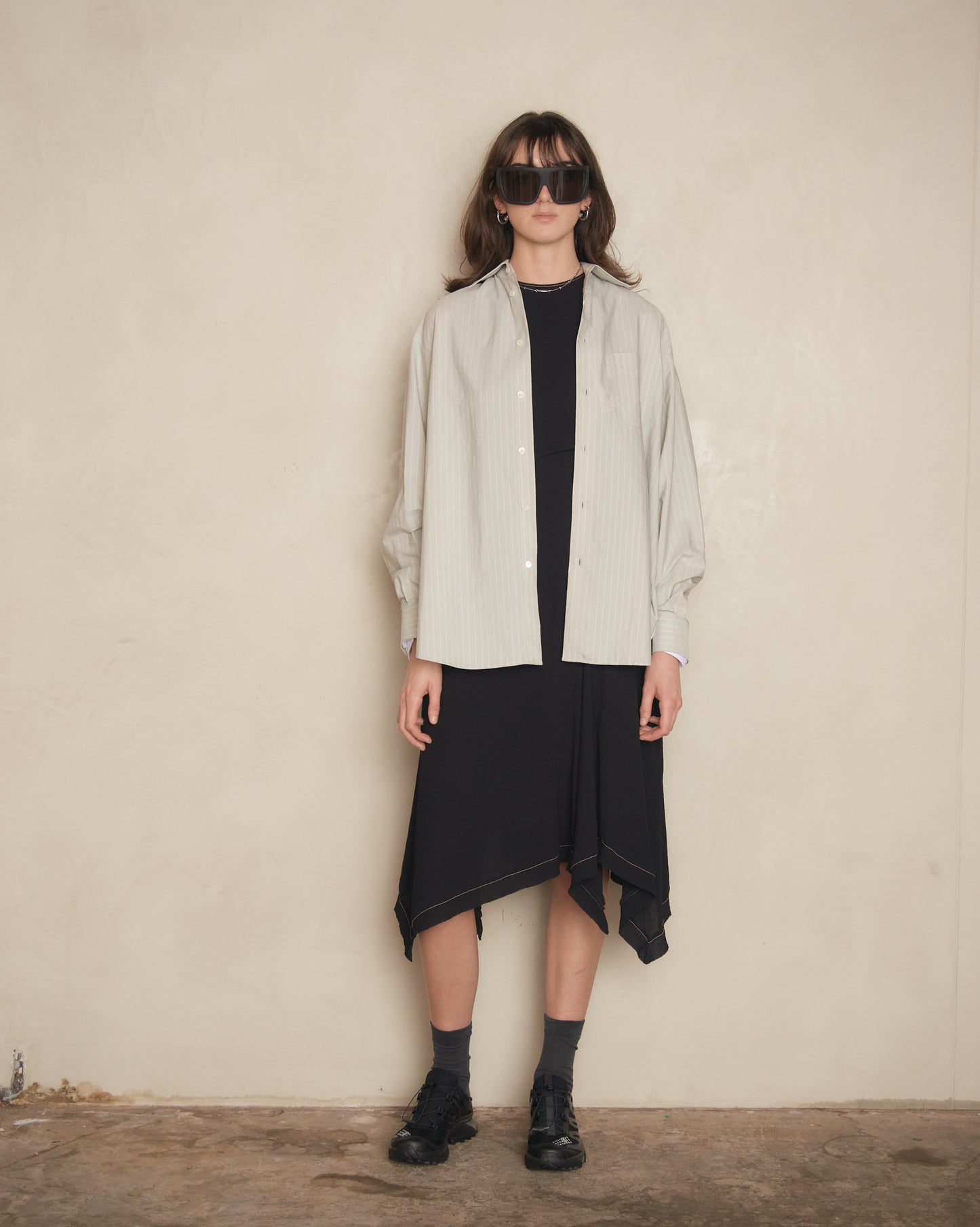 Panelled shirt by MM6 Maison Margiela in grey stripe. Buttoned shirt in a soft grey striped cotton. Seemingly classic in style, extraneous side panels and reconstructed sleeves in contrasting white give extra volume and breeziness. Pointed collar and rounded hem.