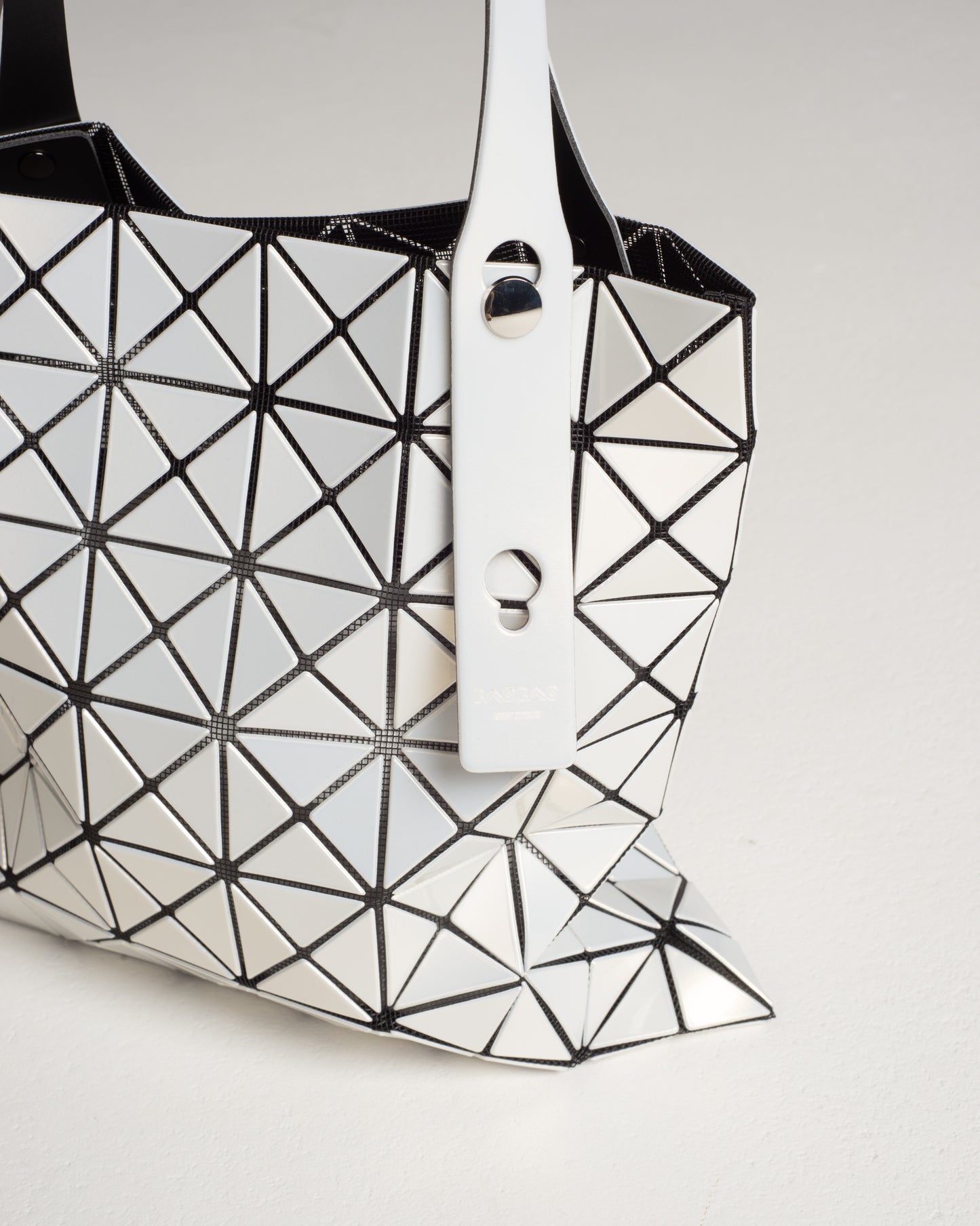 Prism tote bag by Bao Bao Issey Miyake. Iconic triangular tiles adhere to a nylon mesh netting to give this compact tote its geometric form and dynamic structure. Prism polarisation offers an opulent pearlescence that shifts and changes colour in the light. Adjustable handles and internal zipped pocket.