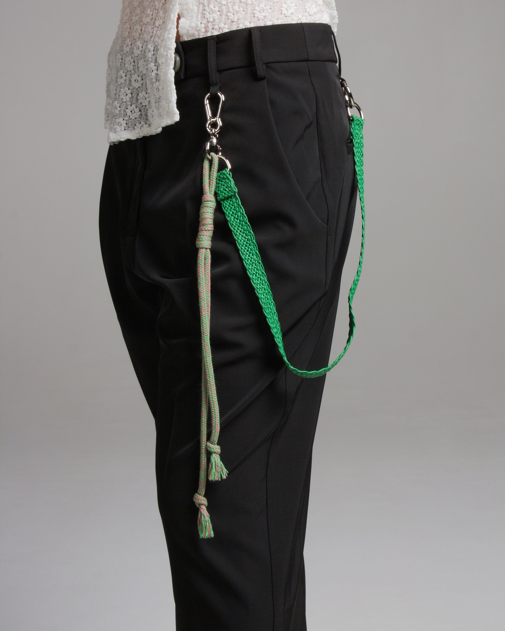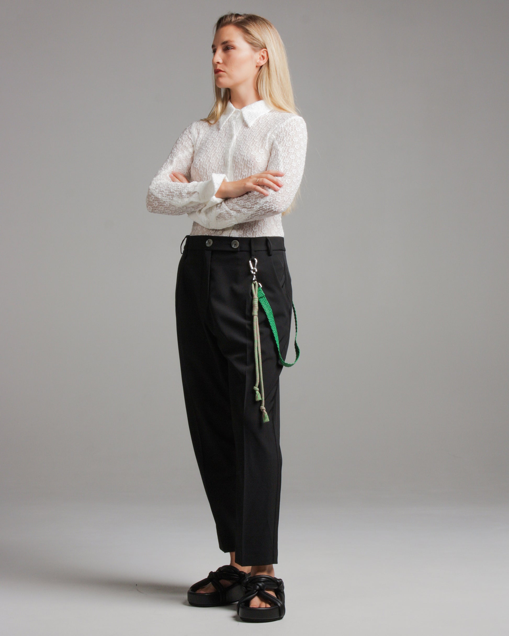 Poly tech tapered pant by Song for the Mute. Pleated trouser style with double button and fly closure. Structured at the waist before tapering at the ankles. Fluid blend of polyester with elastane has a slippery, sheened texture. Signature braided lanyard completes the look.