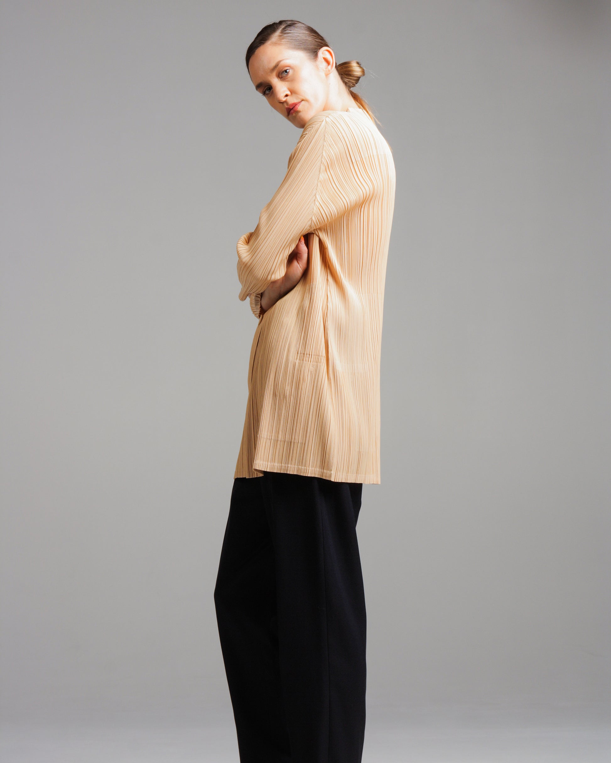 Slim cardigan by Pleats Please Issey Miyake in sand. Form-fitting elongated cardigan in thicker matte-finish pleating. Collarless style with sharply folded neckline creating triangular lapels. Adorned with large ornamental buttons and pockets at the sides.