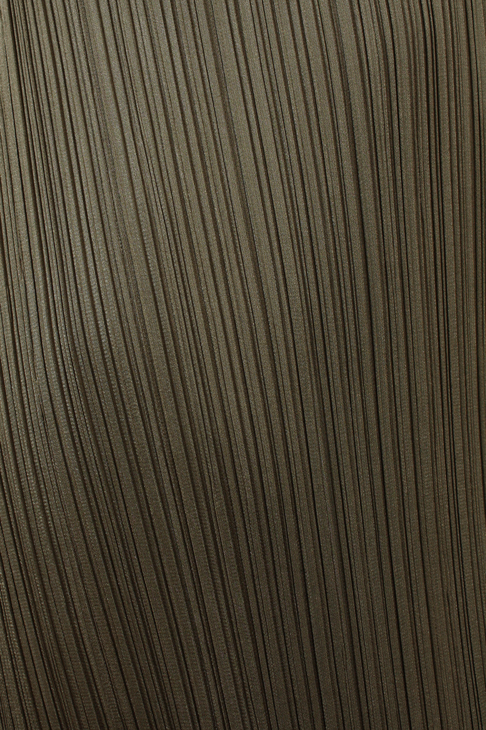 Sleeveless dress by Pleats Please Issey Miyake in khaki pleated fabric. Relaxed style with slightly rounded skirt. Hem falls around the knee.