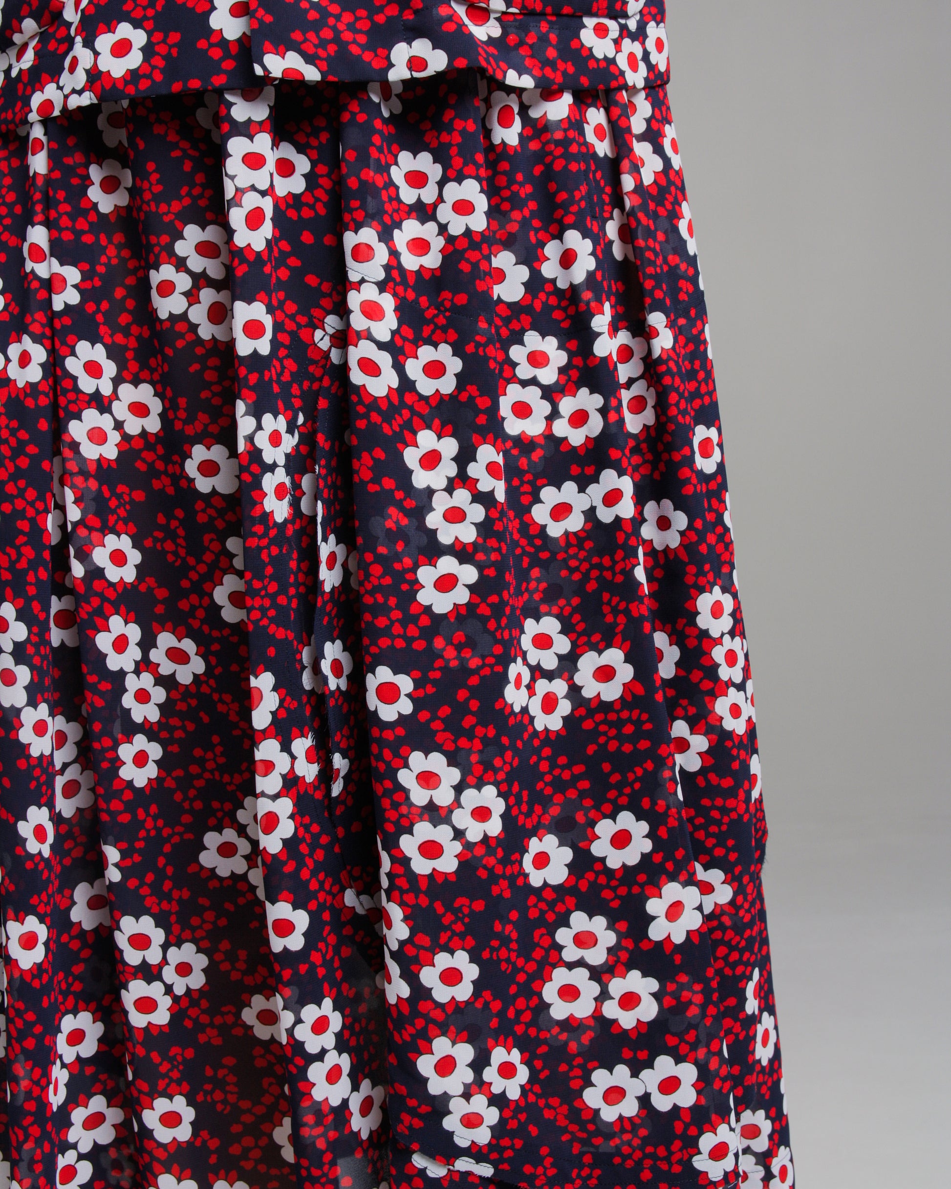 Red floral print skirt by Comme des Garçons Comme des Garçons. Lightweight and airy, crafted in fine crepe polyester. Intricate print of daisies and petals strewn throughout, with circular raw-cut panels fanning out on both sides to create an overlapping volume.