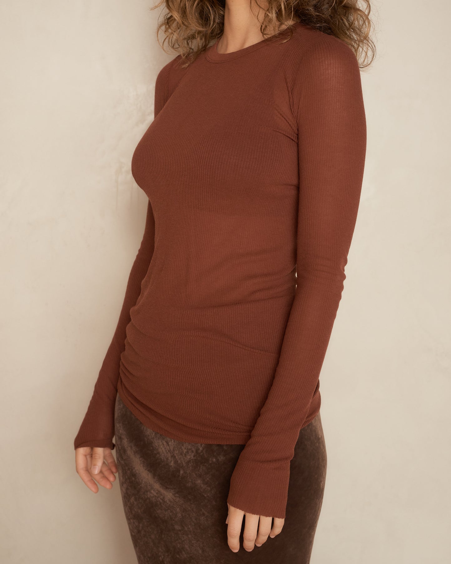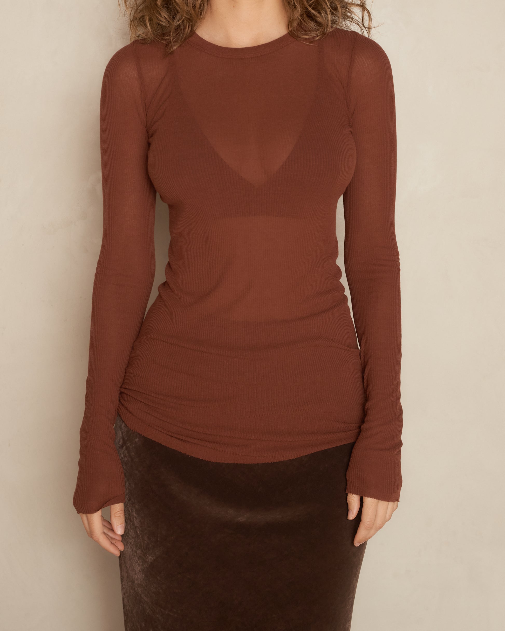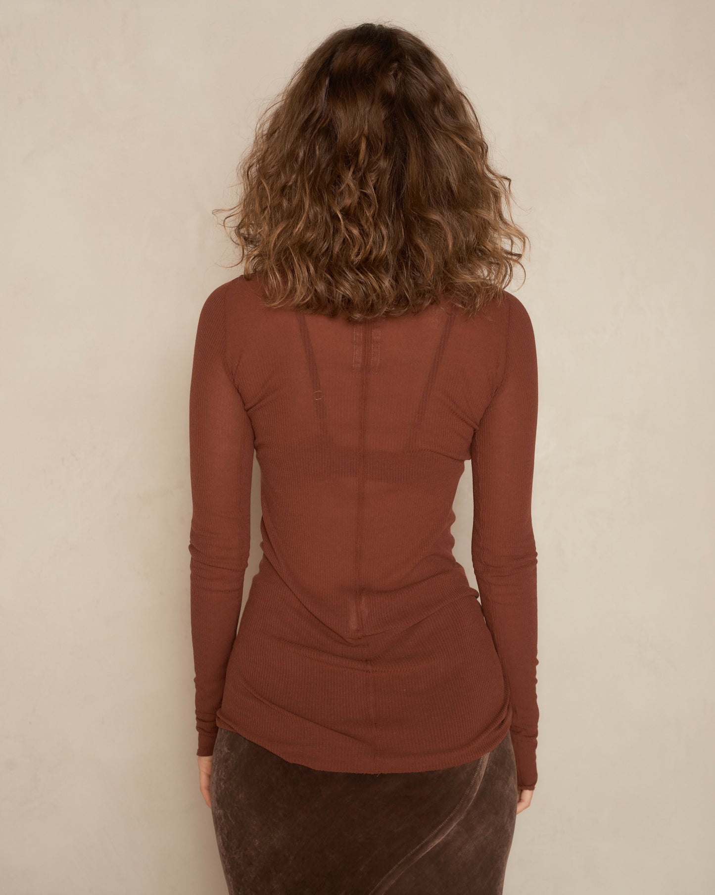 Classic rib longsleeve by Rick Owens in henna. Elegant below hip length with elongated sleeves. Ribbed round neckline balanced by raw cut hem and cuffs. Finely ribbed fabric provides a soft feel and seductive stretch. The garment sits artfully across the hips with a relaxed drape and slim fit.