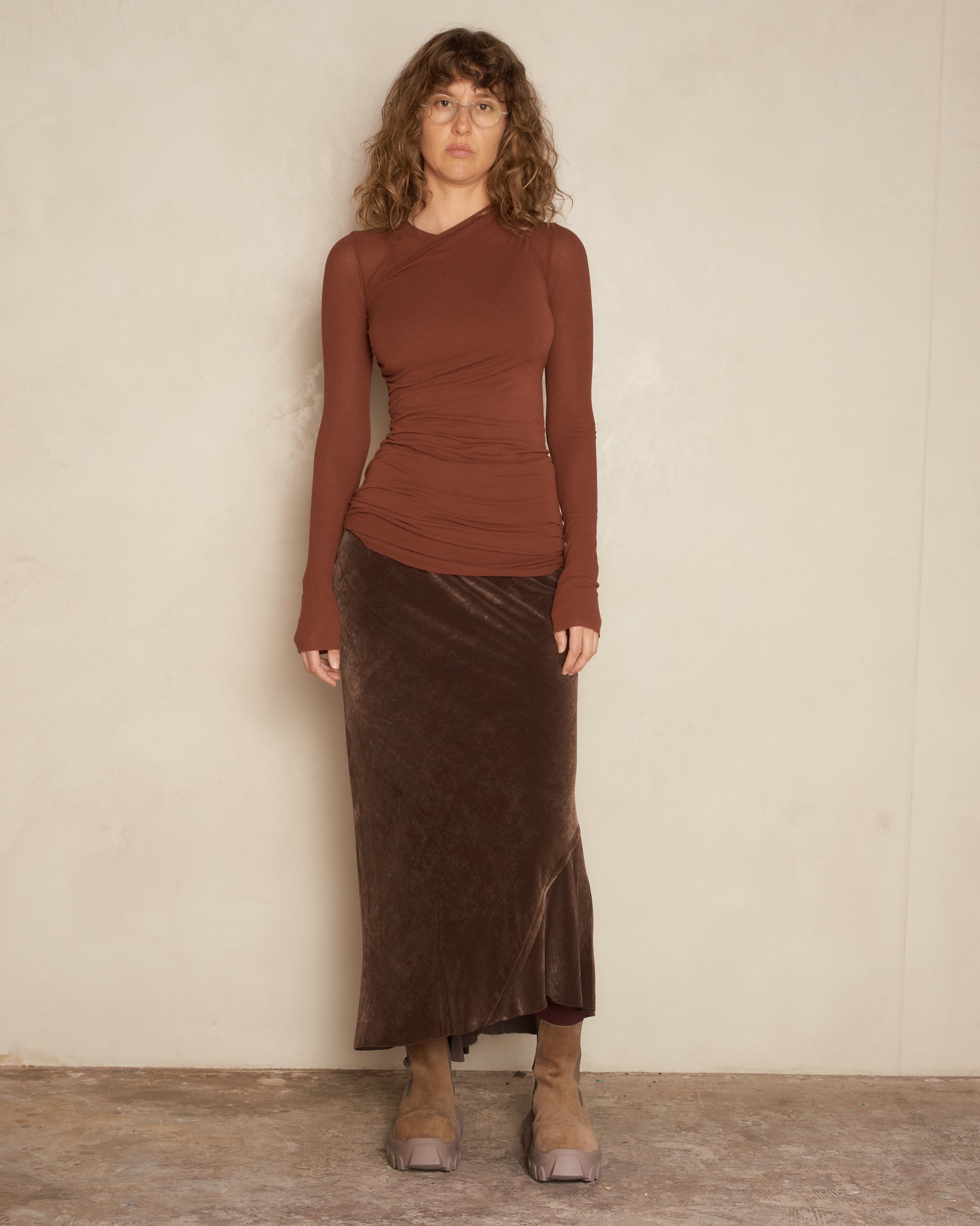 Pictured with Brown Velvet Calf Bias Skirt and Dust Beatle Bozo Tractor Boots by Rick Owens.