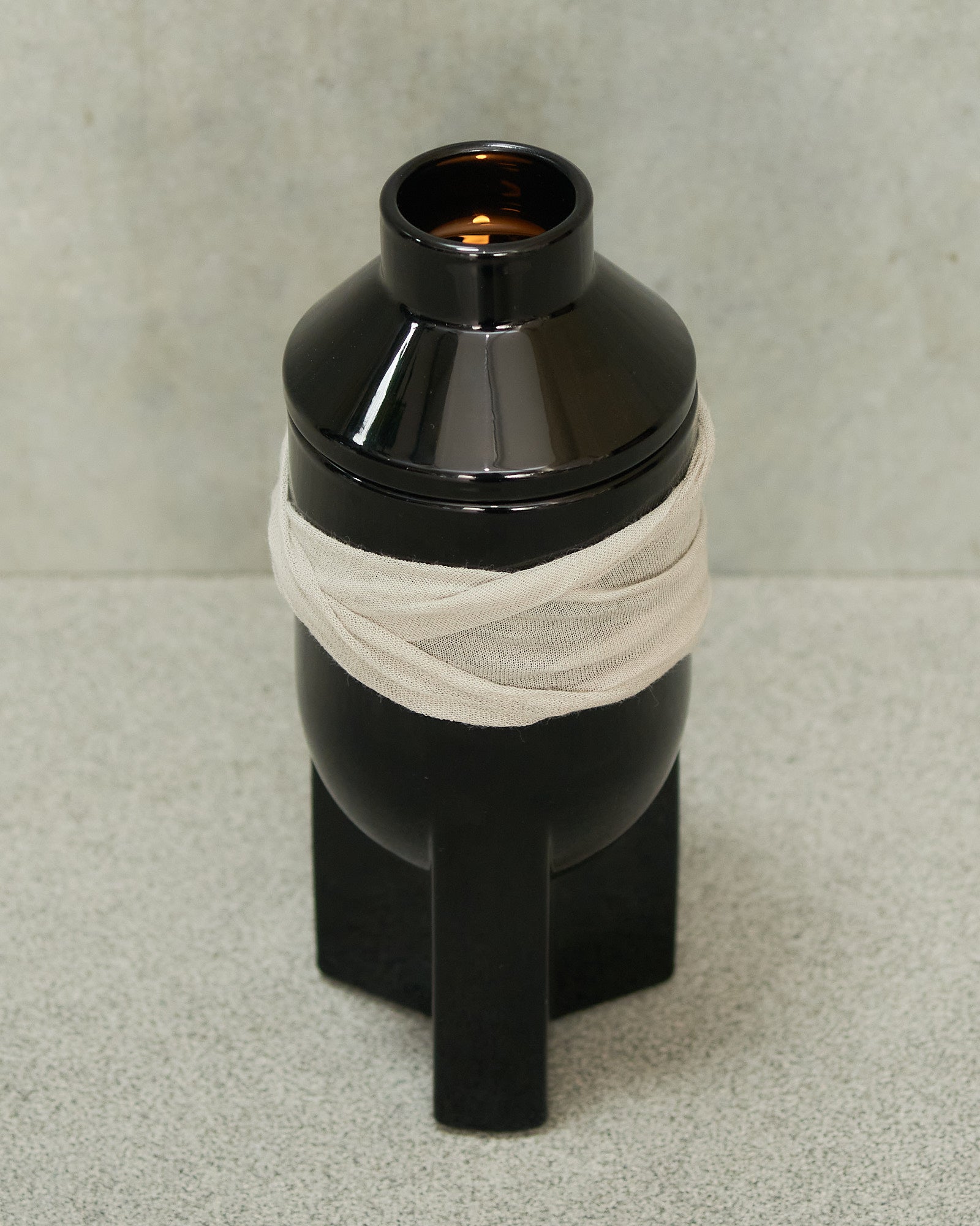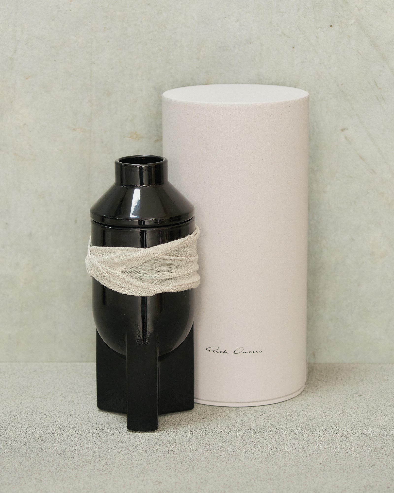L'Apparition Candle by Rick Owens. Hand-poured in France and encased in a sculptural black glass vessel, this vegetable-based candle releases haunting notes of lotus, labdanum, myrrh, frankincense, and ambergris, crafted from ethically sourced natural ingredients.