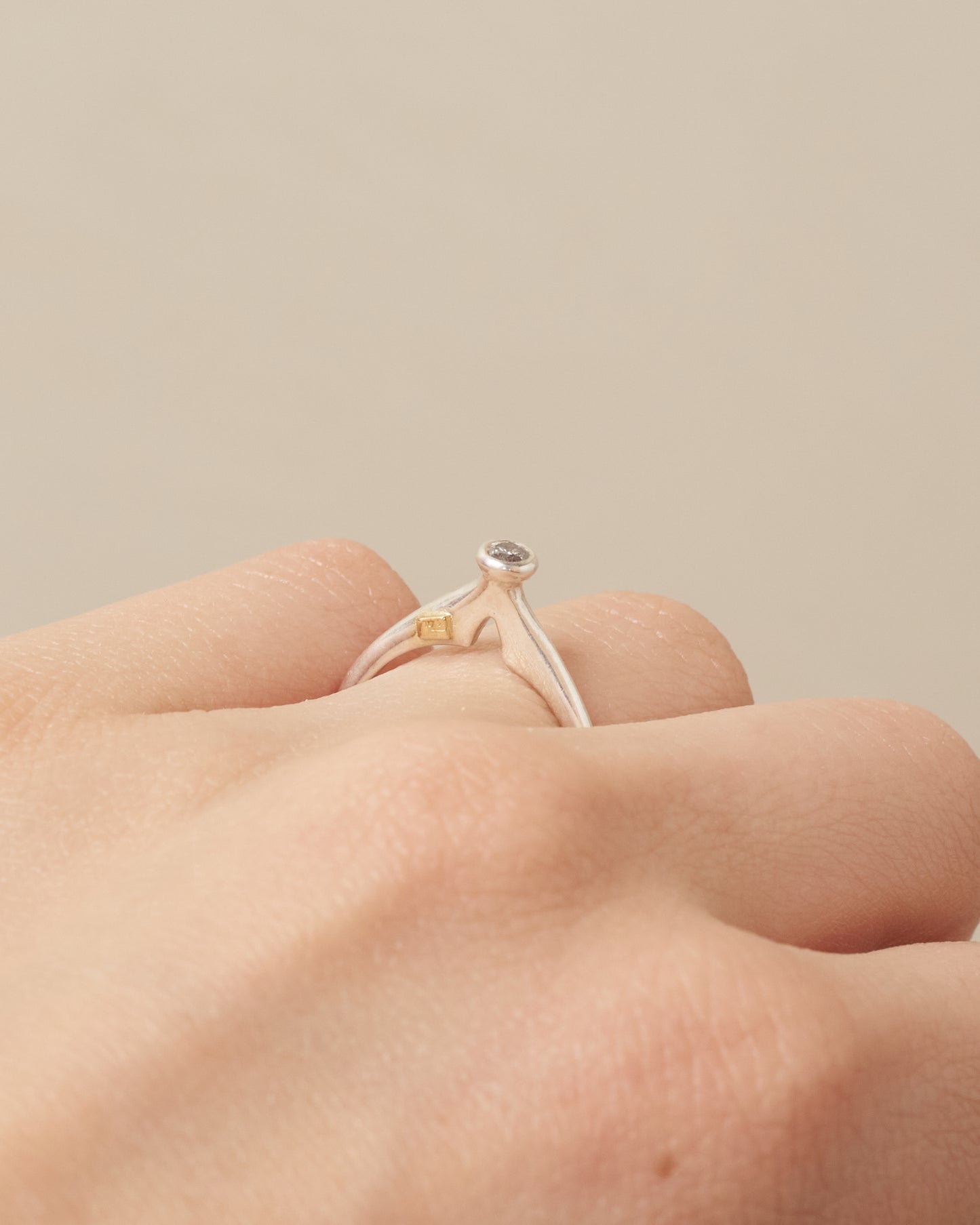 Aya ring by Rosa Maria with icy grey diamond. Remarkably subtle yet opulent sterling silver band set with a single icy grey diamond at its centre.