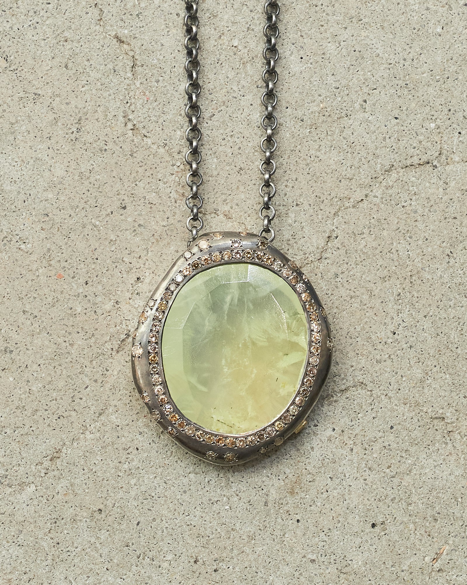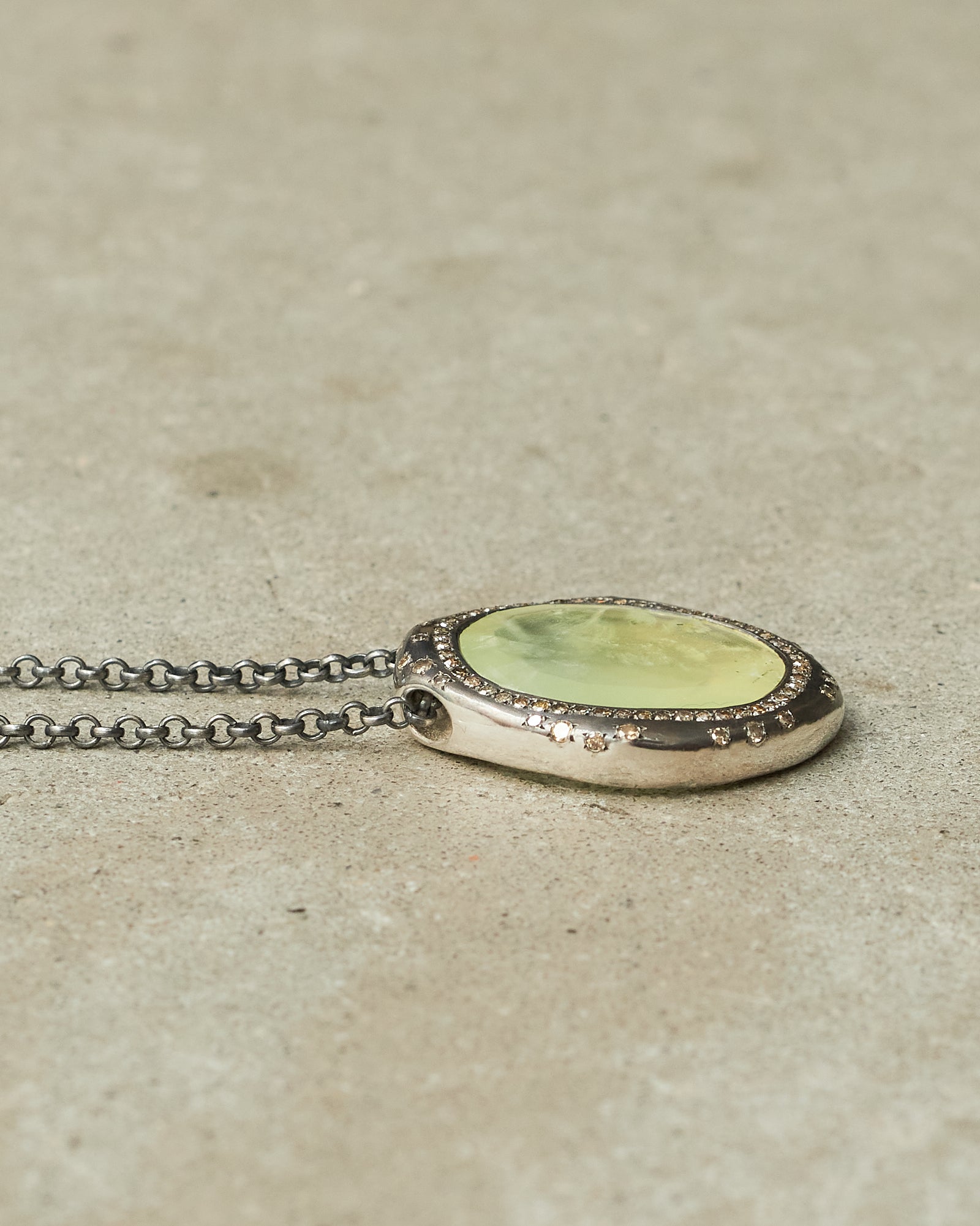 Pe Olympe necklace by Rosa Maria. Sterling silver pendant set with seventy-three cognac diamonds encircling a single vivid green prehnite, its translucent marbled surface creating a strikingly luminous centrepiece.