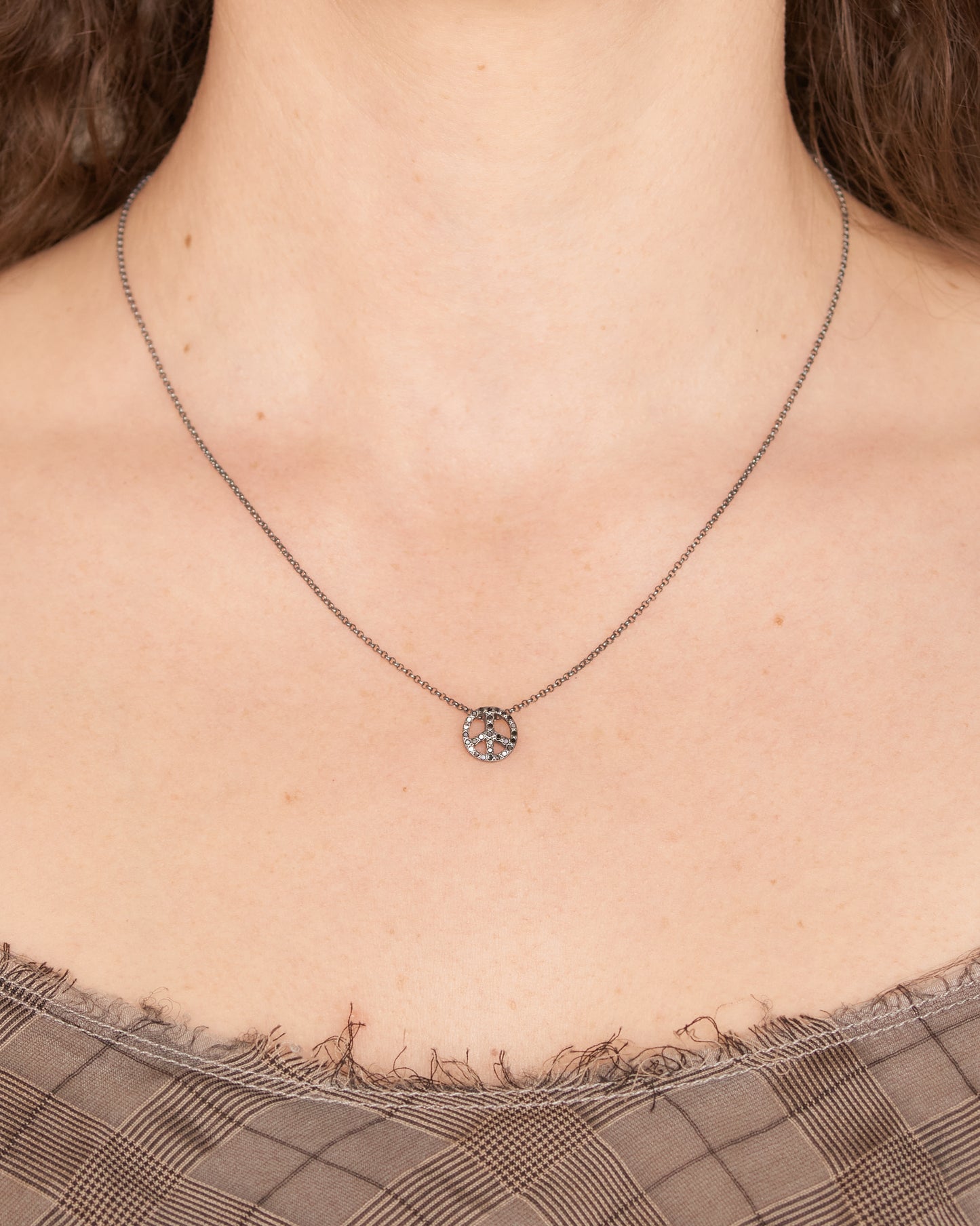 Pe black diamond necklace by Rosa Maria. The peace symbol forms a dainty pendant on this sterling silver chain necklace, set with thirty-eight small black diamonds outlining the shape.