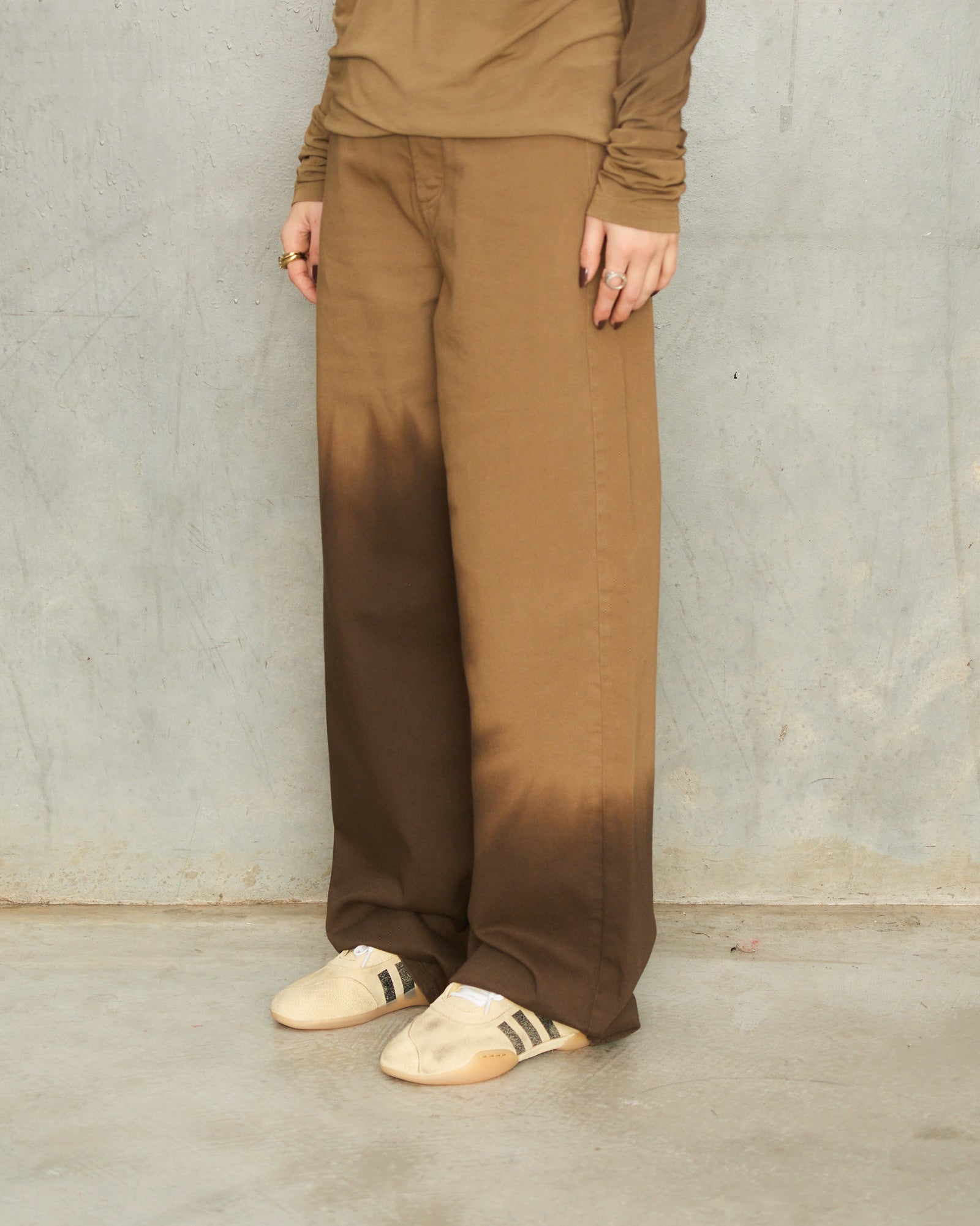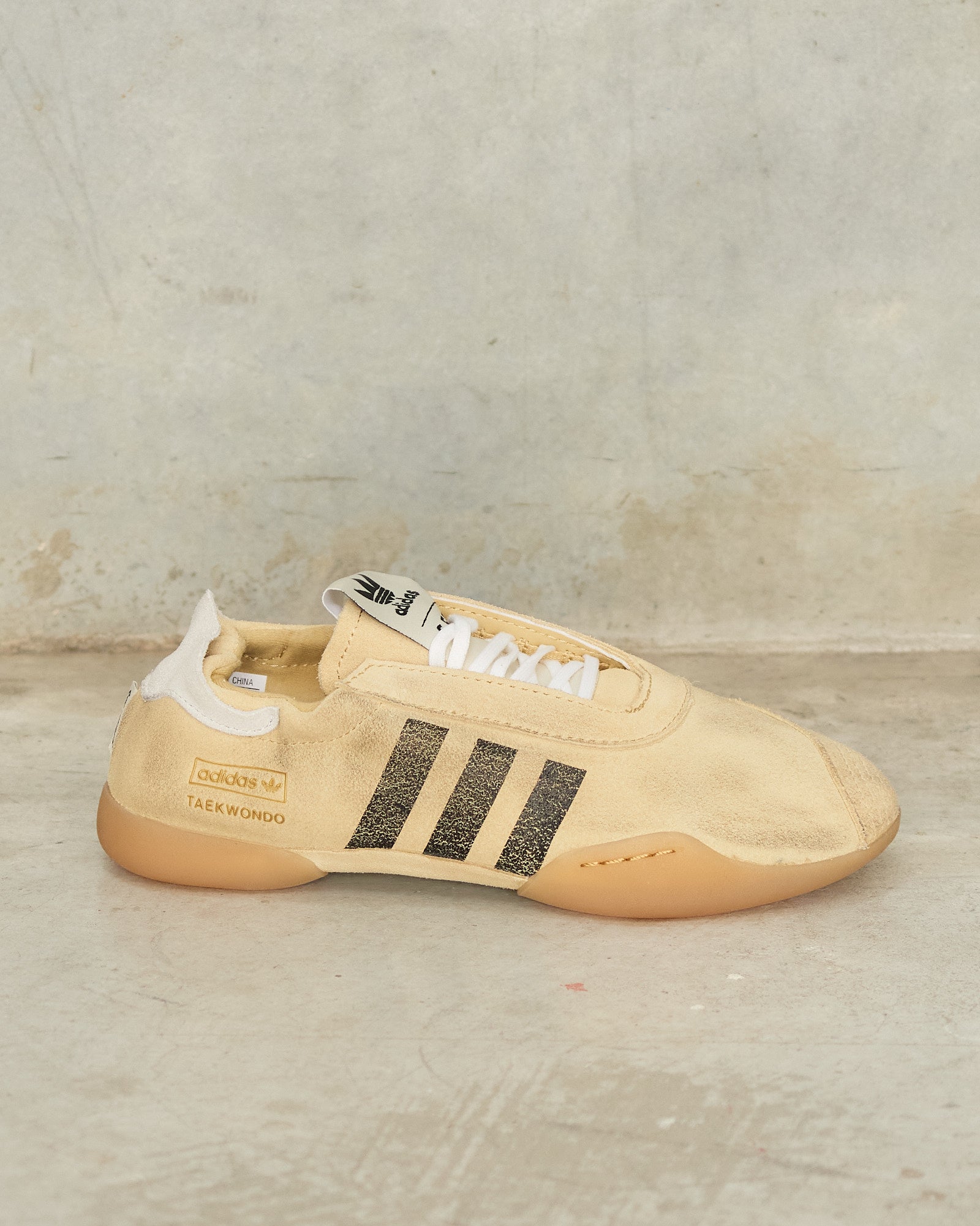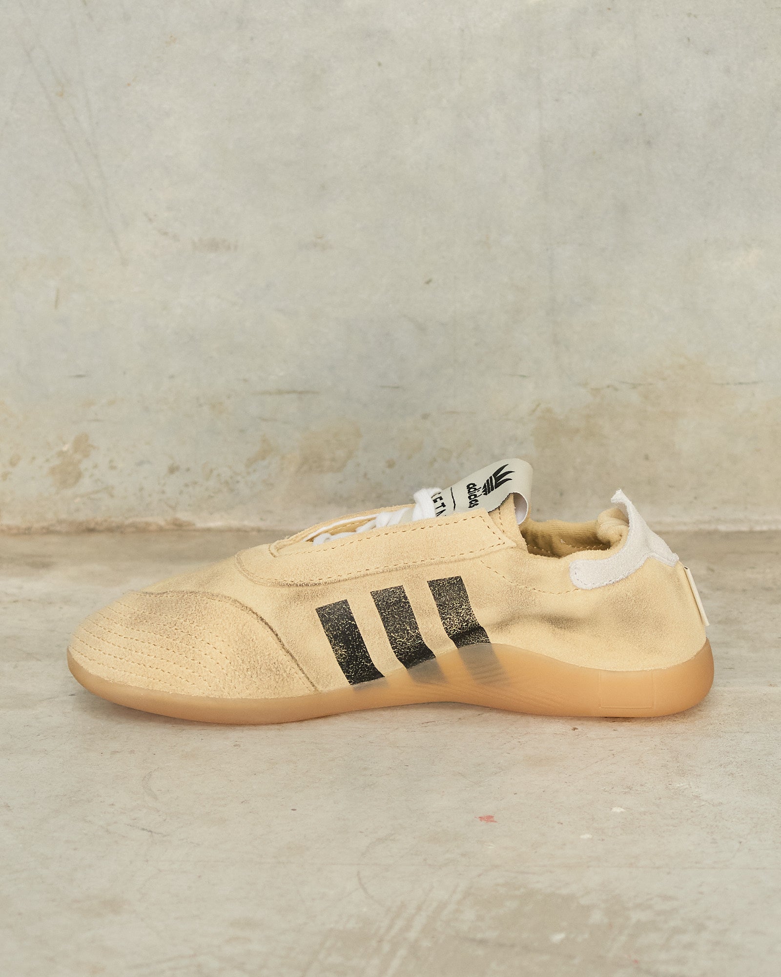 Taekwondo Mei Sneakers by Song for the Mute x adidas in beige. An archival adidas silhouette is reinterpreted with a refined perspective. Constructed in brushed suede, the upper carries a muted warmth, softened further by tonal stitching and raw-edged detailing. Contrasting black three-stripe marks anchor the side profile, with gold foil lettering and an exposed heel tab nodding to its origins. An elasticated heel lock secures the fit with ease, completed by co-branded tongue labels and a low-profile rubber sole. Each pair is individually distressed, ensuring no two are ever alike.