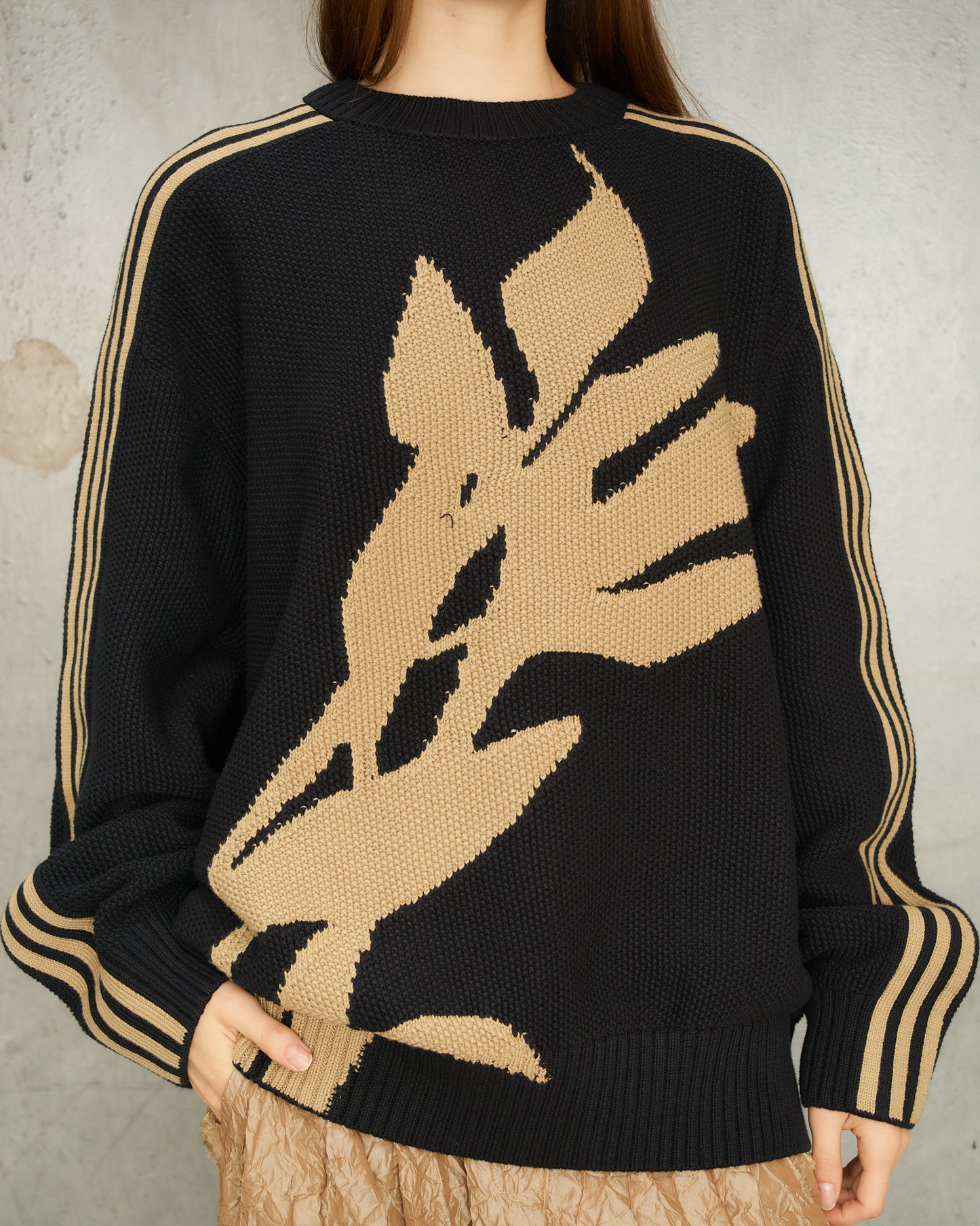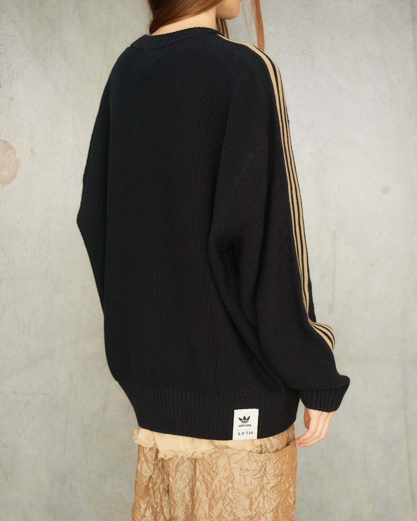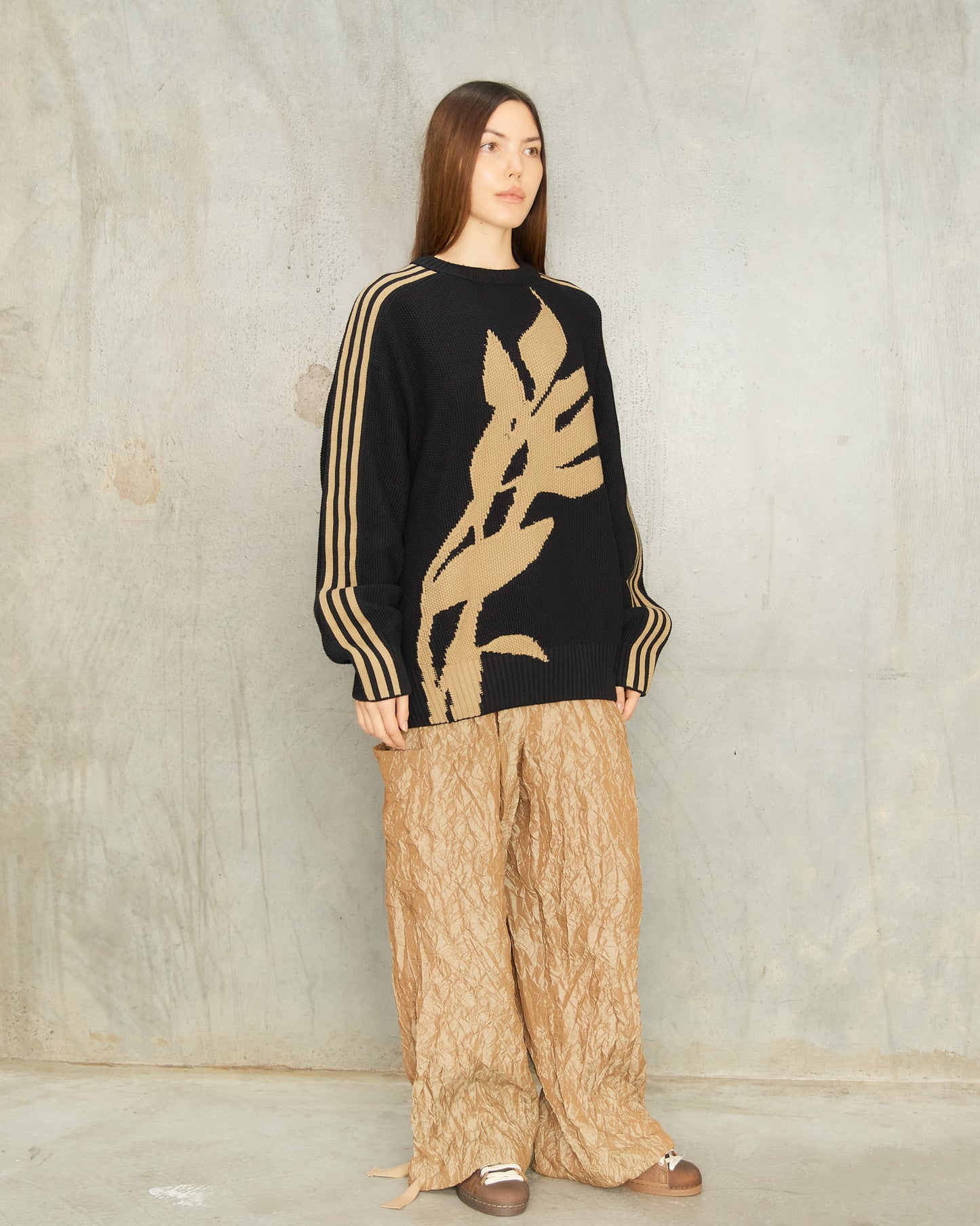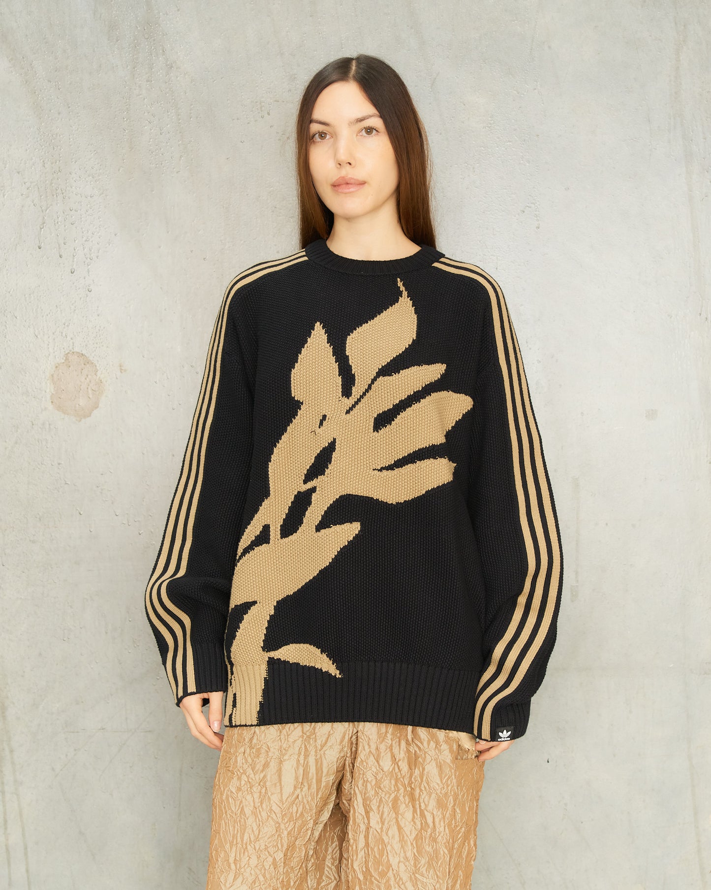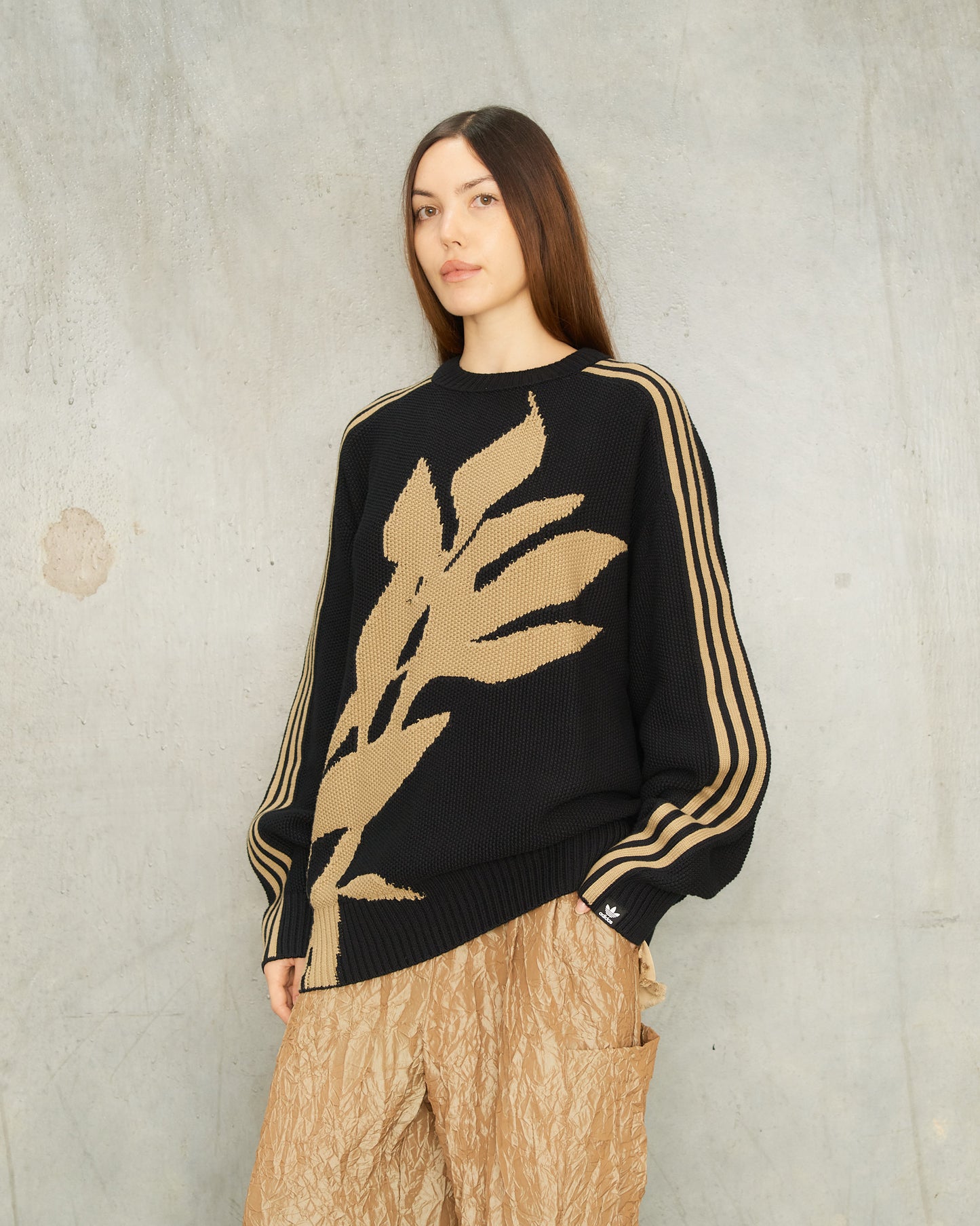 The black crewneck sweater from the Song for the Mute x Adidas Originals collaboration is crafted from a soft, lightweight 100% cotton knit. This piece blends comfort with bold design. The intricate floral jacquard pattern on the front adds a refined touch, while Adidas' iconic 3 stripes along the sleeves make a statement.