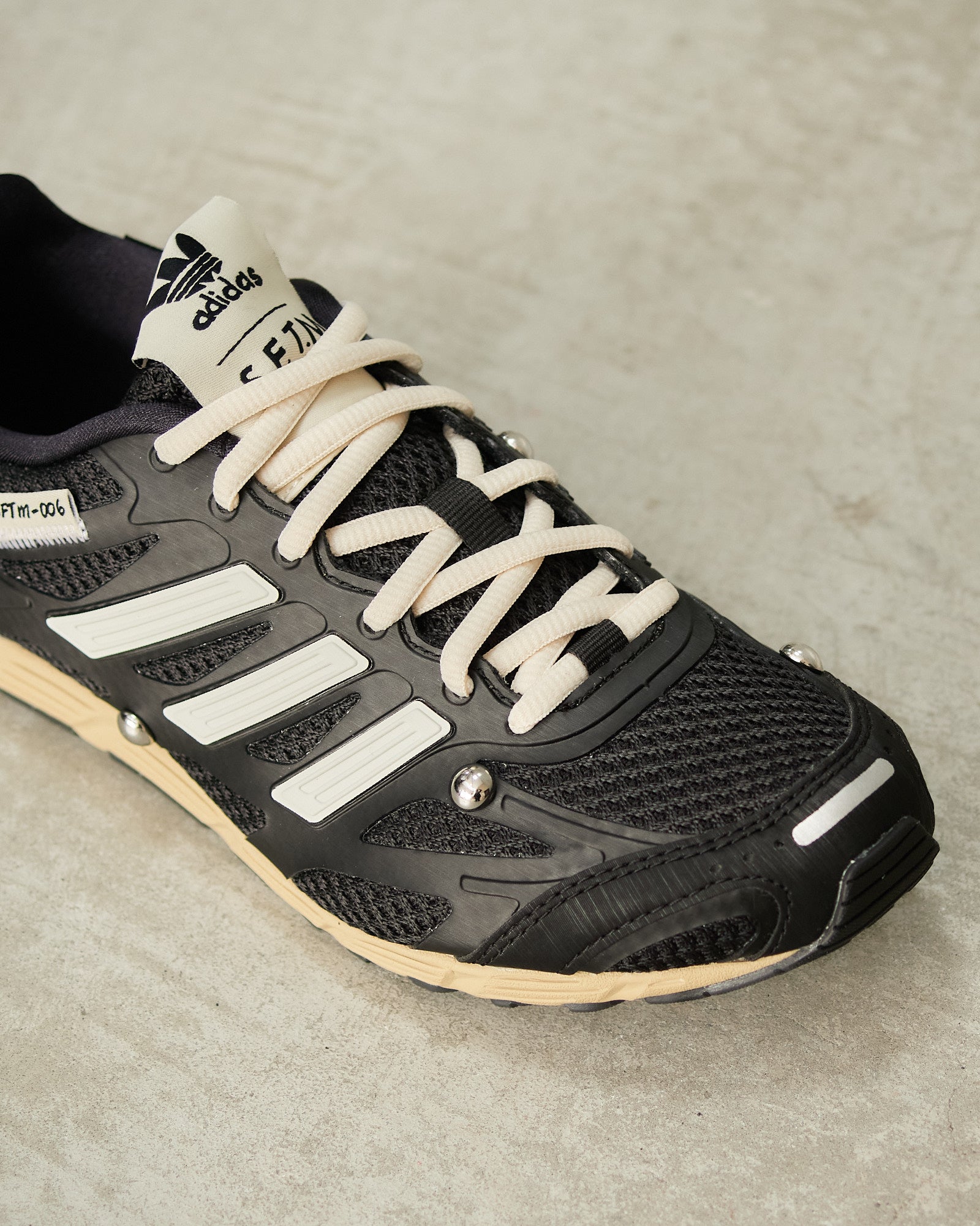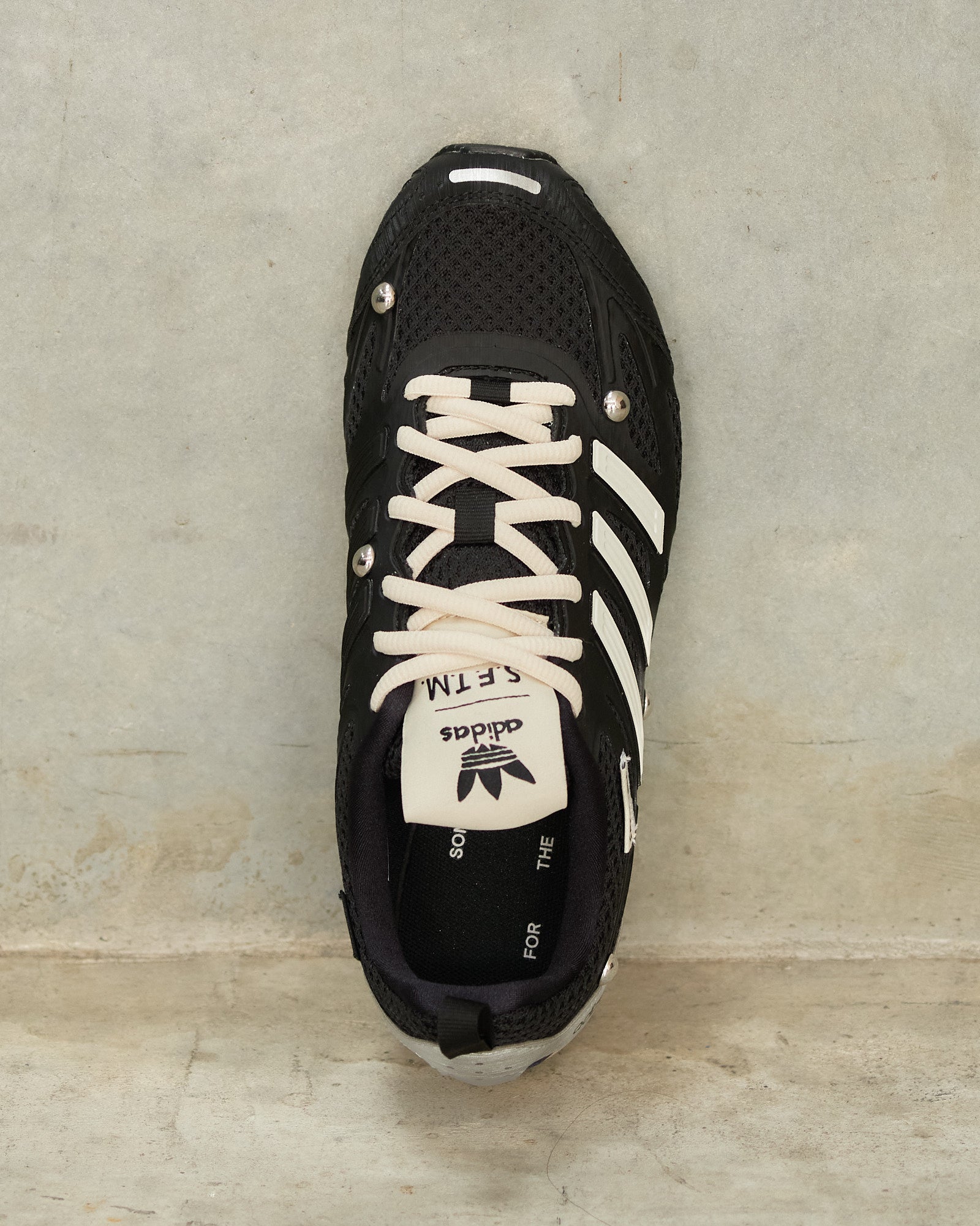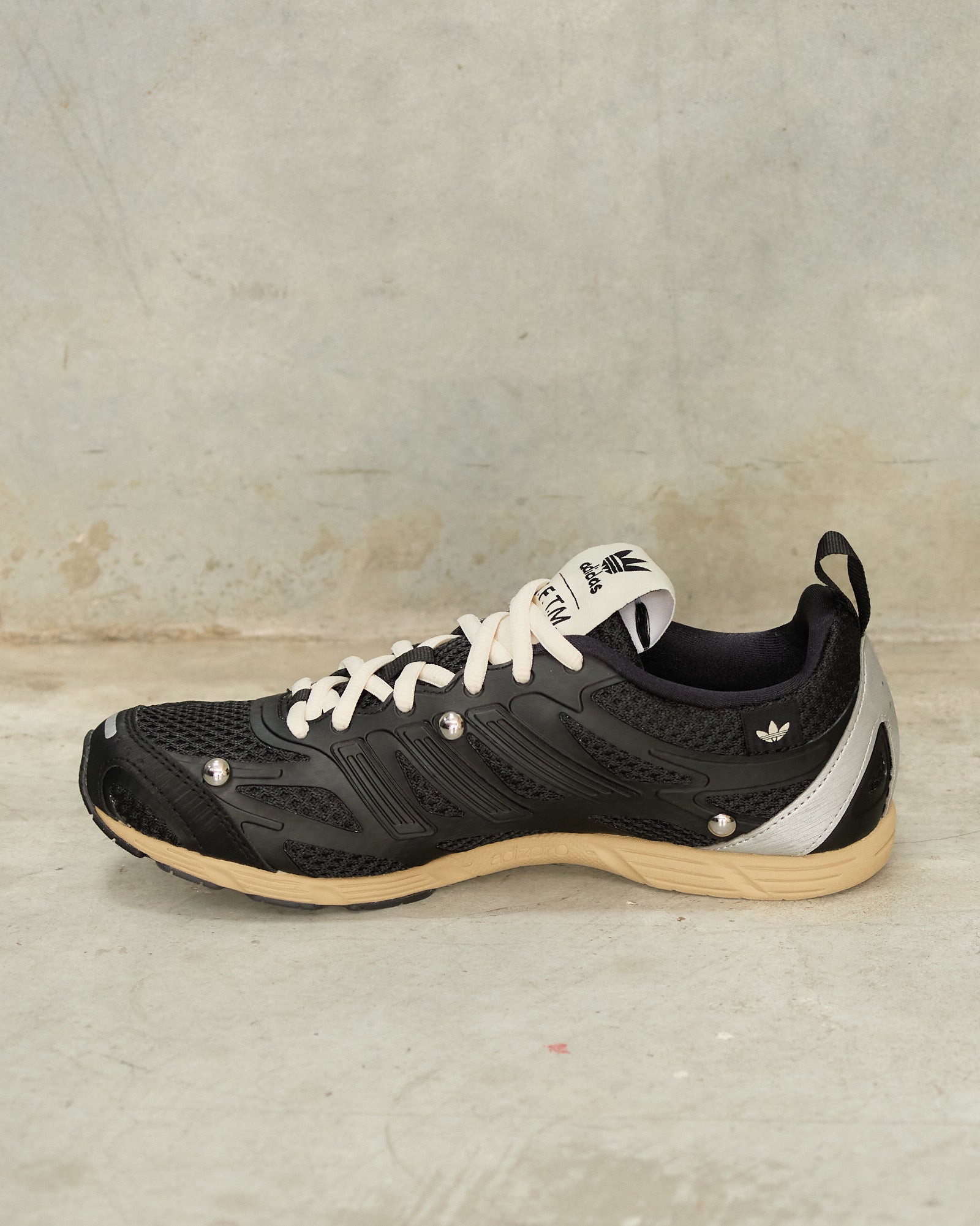 The Adizero PR sneakers by Song for the Mute x adidas in black. An update to a performance running silhouette with subtle Song for the Mute detailing. The lightweight mesh upper is reinforced with layered synthetic panels, while silver metal studs adorn the sneaker. A co-branded tongue label highlights the collaboration, paired with reflective 3-Stripes. A beige midsole grounds the design.