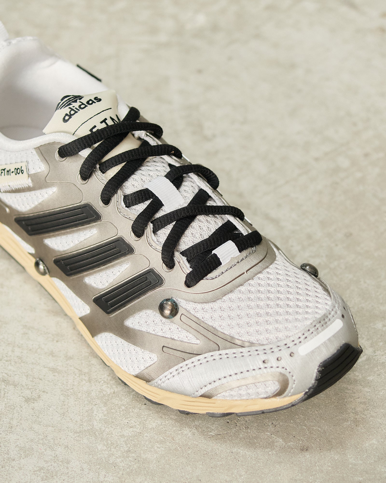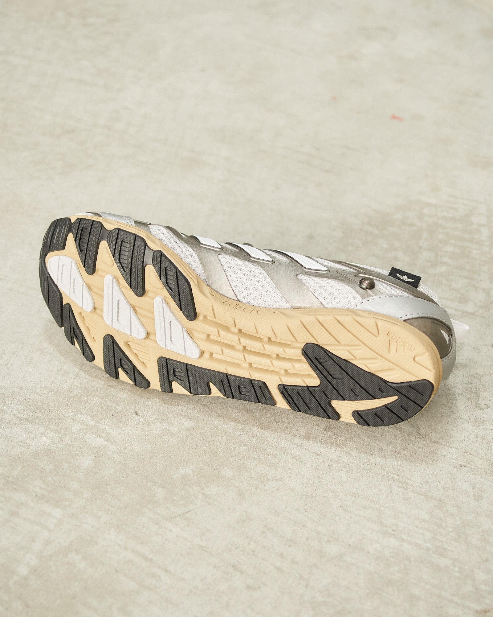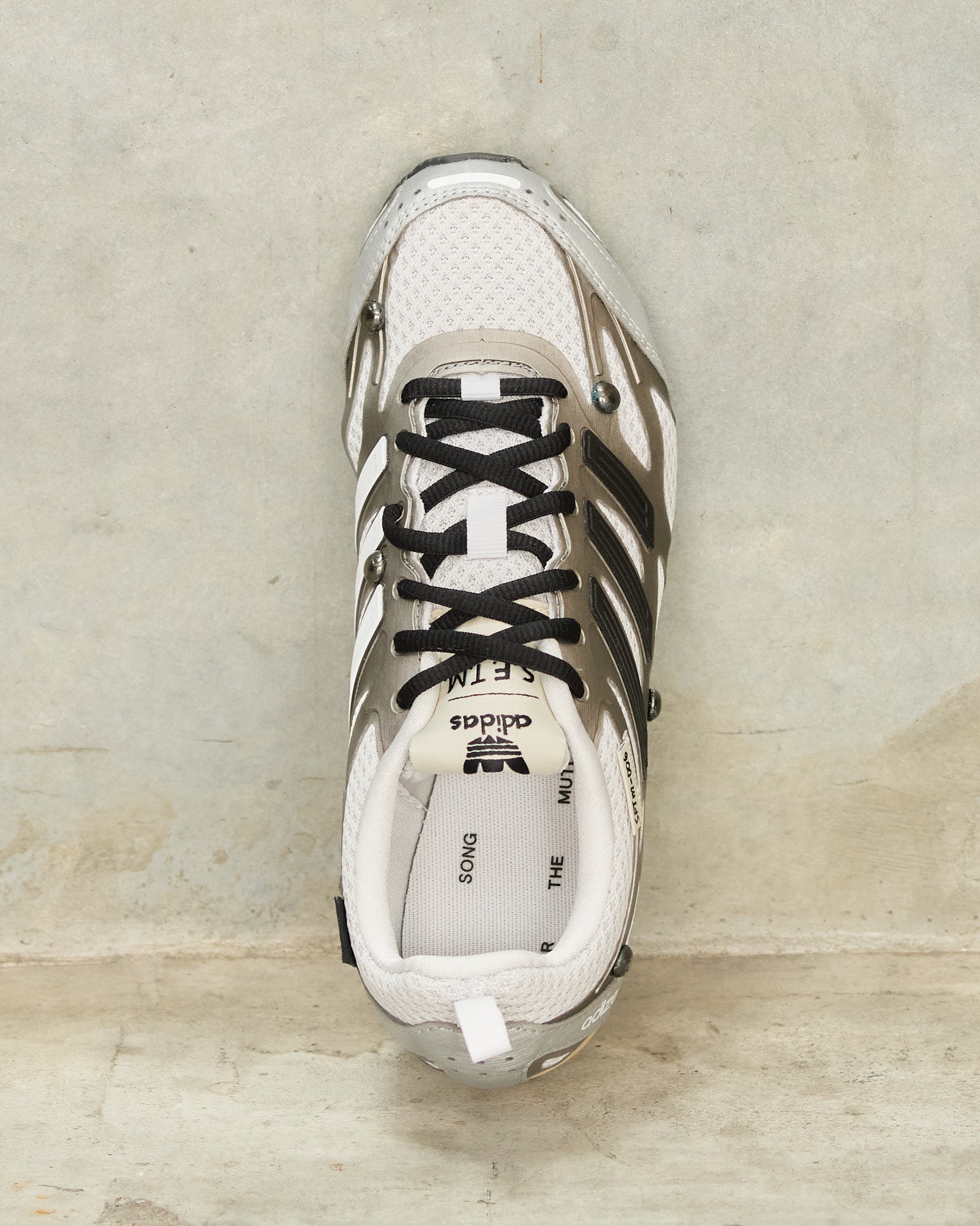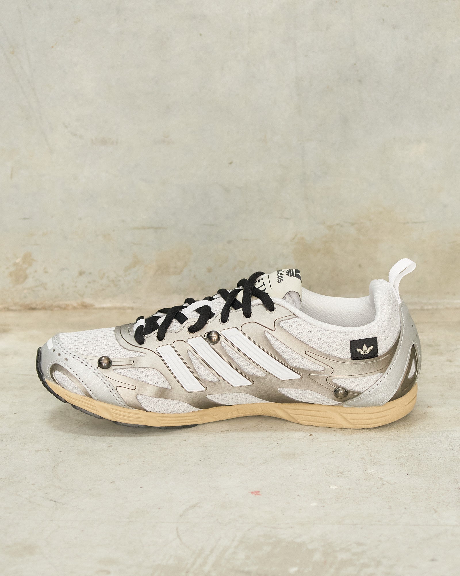 The Adizero PR sneakers by Song for the Mute x adidas in silver. An update to a performance running silhouette with subtle Song for the Mute detailing. The lightweight mesh upper is reinforced with layered synthetic panels, while silver metal studs adorn the sneaker. A co-branded tongue label highlights the collaboration, paired with reflective 3-Stripes. A beige midsole grounds the design.