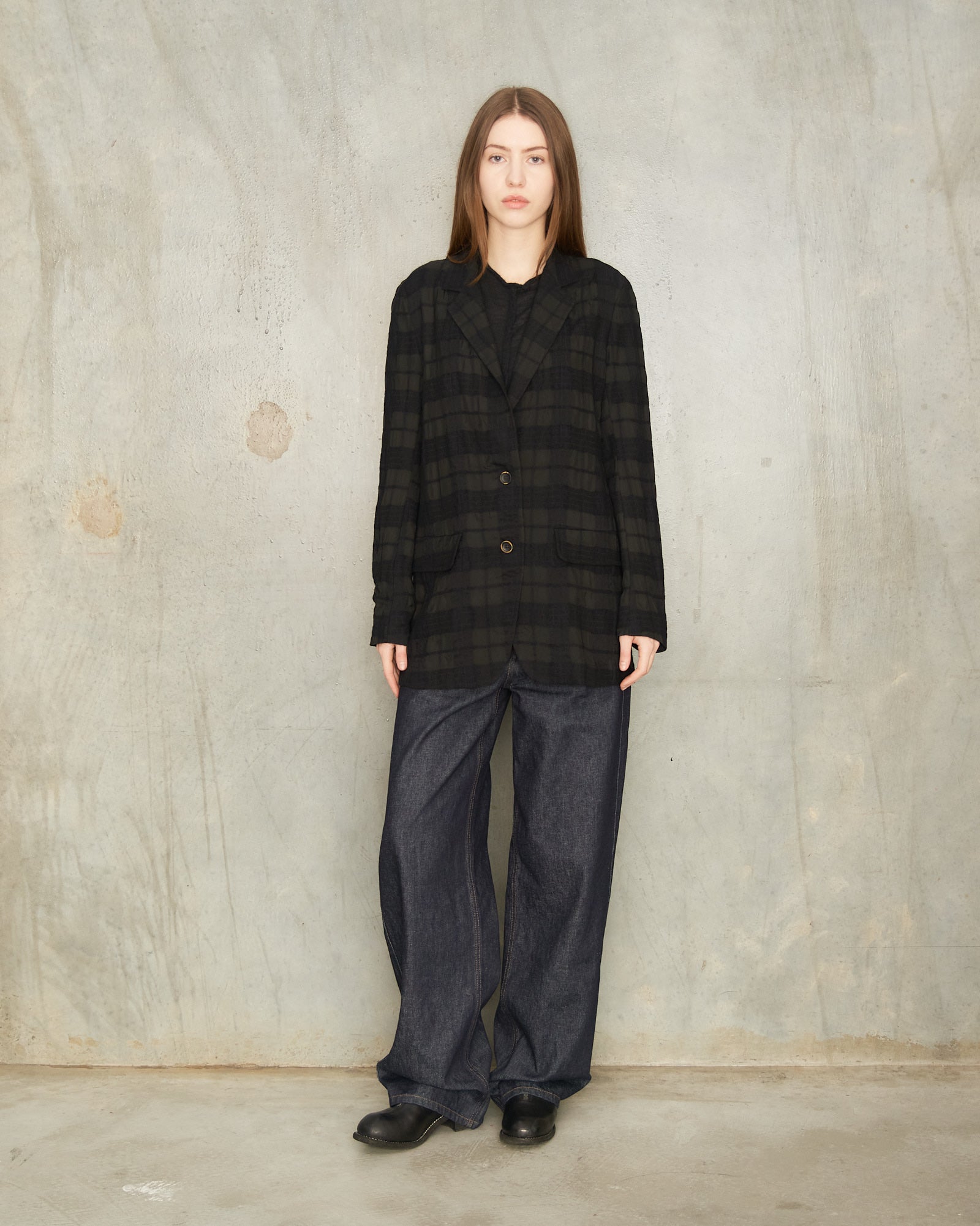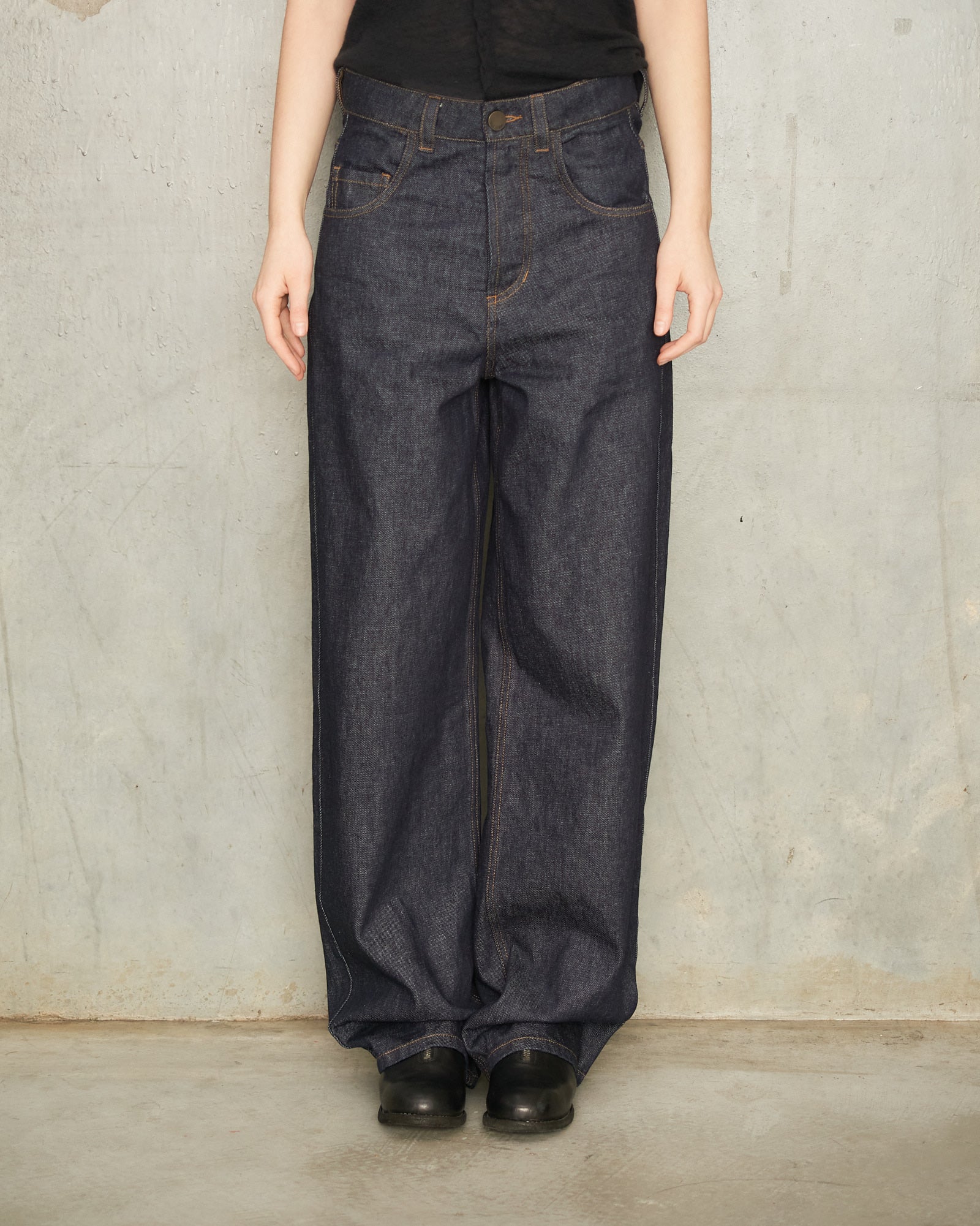 Phyllis jeans by Uma Wang in blue. Mid-rise denim with a wide, baggy leg and rich indigo hue. Features a studded fly closure, subtle stud accents throughout and a leather logo patch at the waist.