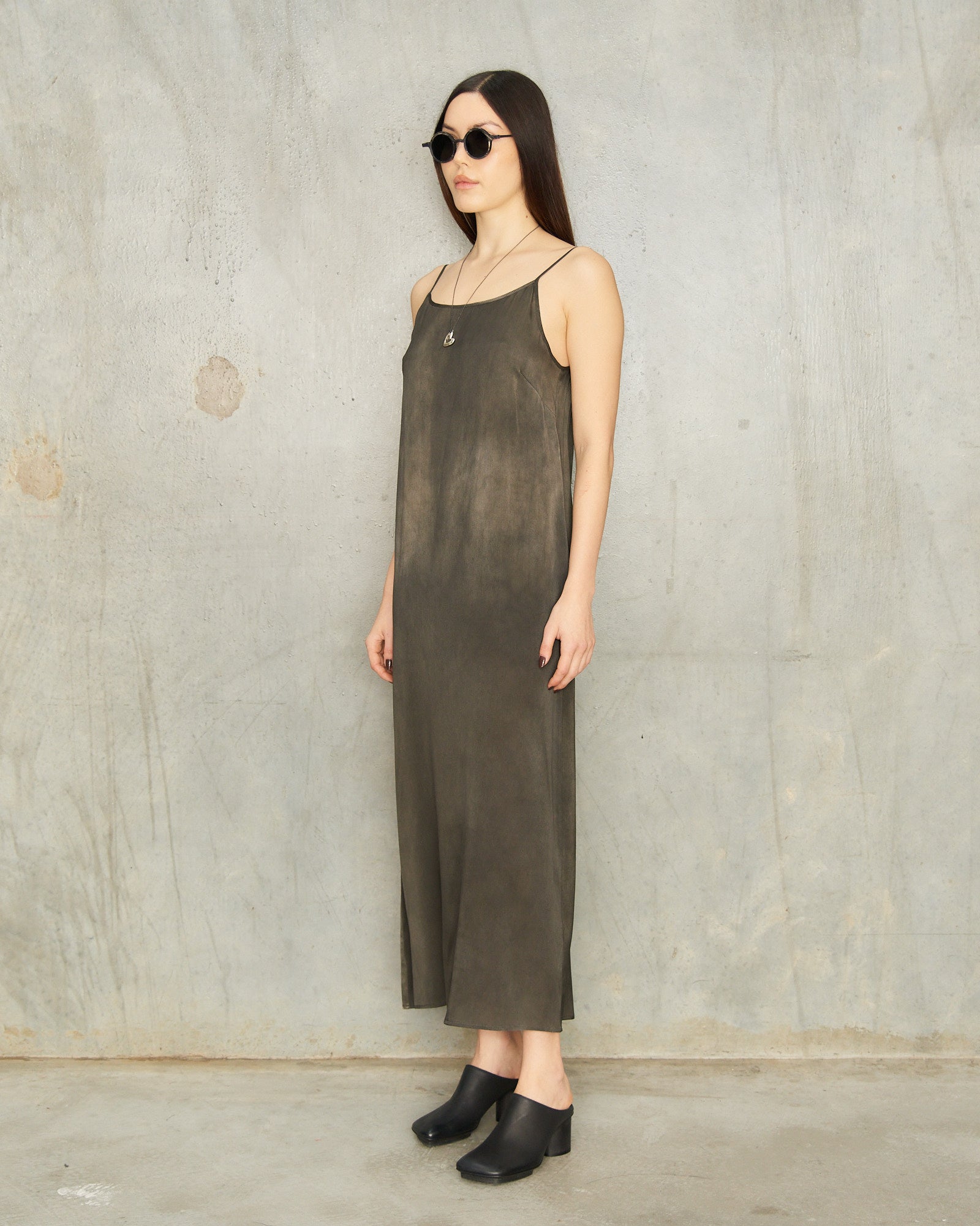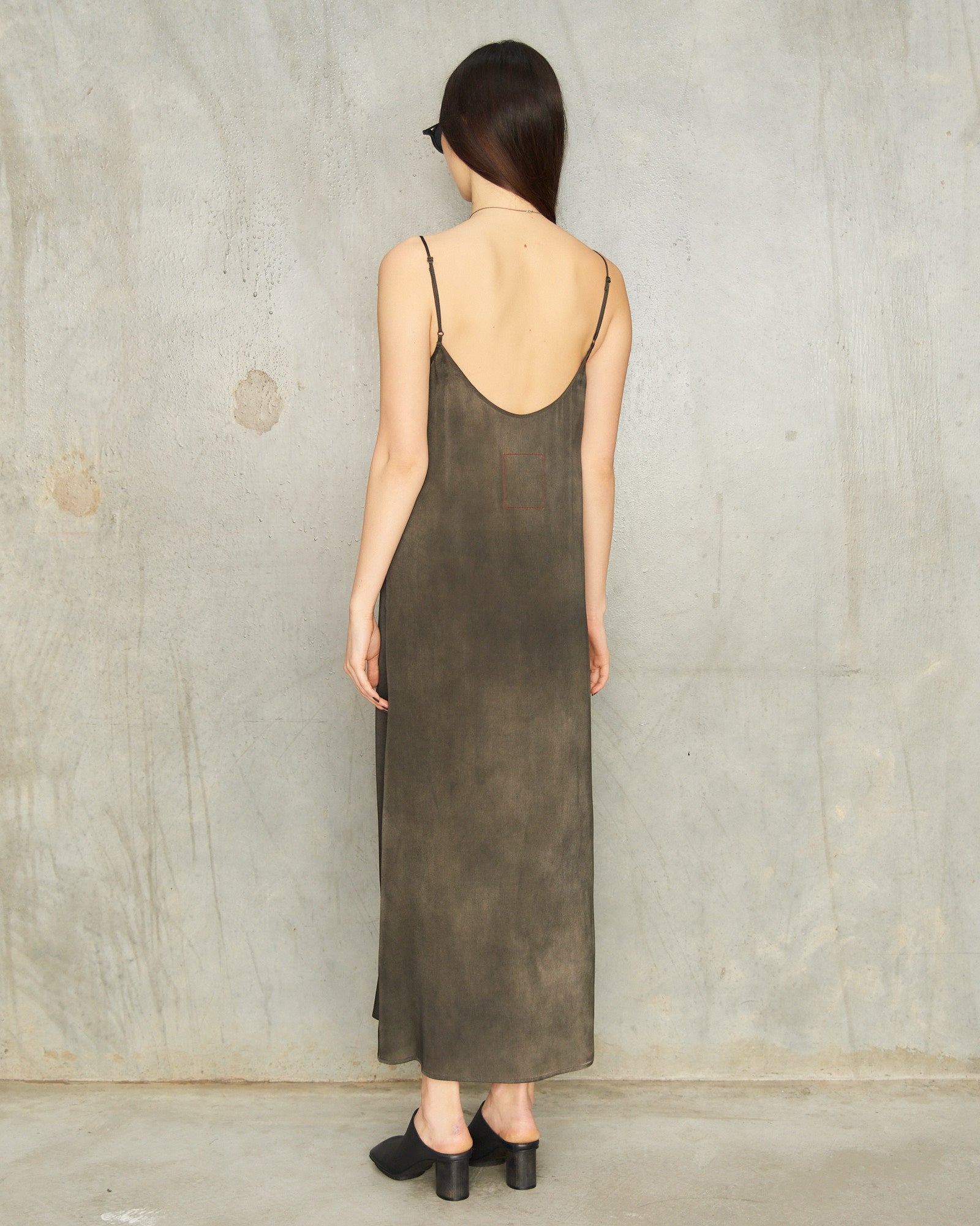 Anaya dress by Uma Wang in dark grey. Signature slip dress in a luxuriously fluid silk blend, subtly dyed across its draped surface. Finished with a straight flowing hem and adjustable shoulder straps for effortless elegance.