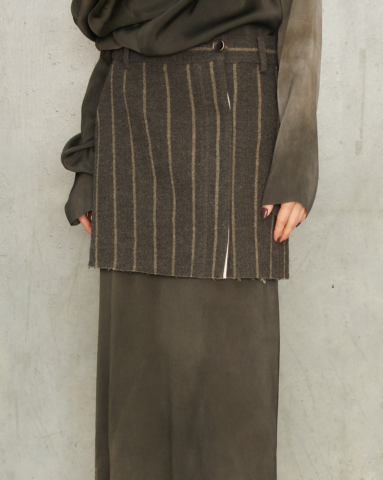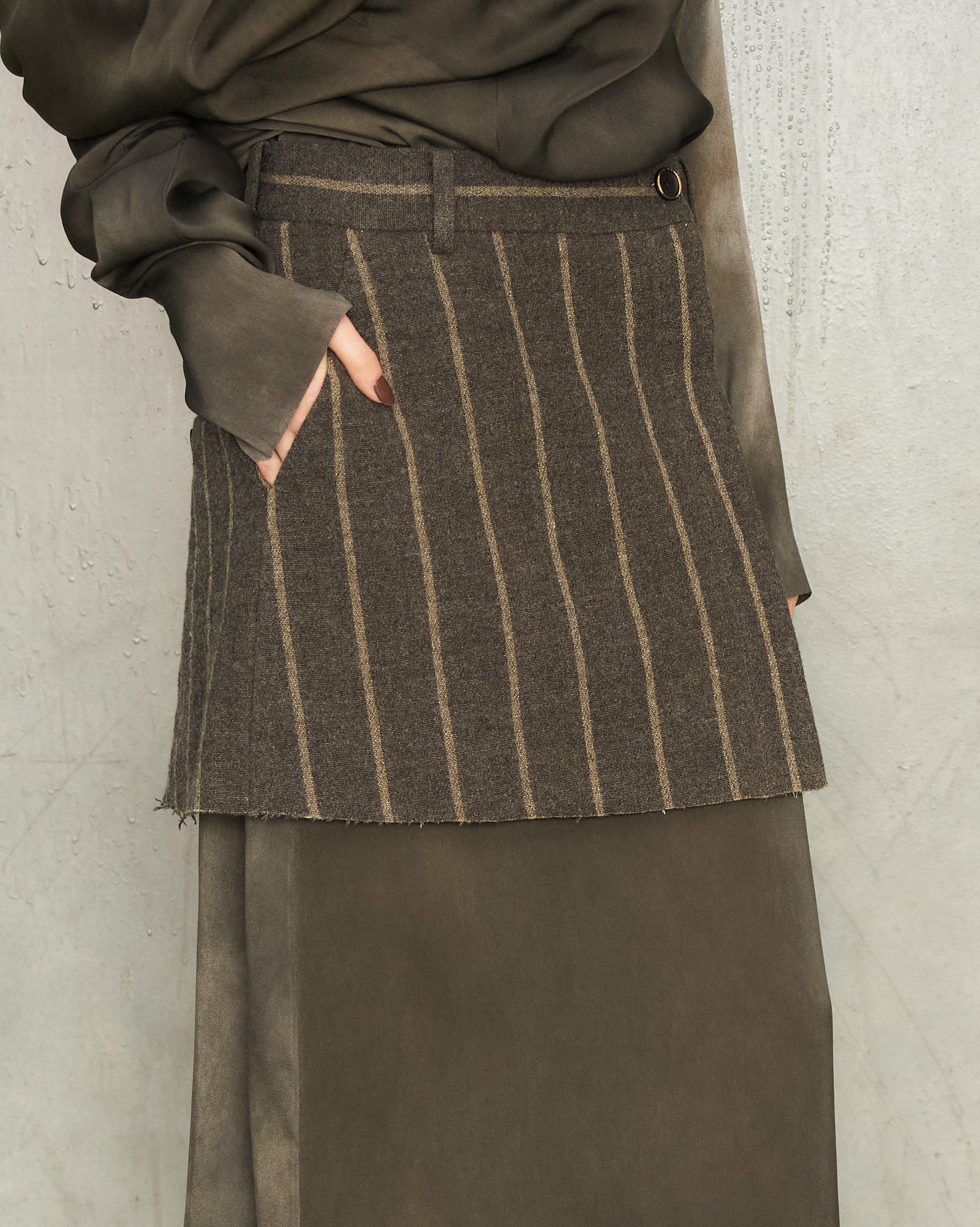Tropical skirt by Uma Wang in grey stripe. Mini skirt in a rustic wool-linen blend, featuring tonal stripes and rear welt pockets for a tailored finish. Cut-off length and raw hem lend an artisanal, hand-crafted touch. Cotton lining.