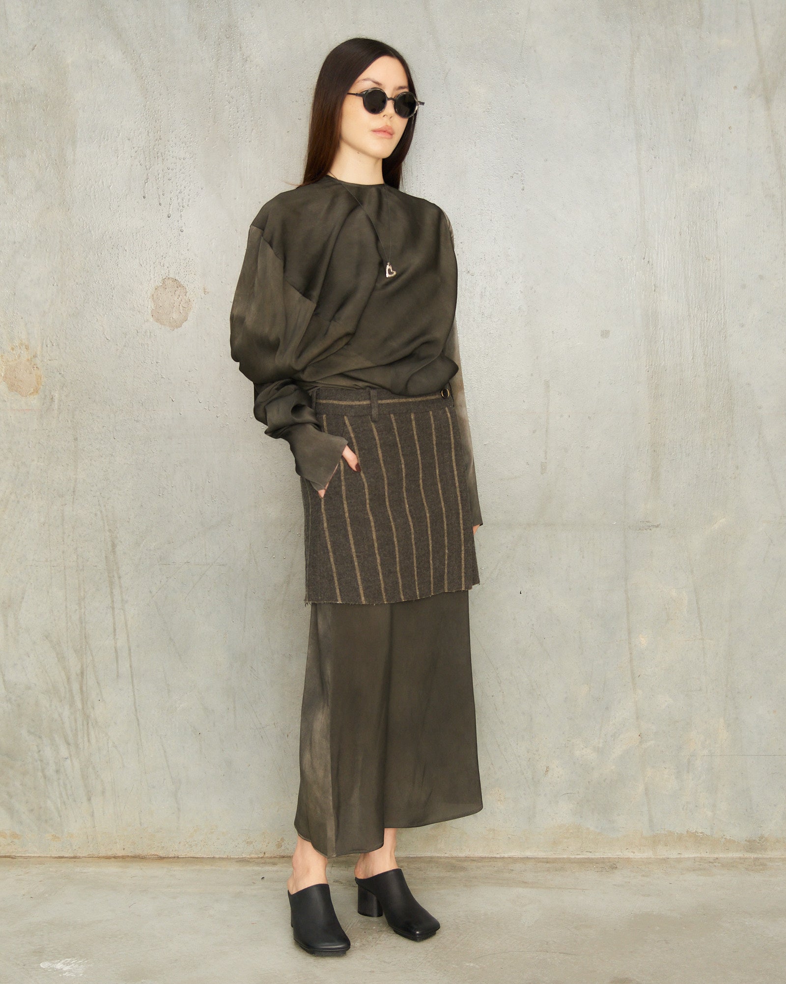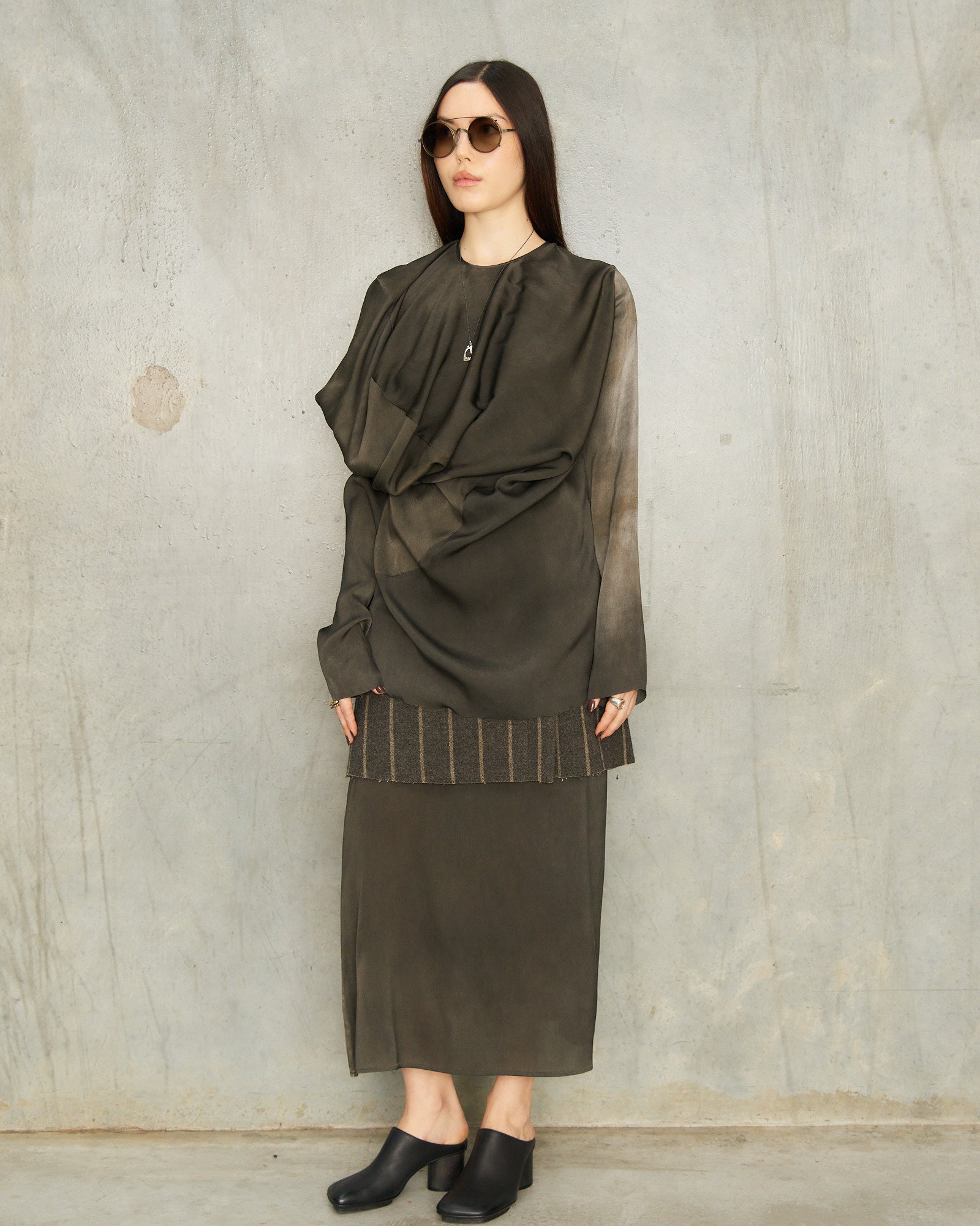 Pictured with Dark Grey Tavella Trek Top, Dark Grey Anaya Dress, Black Twist Sunglasses and Black Stone Mules by Uma Wang.