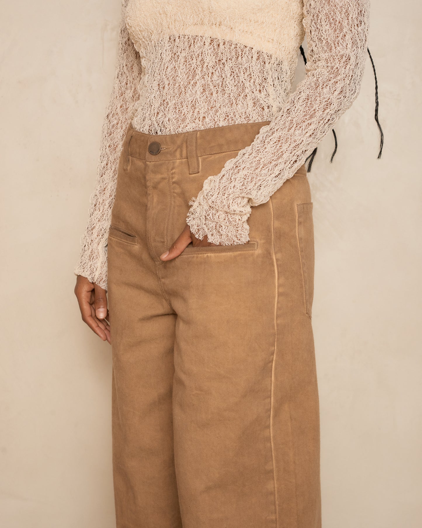 Ball pants by Uma Wang in rose. Wide-leg trousers crafyed from cotton twill and garment dyed to create subtle variations in tone, adding depth to the rosy hue. Featuring welt pockets that defy convention beneath a high fitted waist, this casually sophisticated style is fastened by a studded fly.